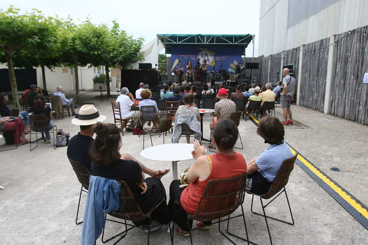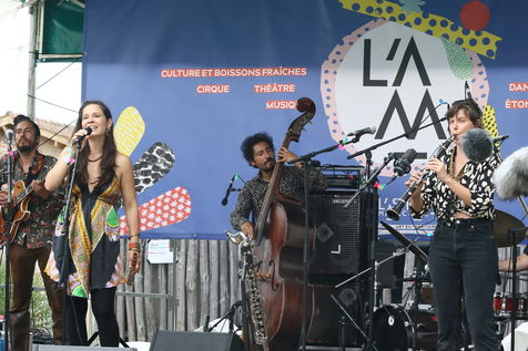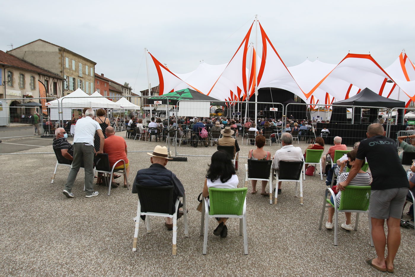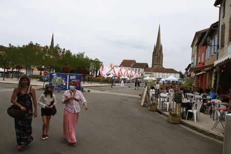 Marciac, France, 2021-07-27. Festival-goers around the main square attend the Festival off in the village square of Marciac.
