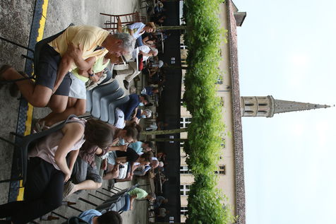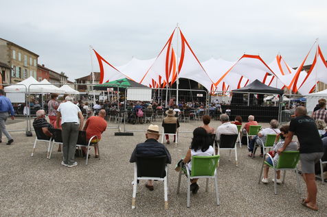 Marciac, France, 2021-07-27. Festivaliers autour de la place principale assistent au Festival off sur la place village de Marciac.