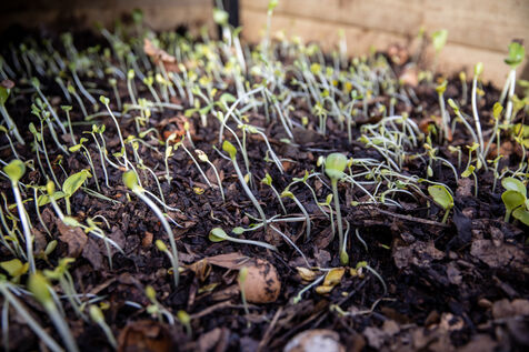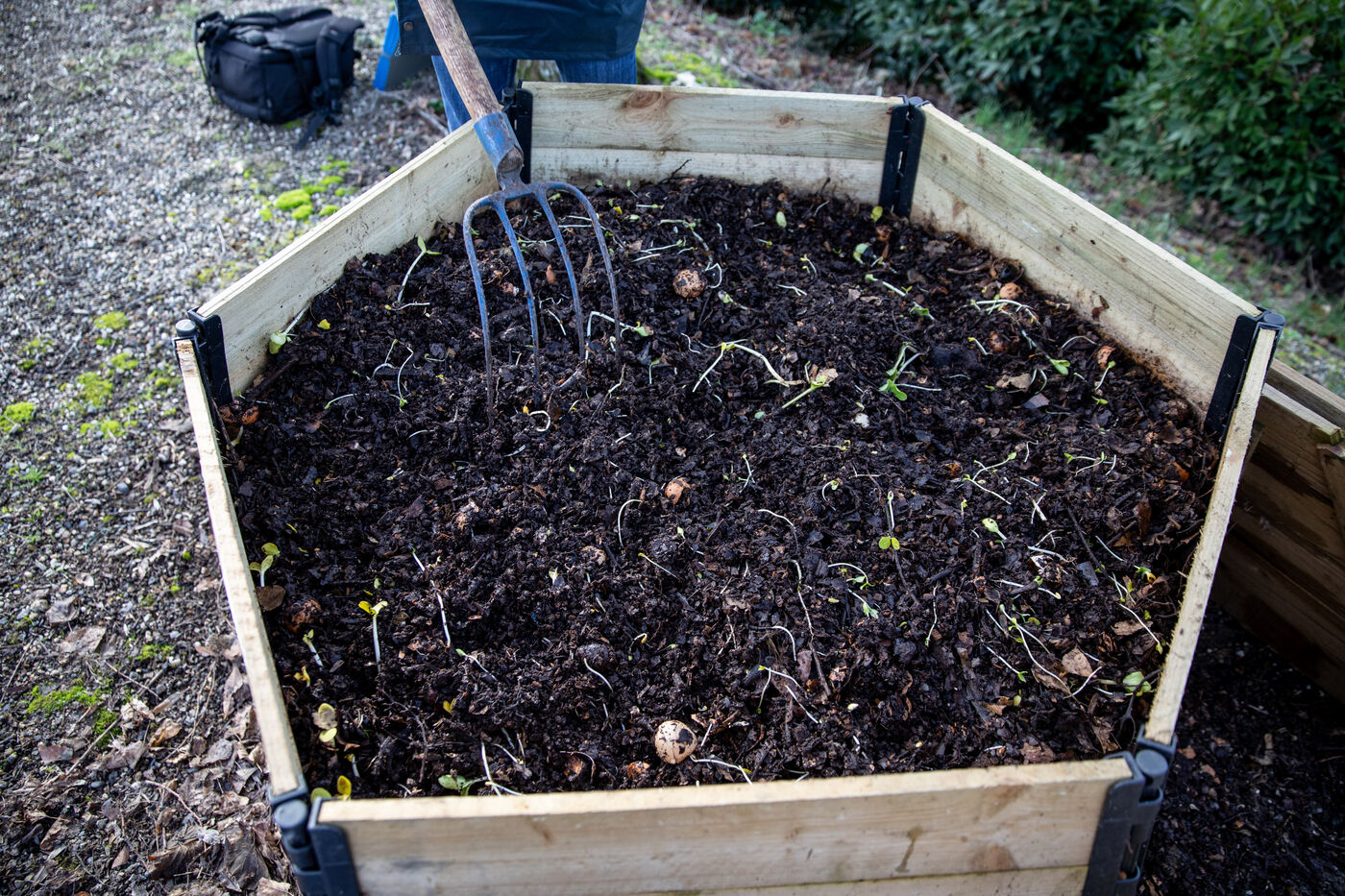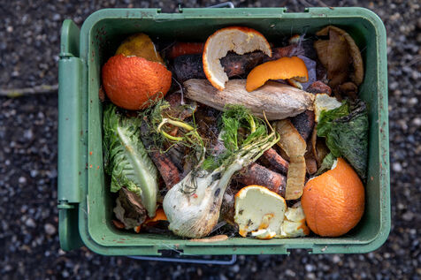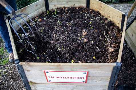 Organic waste consisting of carrot peels, banana peels or eggshells and other food waste deposited in one of the composters at the Terraube collective composting area.