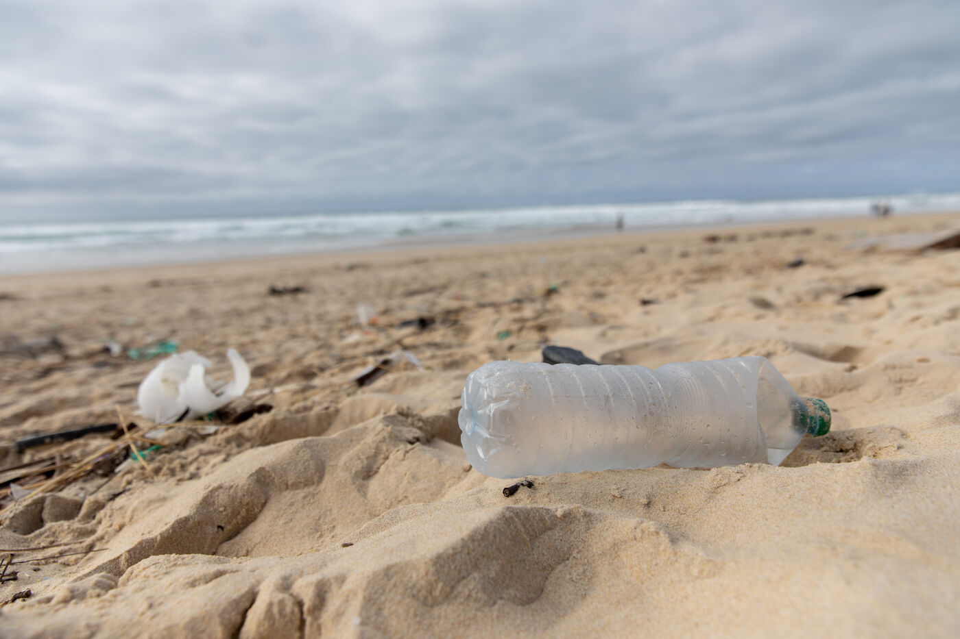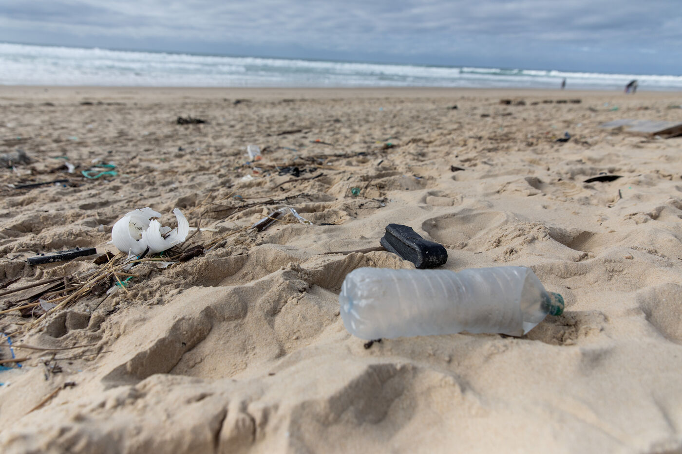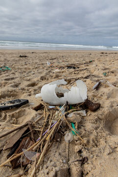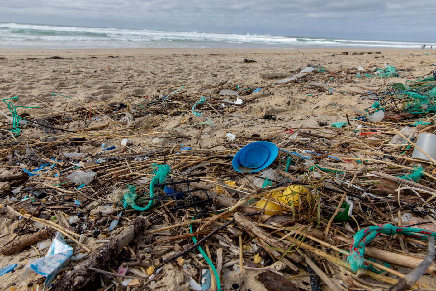Mimizan plage, France, 2024-02-19. Dozens of pieces of plastic waste washed up by the ocean on a beach at Mimizan Plage. Plastic pollution from human waste affects the entire marine ecosystem and oceans. Photography by Sebastien Lapeyrere.