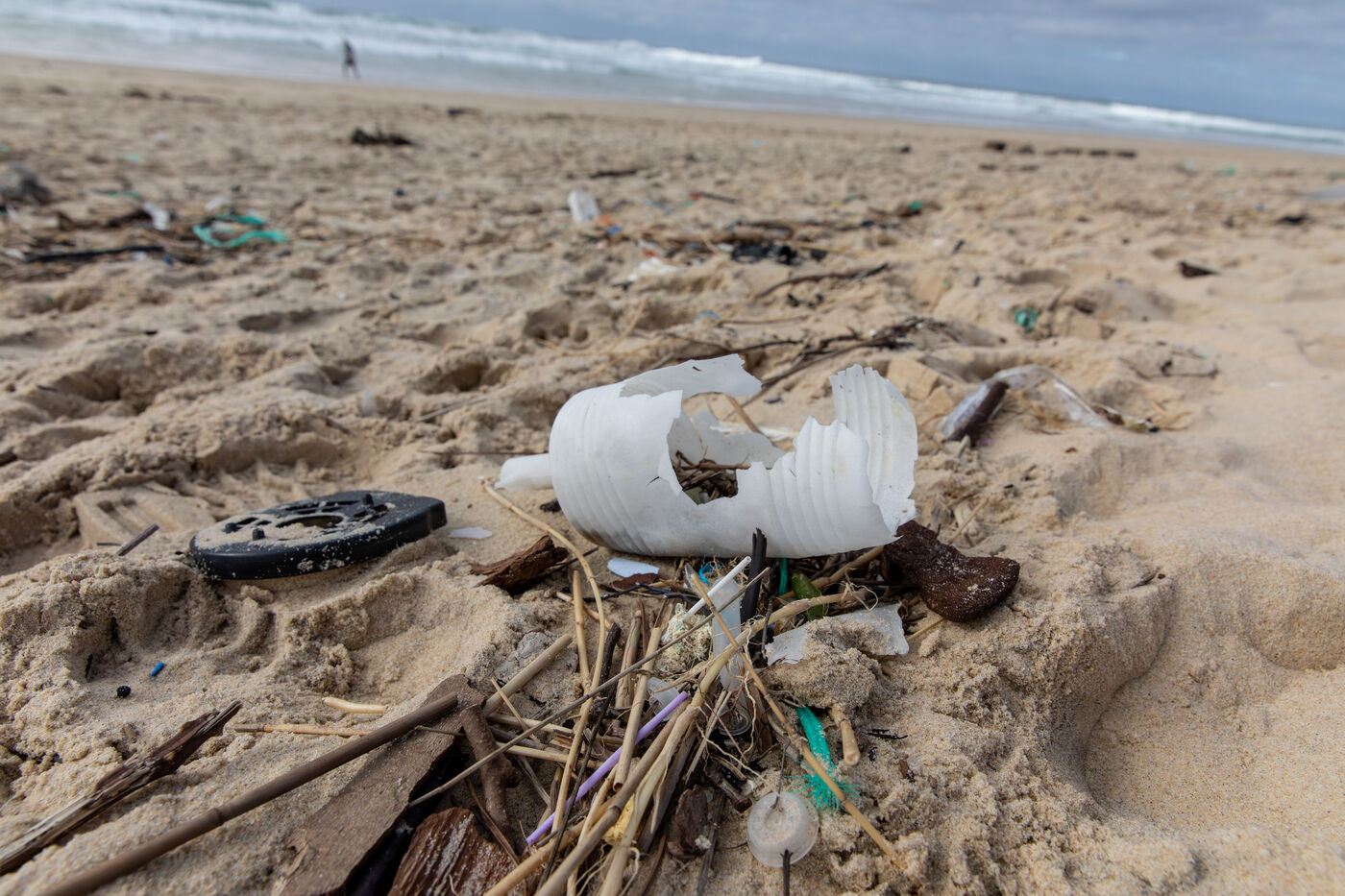 Mimizan plage, France, 2024-02-19. Des dizaines de morceaux de dechets en plastique a ete rejete par l ocean sur une plage de Mimizan Plage. La pollution plastique en gendre par les dechets des humains affecte l ensemble de l ecosysteme marins et des oceans. Photographie par Sebastien Lapeyrere.