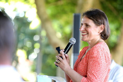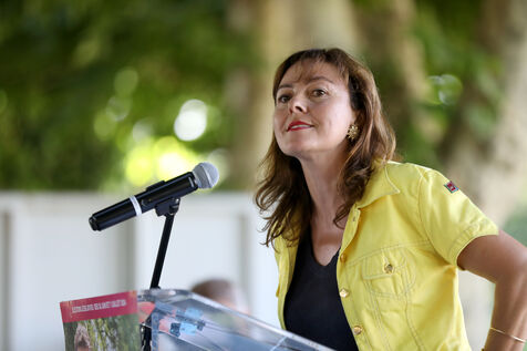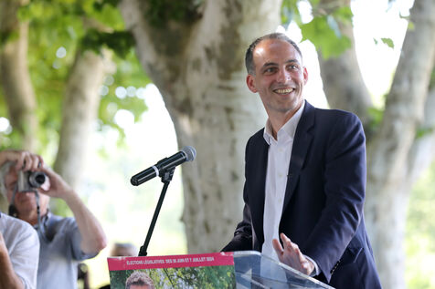 Negreplisse, France, 2024-06-24. Valérie Rabault député sortante (PS - Nouveau Front de Gauche) de la 1ere circonscription du Tarn-et-Garonne accompagné par Raphael Glucksmann député europeen lors d'un meeting de Valérie Rabault dans sa circonscription pour les élections législatives anticipée de 2024 à Negreplisse . Photographie par Sébastien Lapeyrère.