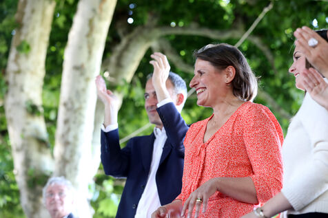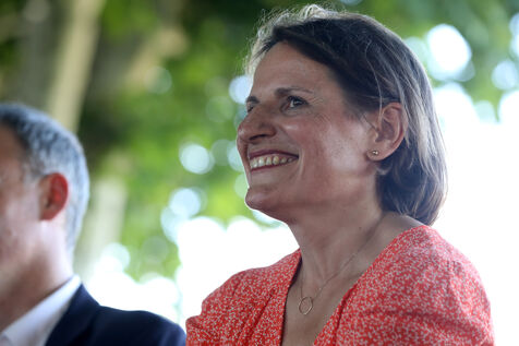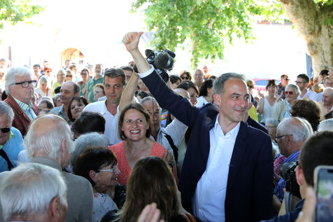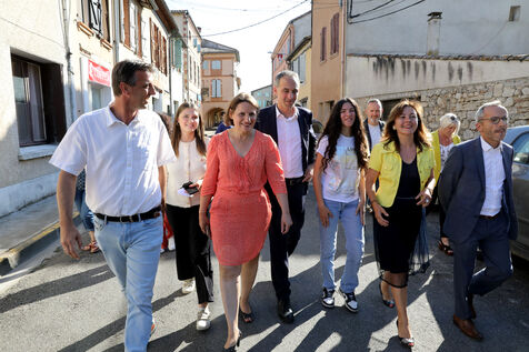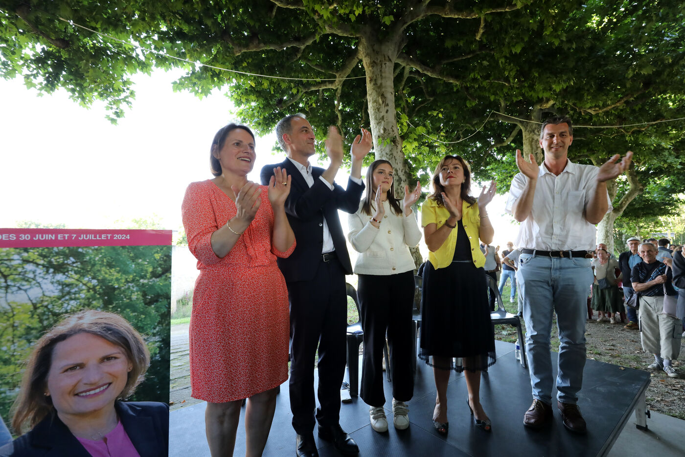 Negreplisse, France, 2024-06-24. Valerie Rabault ( Pink dress ) outgoing deputy (PS - Nouveau Front de Gauche) for the 1st constituency of Tarn-et-Garonne accompanied by Raphael Glucksmann European deputy at a meeting of Valerie Rabault in her constituency for the 2024 early legislative elections in Negreplisse . Photography by Sebastien Lapeyrere.