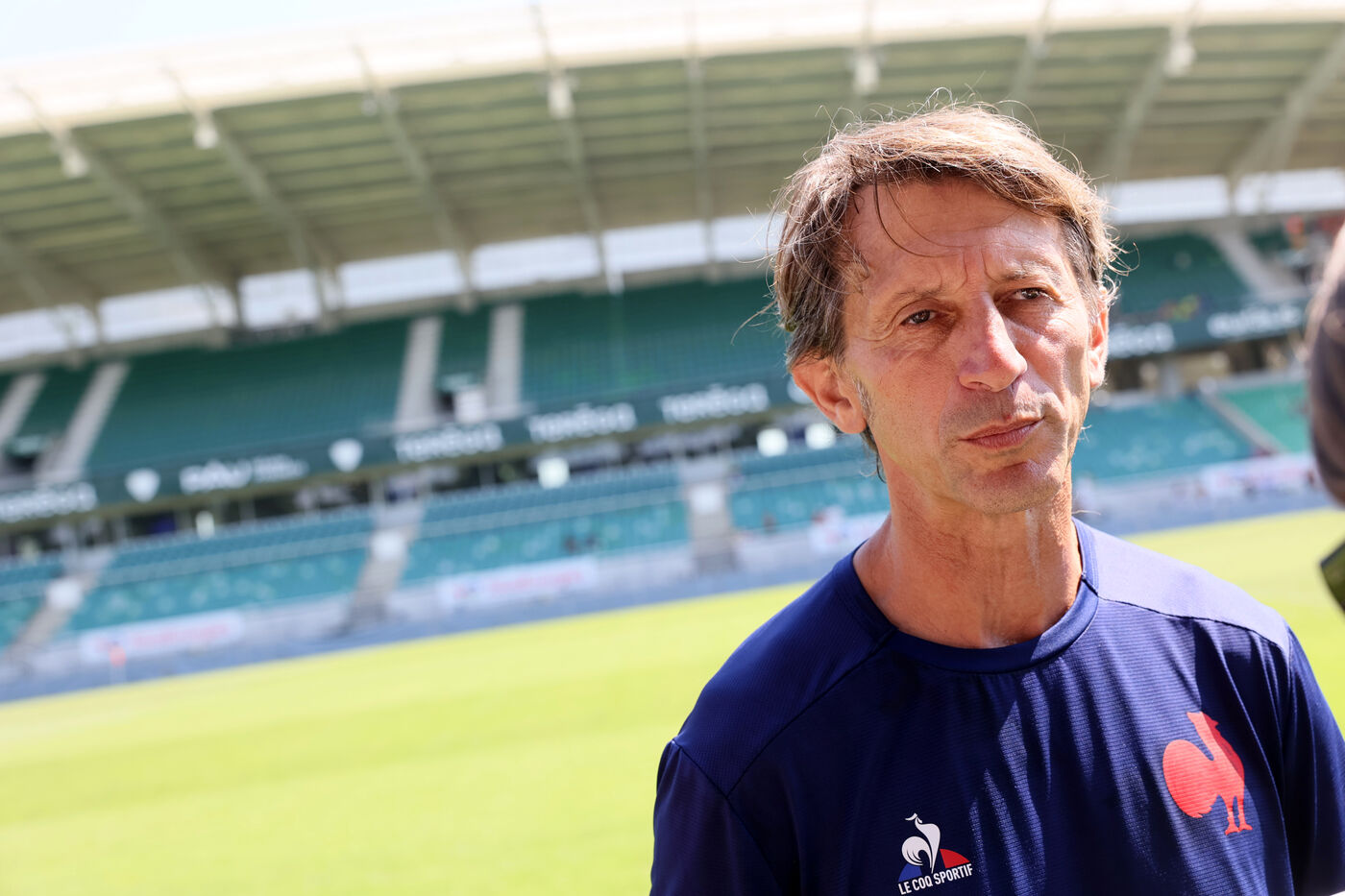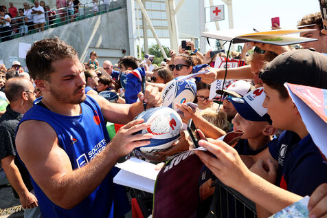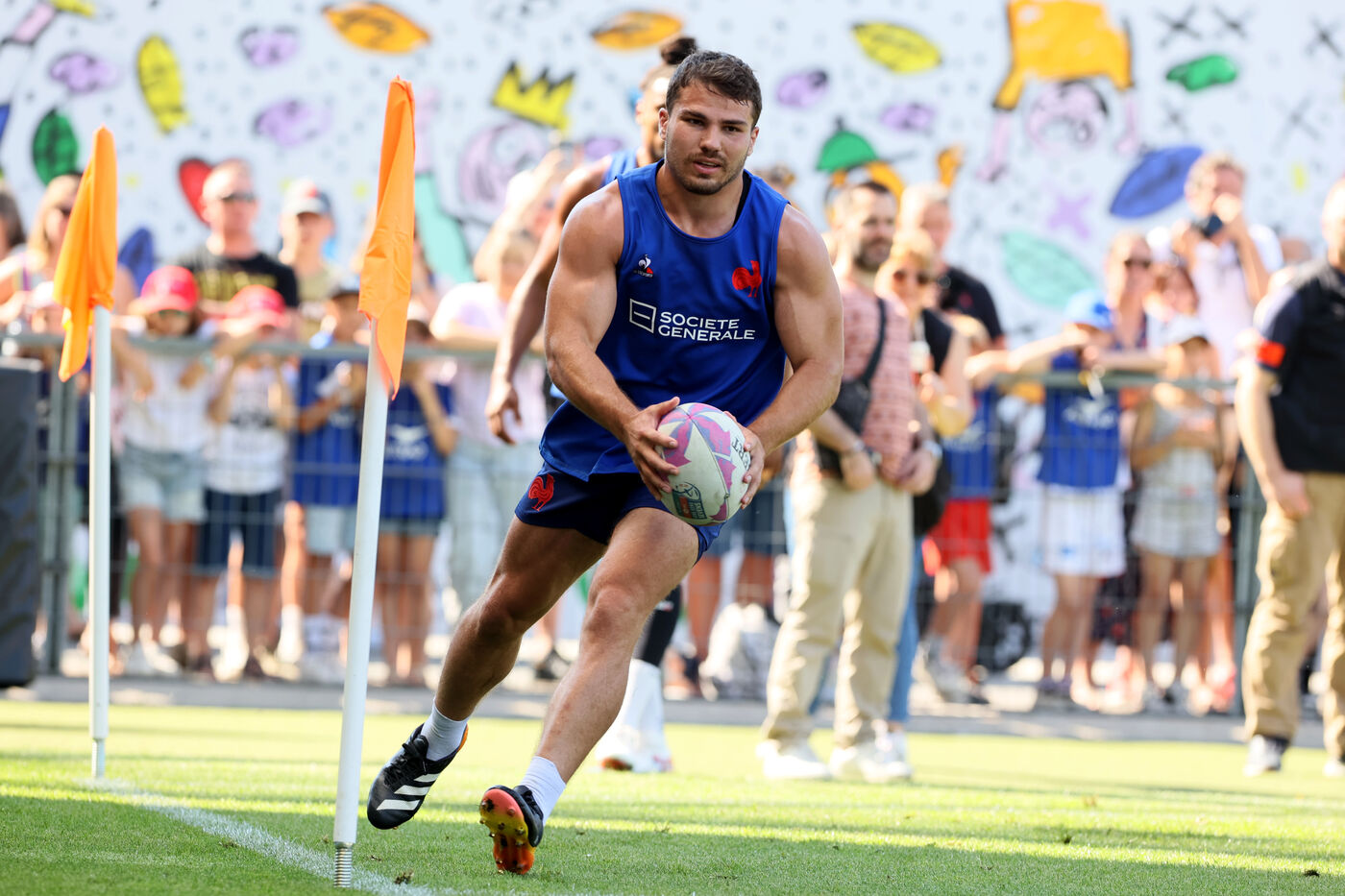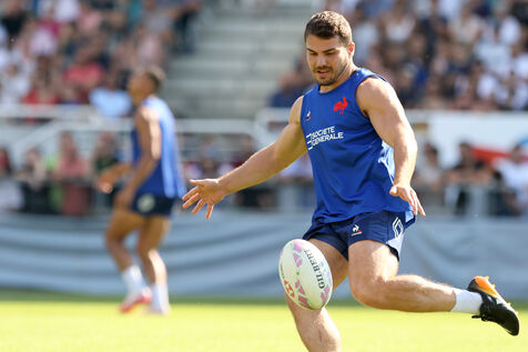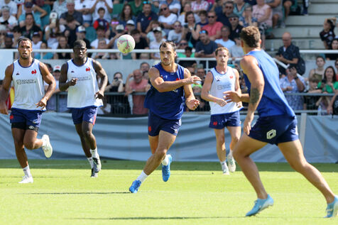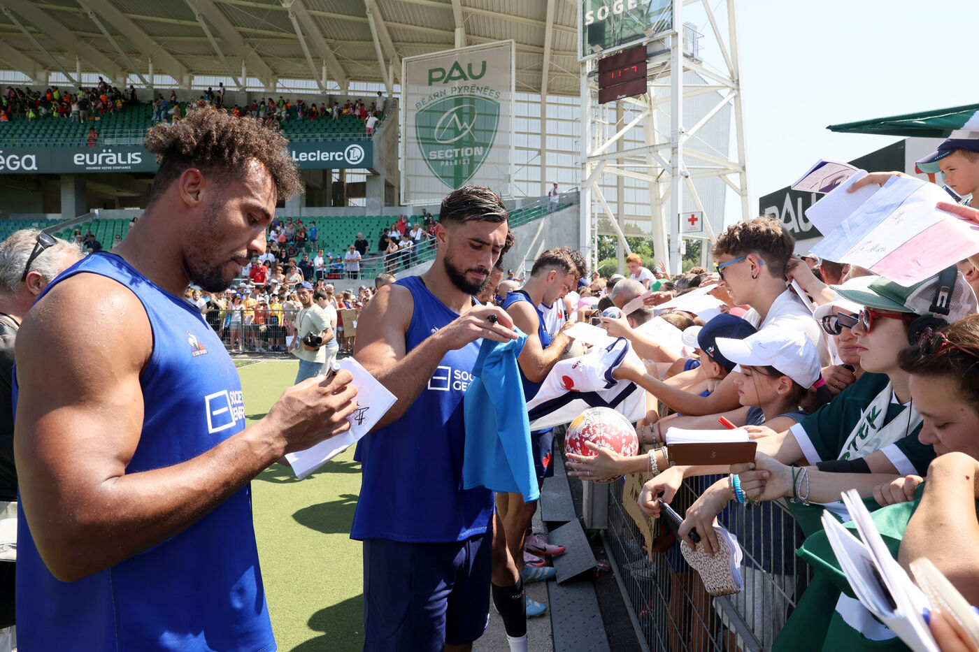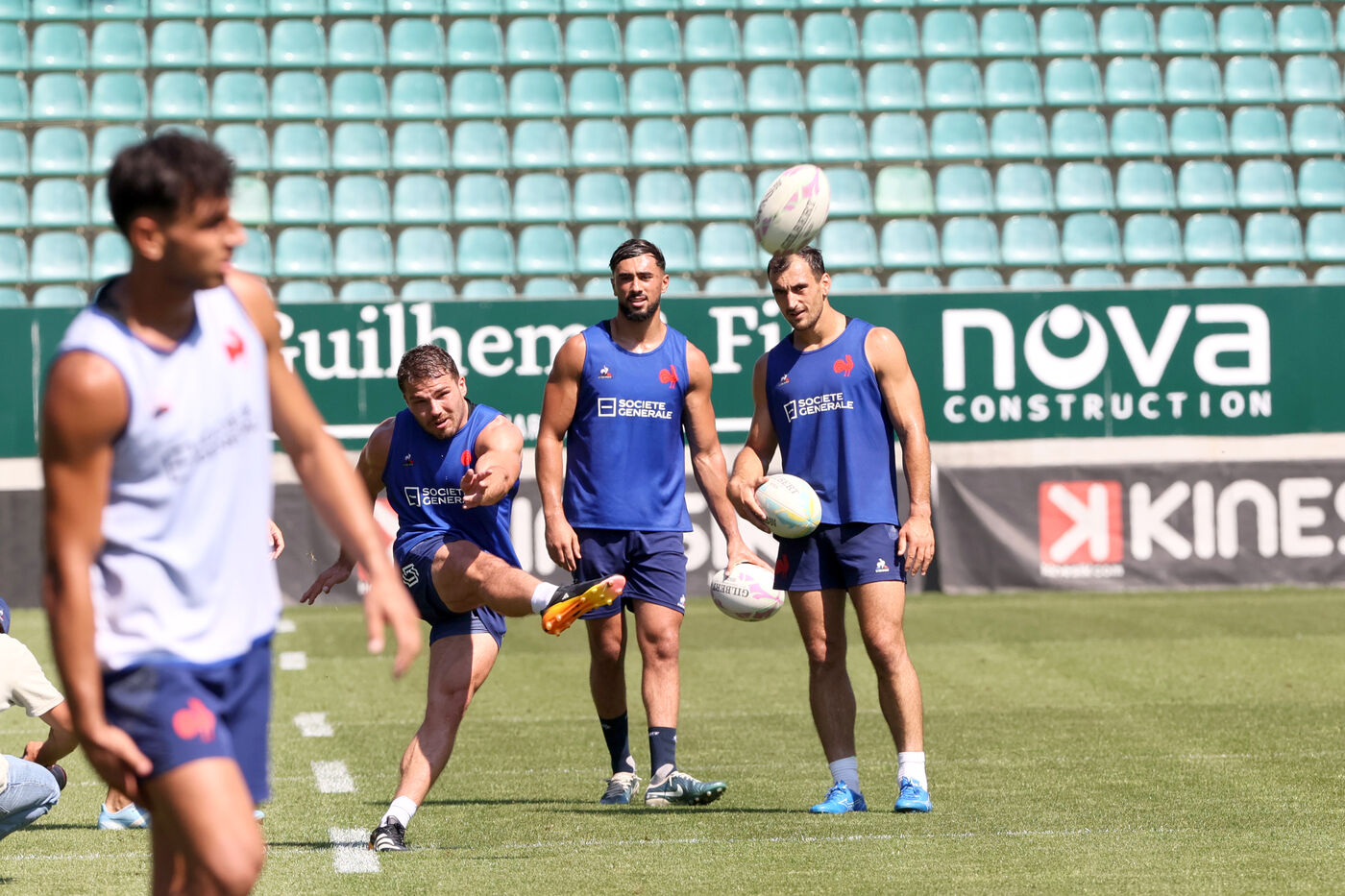 Pau, France, 2024-07-11. Séance d'entraînement au stade du Hameau à Pau pour les joueurs de l' équipe de France de rugby à 7 lors du stage de préparation avant les Jeux olympiques de Paris 2024 .Photographie par Sebastien Lapeyrere.