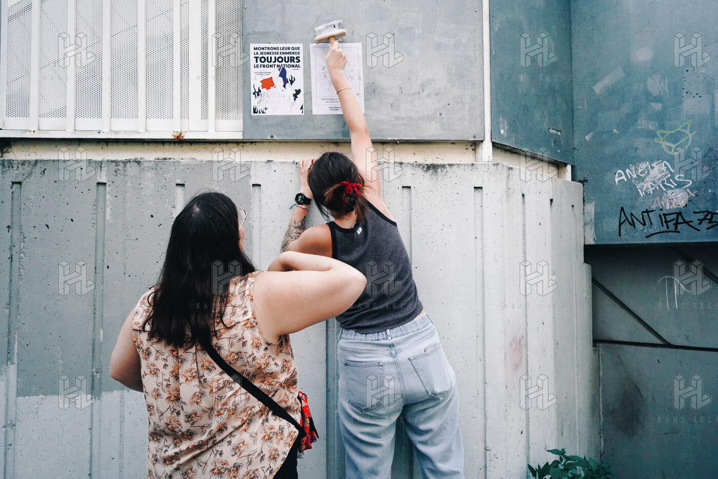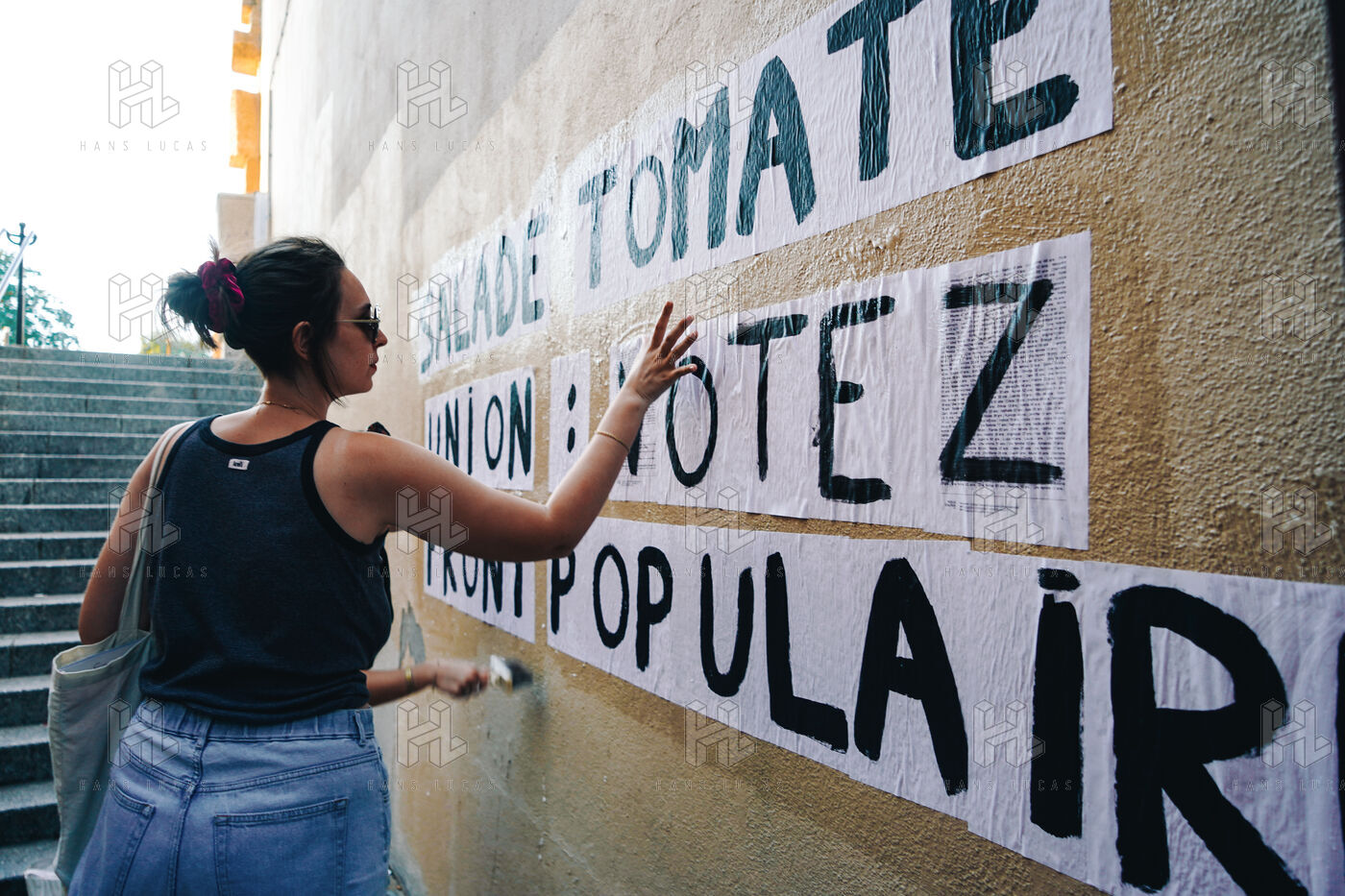 A few days before the legislative elections on 30 June 2024, activists from the feminist collective Nous Toutes distributed leaflets at the metro exit. In the evening, they put up collages in the 12th arrondissement of Paris. This action aimed to support the New Popular Front (Nouveau Front populaire), a coalition recently formed to oppose the RN and the presidential majority parties.