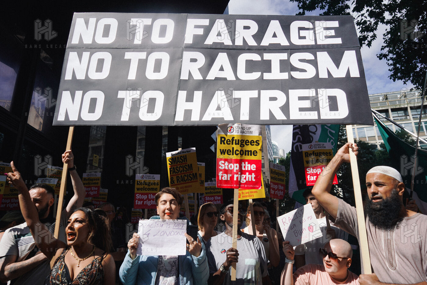 En réponse aux émeutes anti-immigration qui se sont déroulées à travers le Royaume-Uni, des manifestants antiracistes se sont rassemblés devant le siège de Reform UK à Londres. Organisé par Stand Up To Racism, le rassemblement a eu lieu après une série de manifestations racistes provoquées par de fausses rumeurs liant le meurtre de trois enfants à Southport, en Angleterre, à un demandeur d'asile.