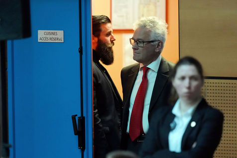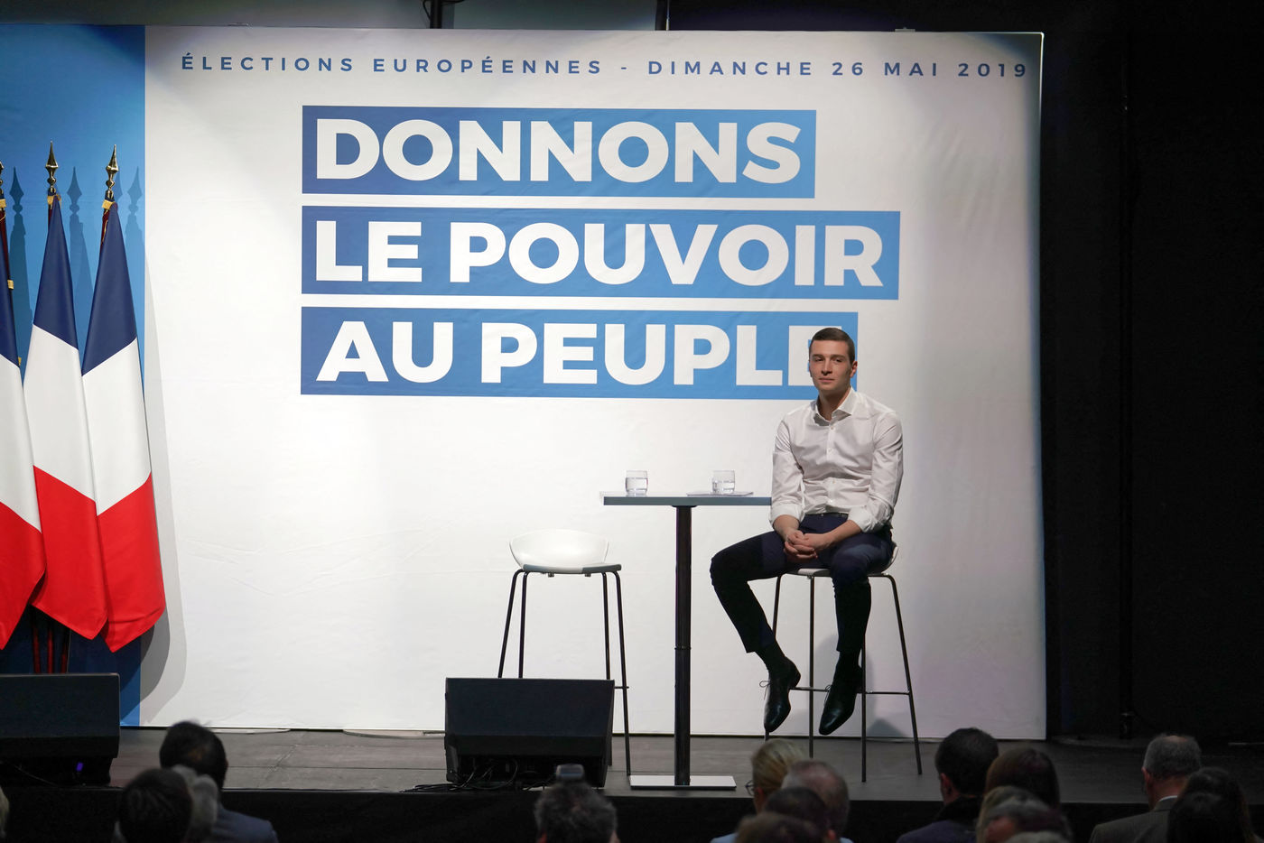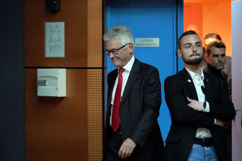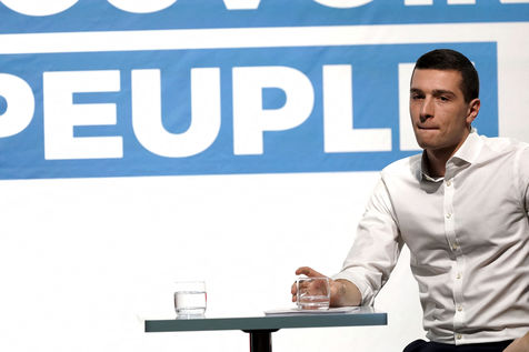 Meeting du RN en presence de Jordan Bardella, tete de liste pour le RN aux elections europeennes de 2019, et Herve Juvin, candidat, dans la salle des fetes de Caudry dans le Nord de la France, le 24 Fevrier 2019.