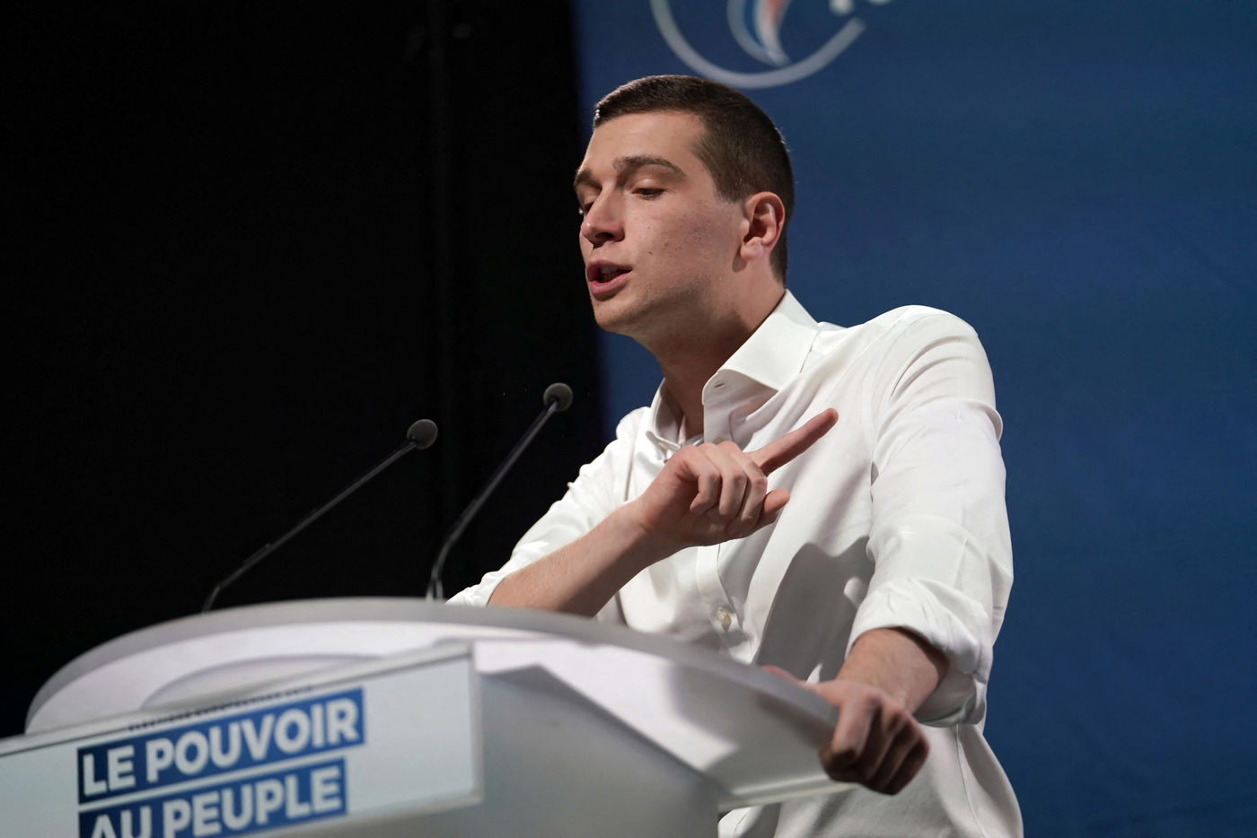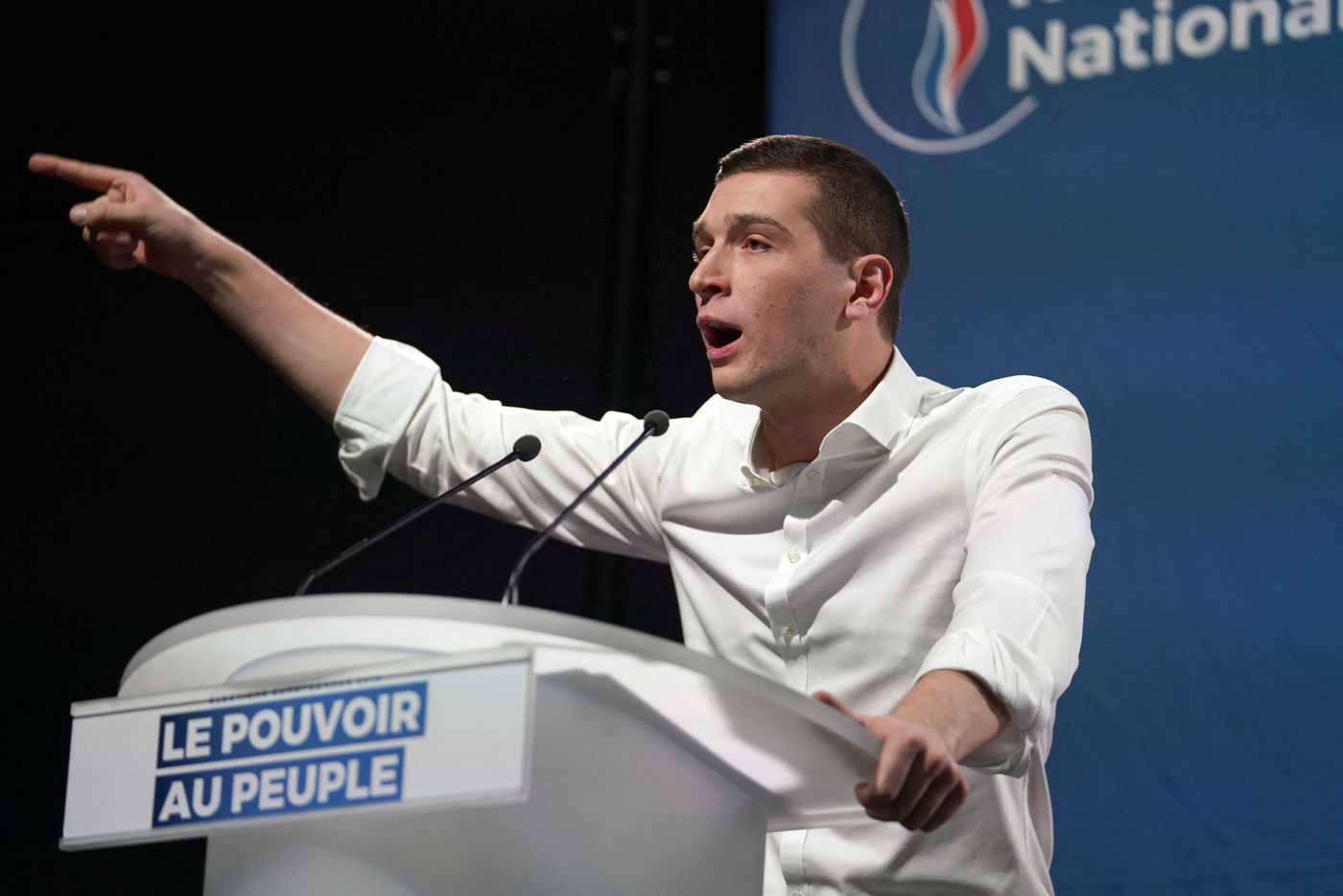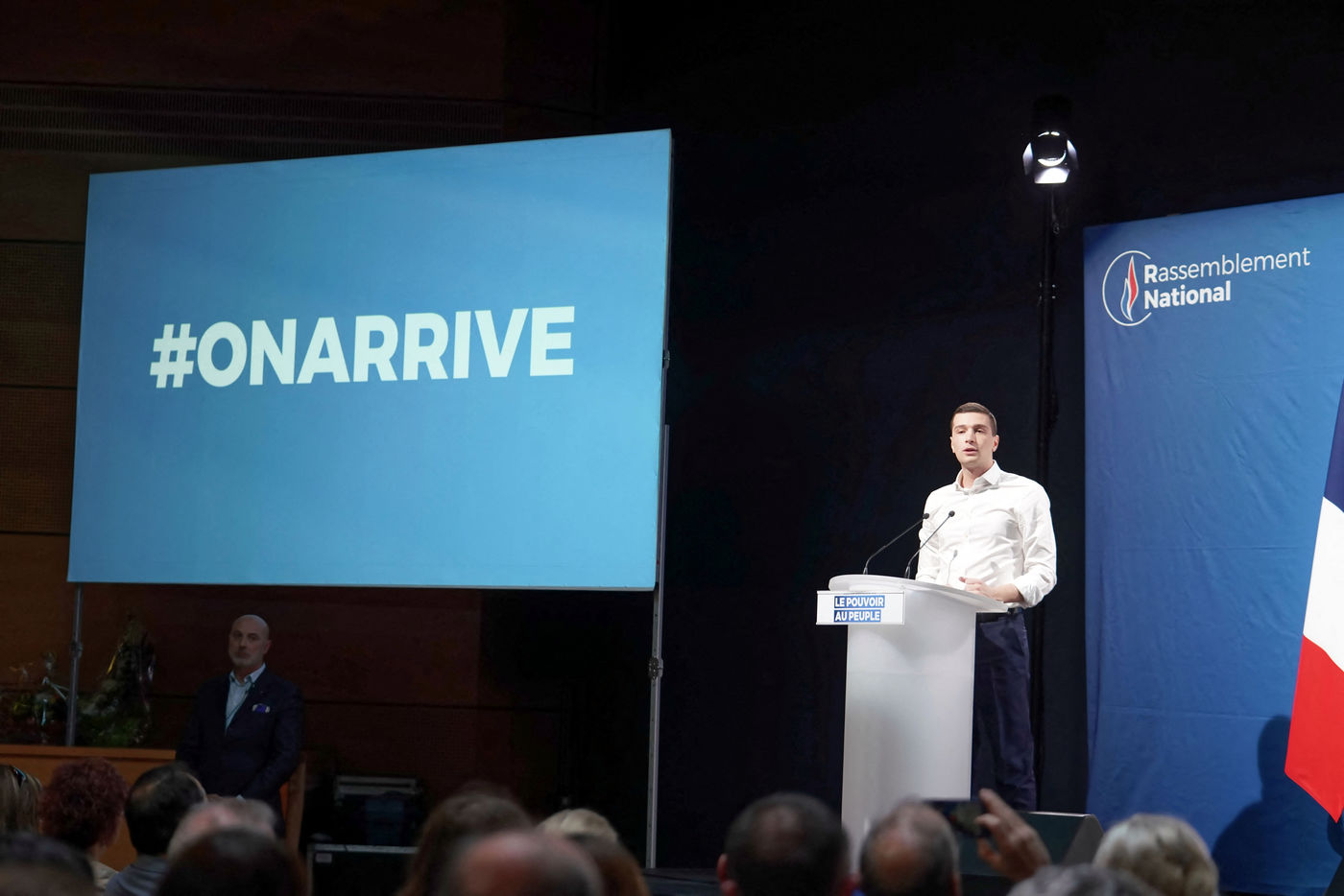 National Rally (RN), french far-right party of Marine Le Pen, meeting in Caudry (Northern France) with Marine Le Pen, Jordan Bardella, head of list, and Herve Juvin, candidate, for European Elections