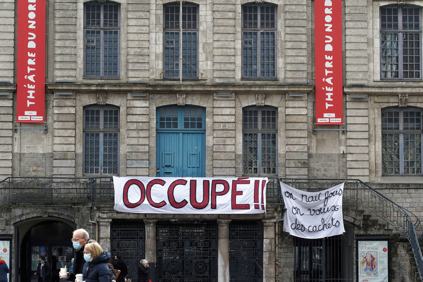 A banner displayed by culture workers occupying the Theatre du Nord in Lille, France, on March 13, 2021, to demand the reopening of cultural places and theatres, a year after the first closing measures to curb the spread of the Covid-19 (coronavirus) pandemic. They are following the example of the action at the Odeon Theatre in Paris, occupied since March 4 by cultural actors and workers who are demanding the reopening of cultural venues and a financial aid.