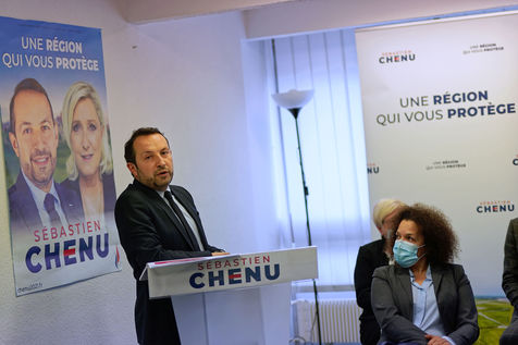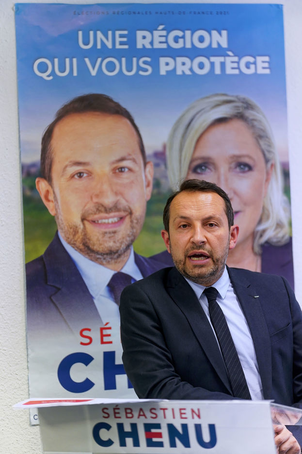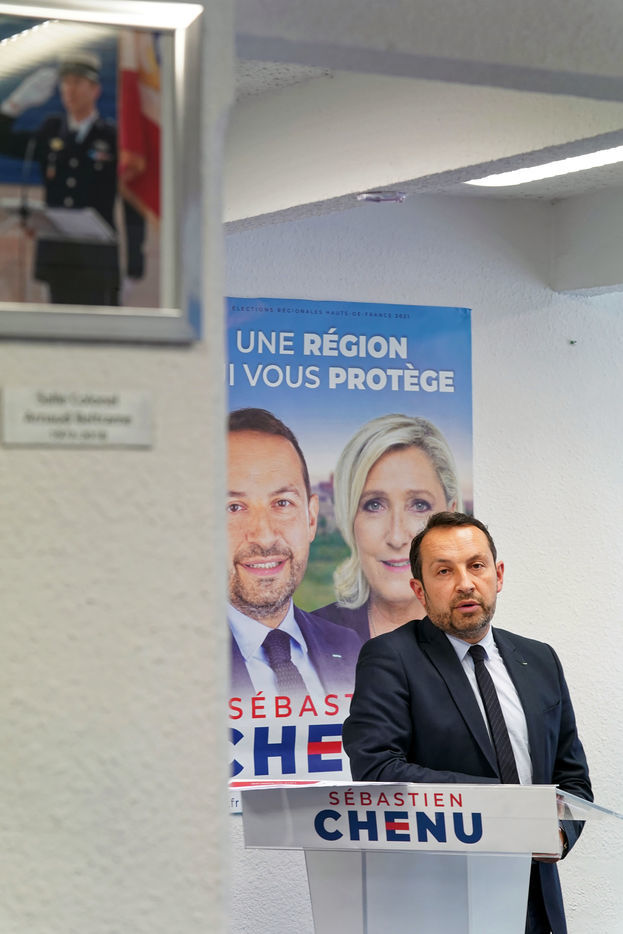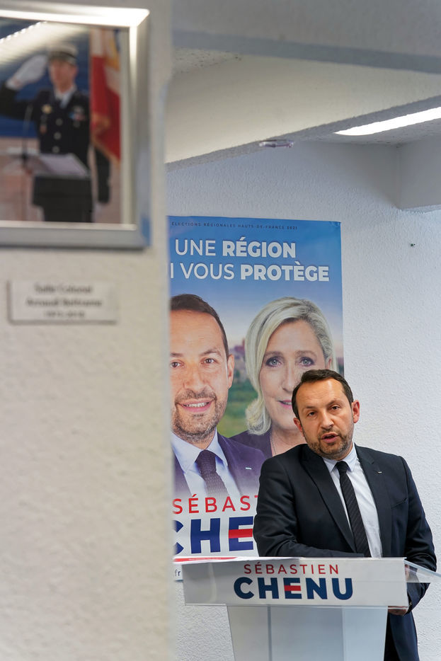 Member of Parliament, spokesman for the French far-right National Rally (Rassemblement National - RN) party and head of list for regional election in Hauts-de-France Sebastien Chenu attends a press conference to present members of list for upcoming election, in Lille, northern France, on May 06, 2021.