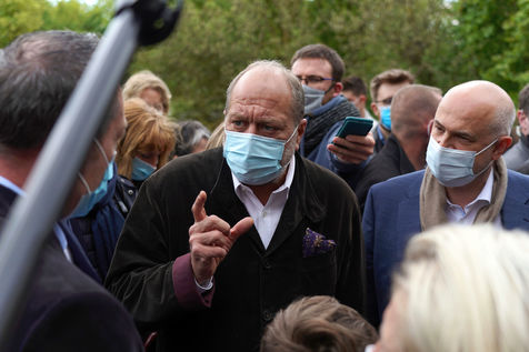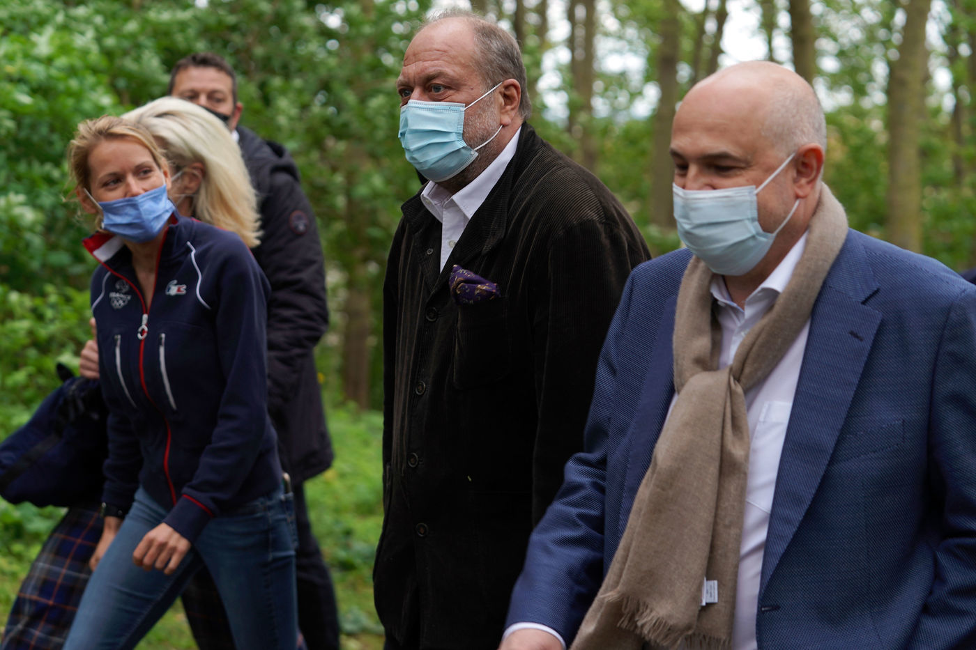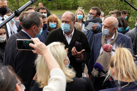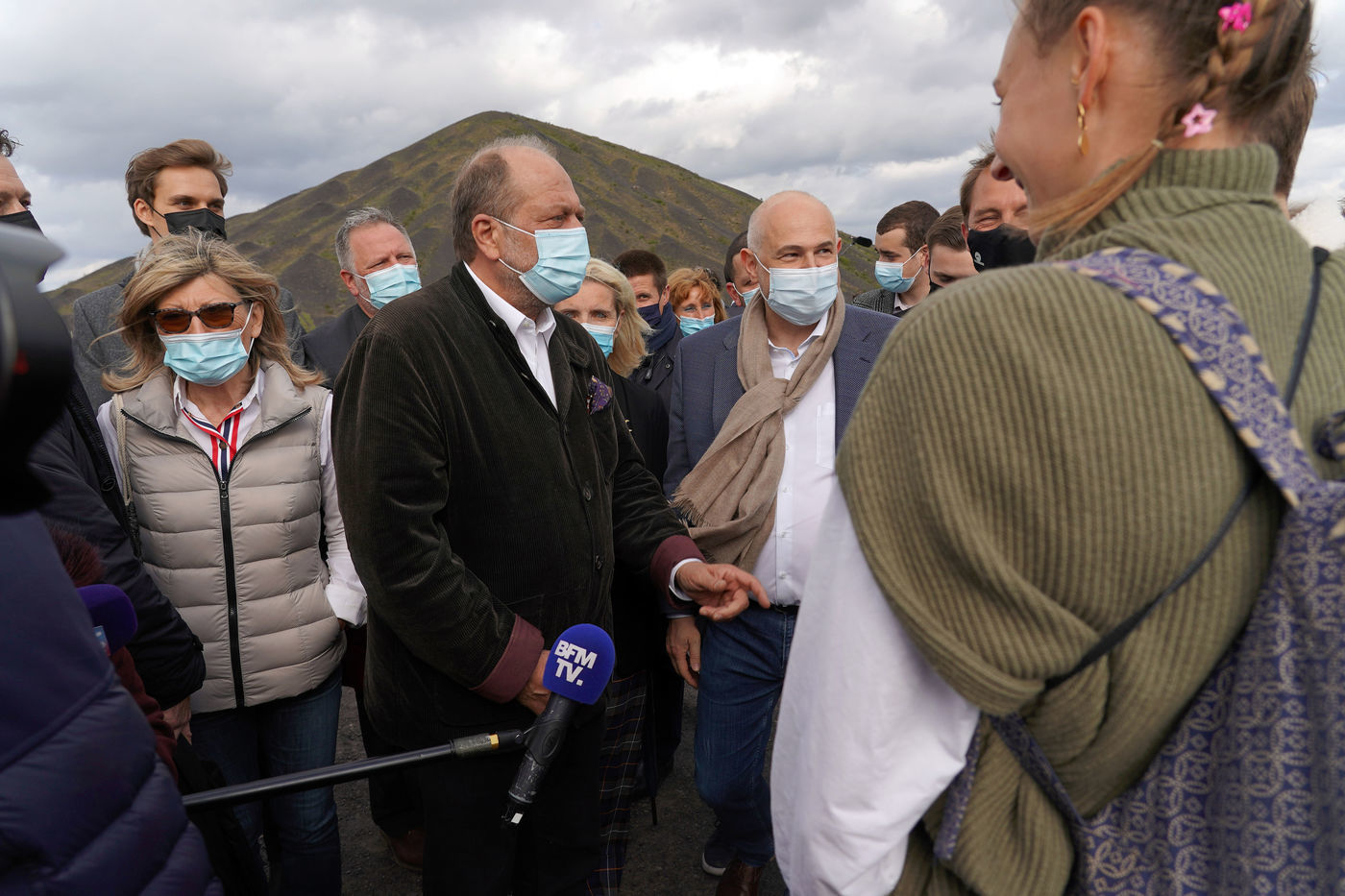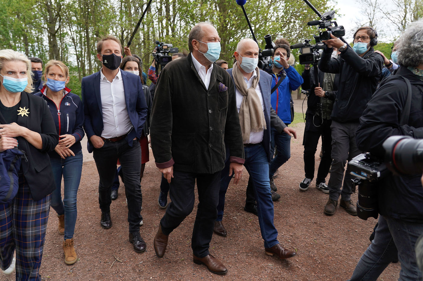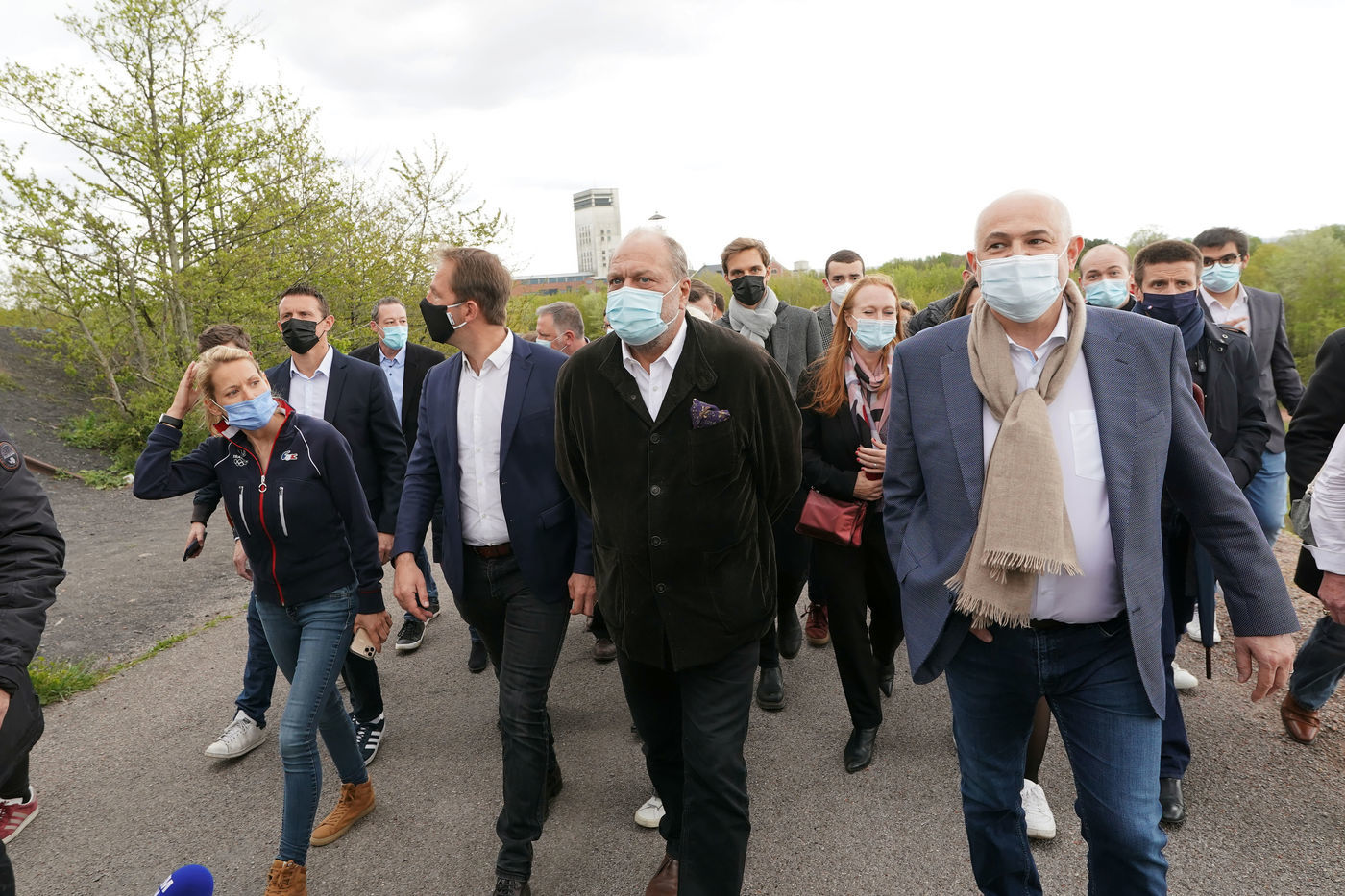 Eric Dupond-Moretti (LREM) en campagne a Loos-en-Gohelle, pres de Lens, Pas-de-Calais, France pour les prochaines elections regionales avec la tete de liste Laurent Pietraszewski, Thibaut Guilluy et Tiphaine Auziere (fille de Brigitte Macron) le 08 Mai 2021