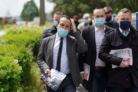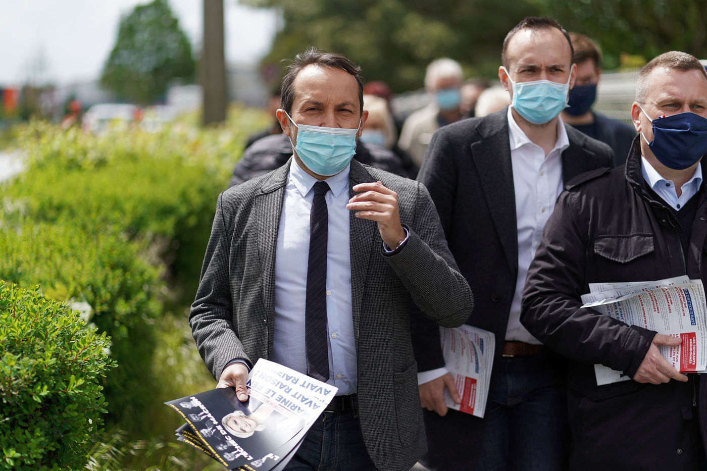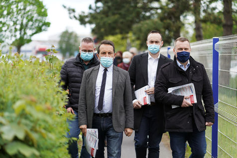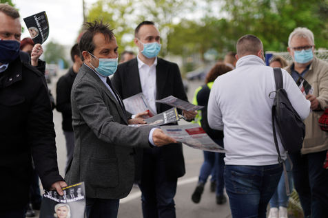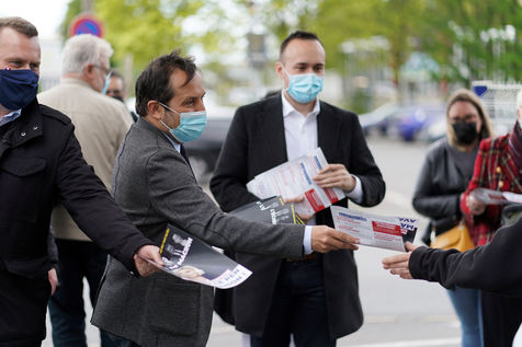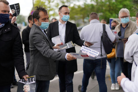 Far right party Rassemblement National (National Rally) candidate for upcoming regional election in northern France, Sebastien Chenu, campaigns in Henon-Beaumont, France, on May 21, 2021.
