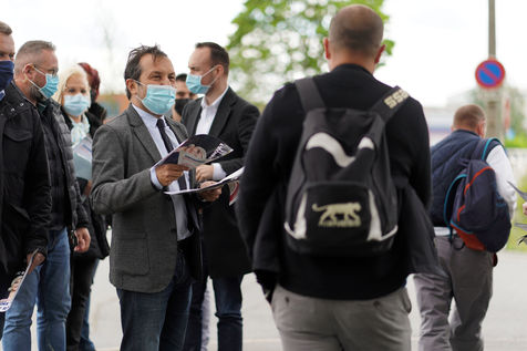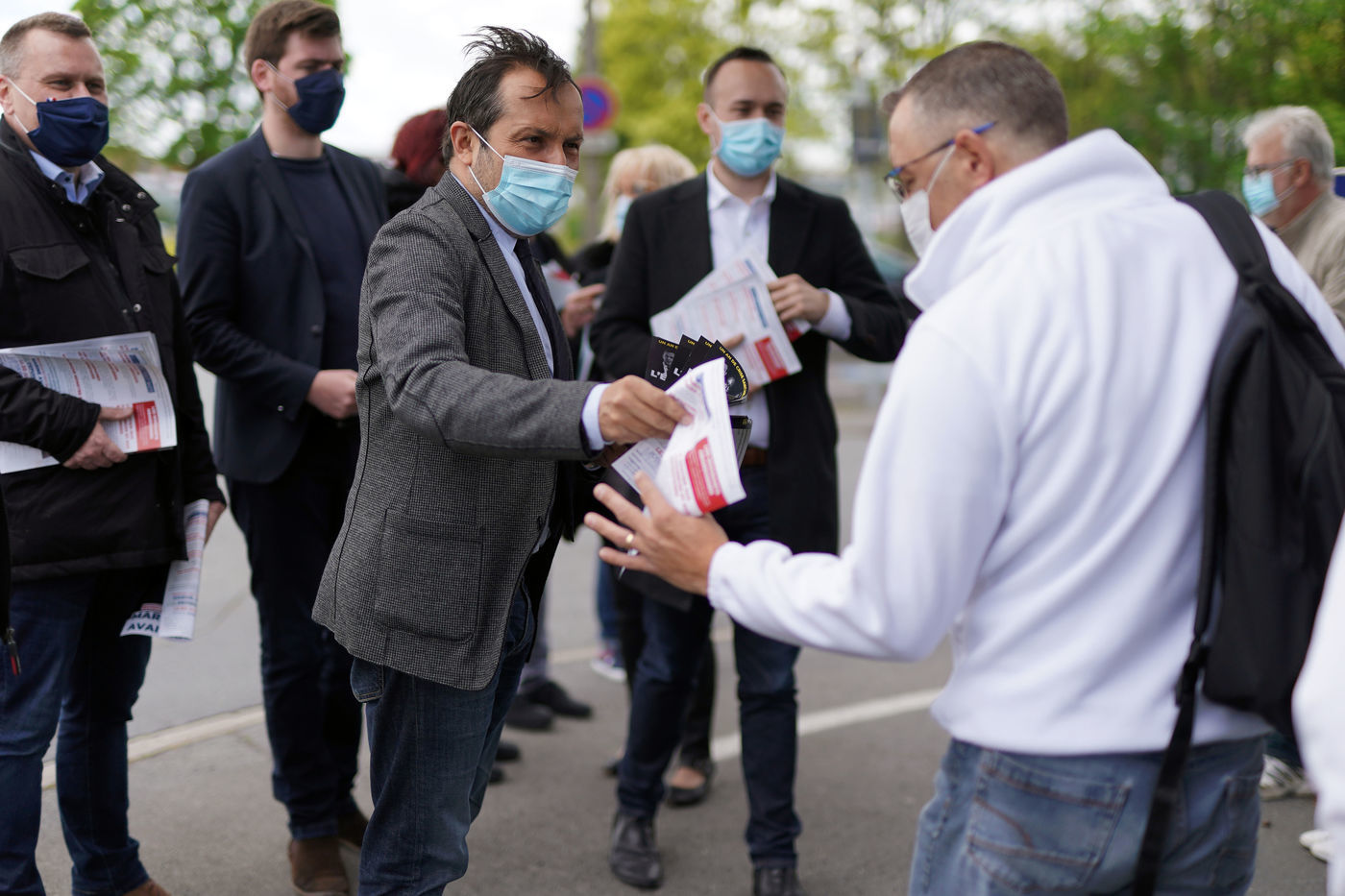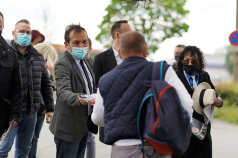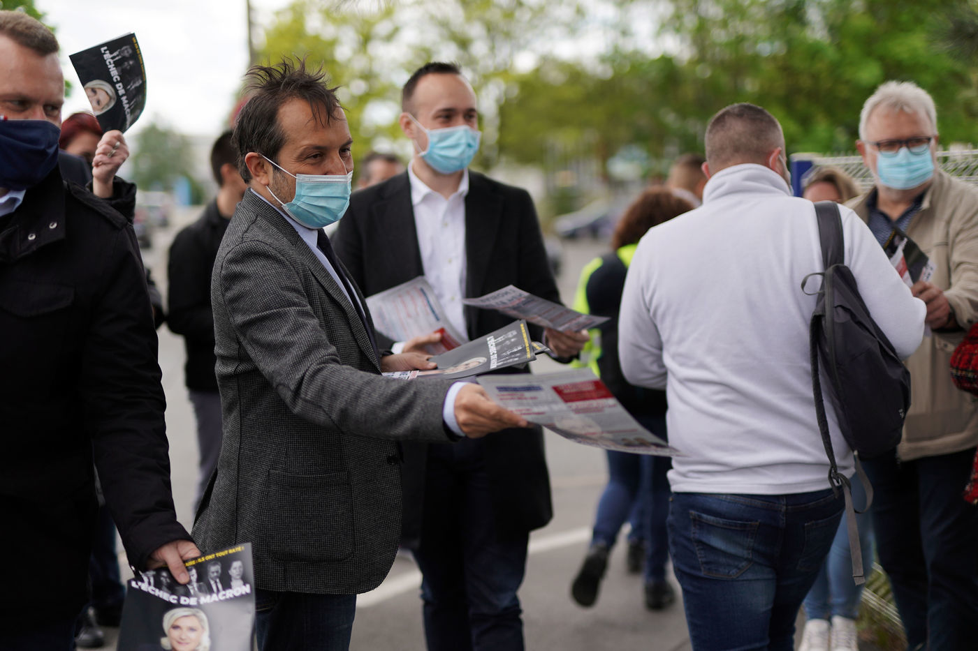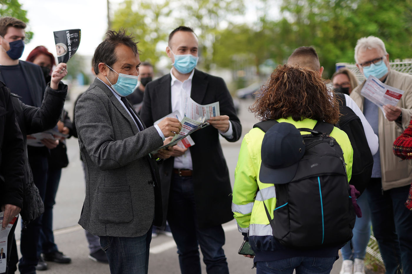 Sebastien Chenu (RN) en campagne pour les elections regionales tracte a la sortie d'une usine a Henon-Beaumont, France, le 21 Mai 2021