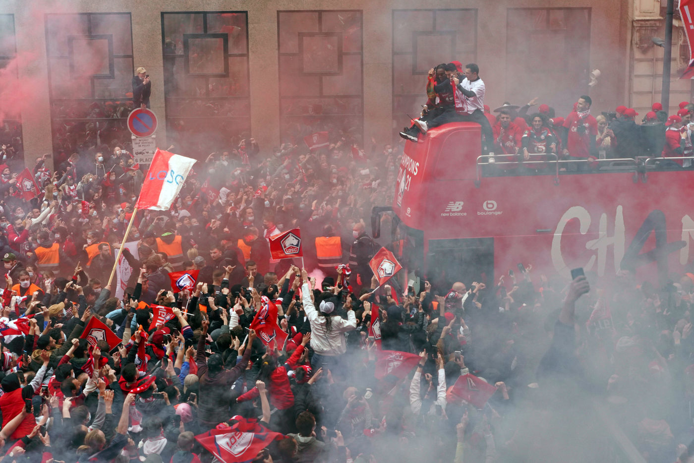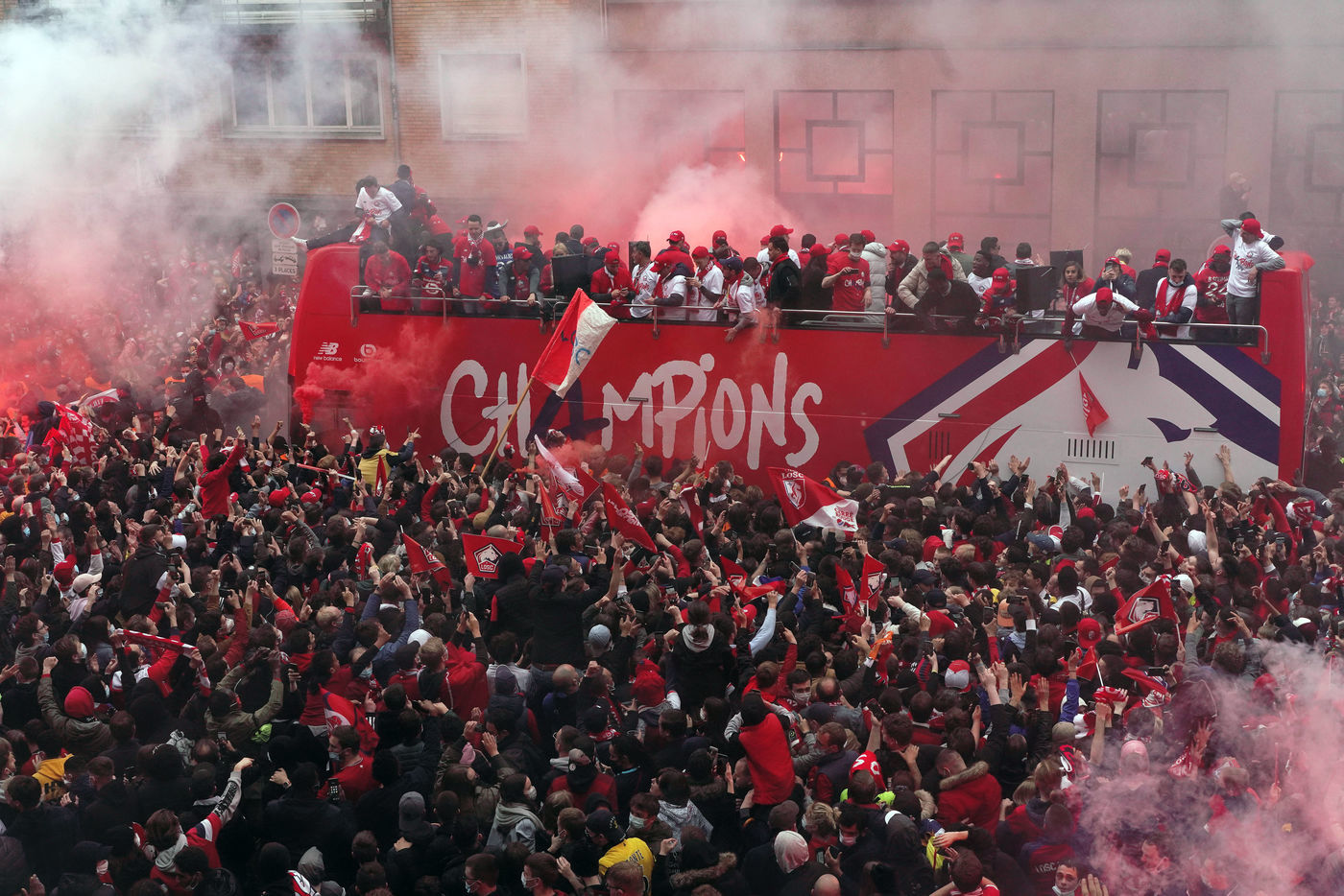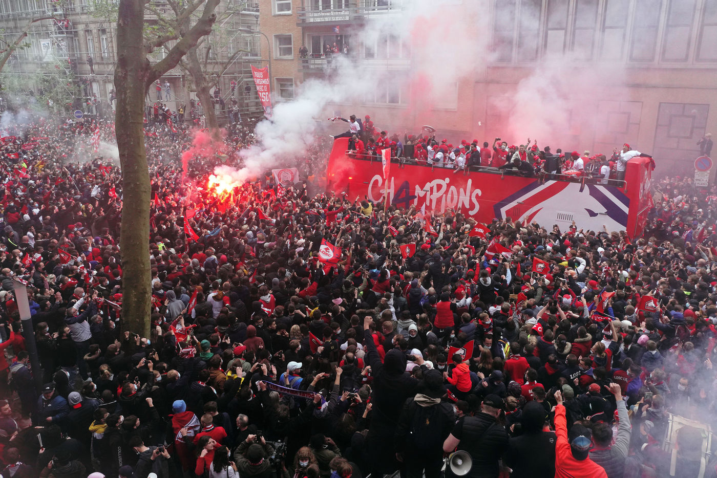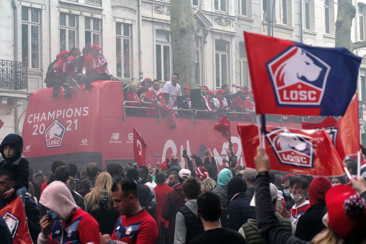 Ambiance in the streets of Lille as players of Lille OSC parade on a bus with the L1 championship trophy to celebrate winning League with fans on May 24, 2021 in Lille, France.