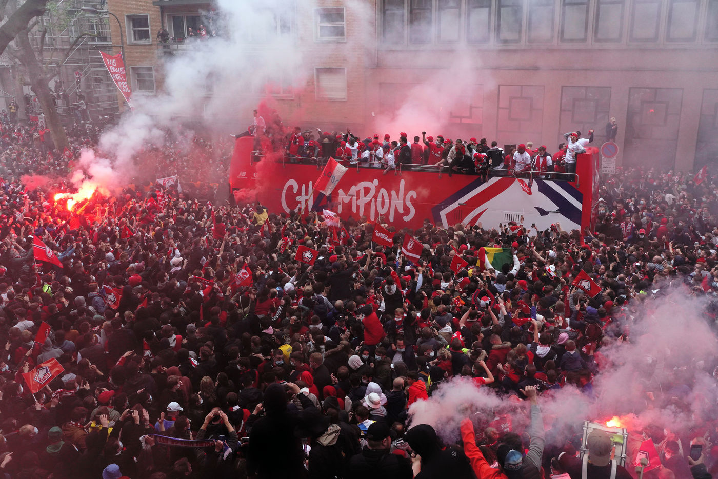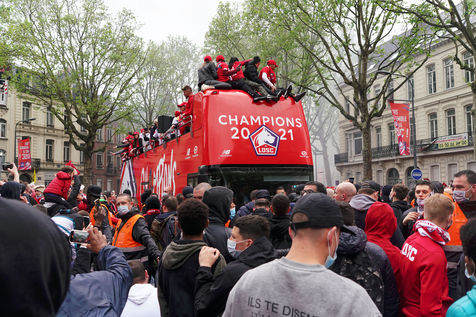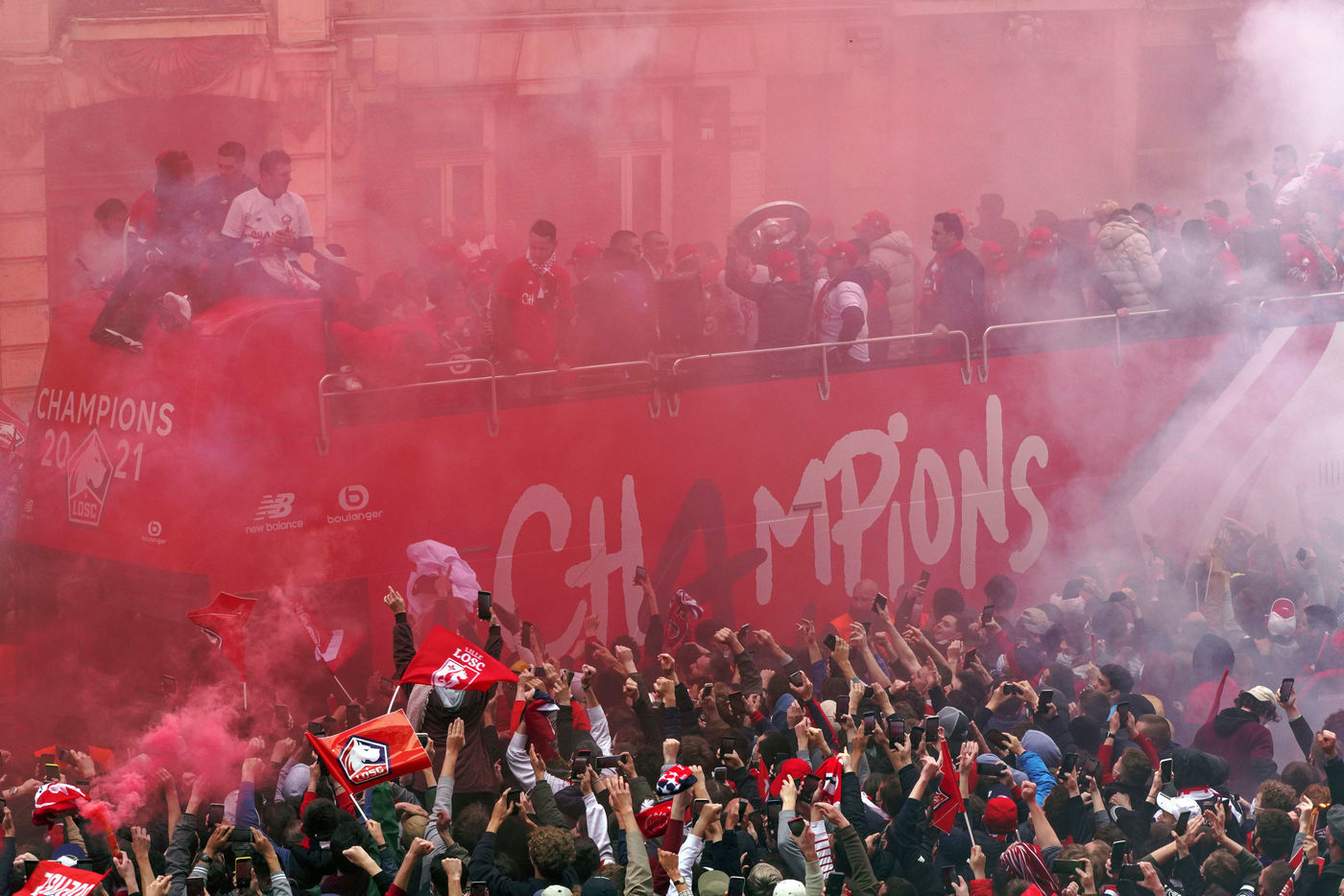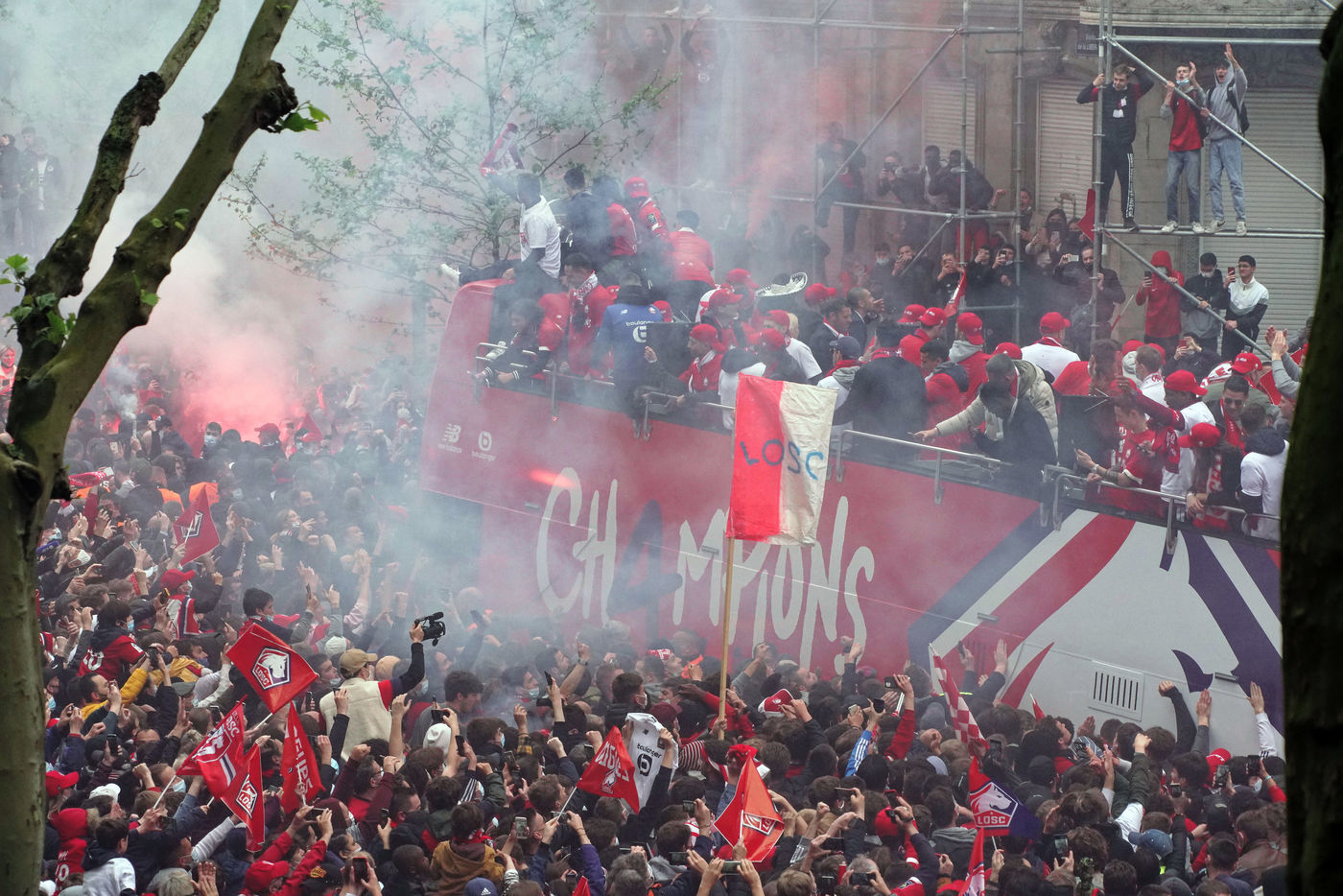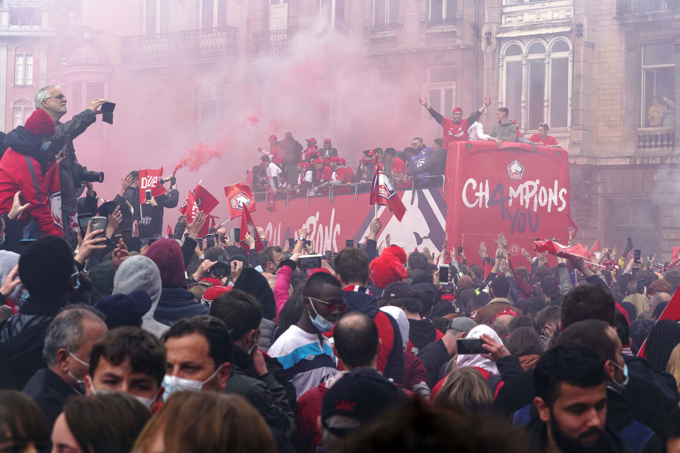 Ambiance in the streets of Lille as players of Lille OSC parade on a bus with the L1 championship trophy to celebrate winning League with fans on May 24, 2021 in Lille, France.