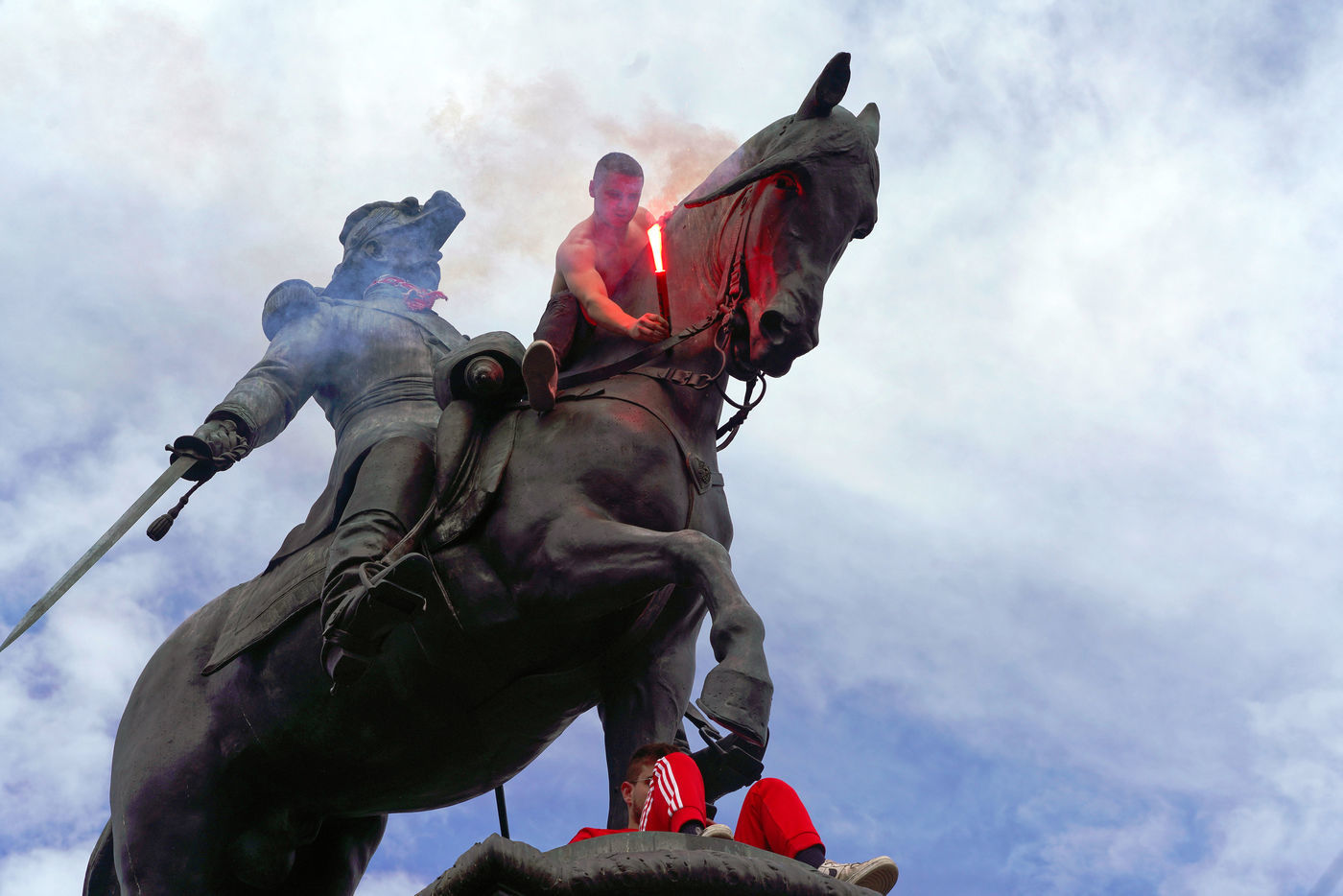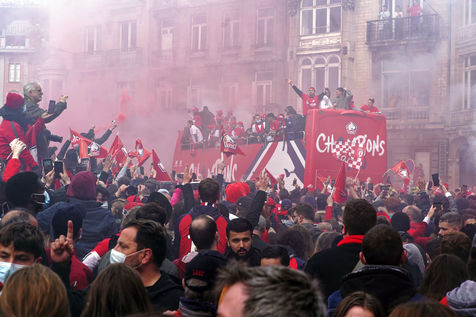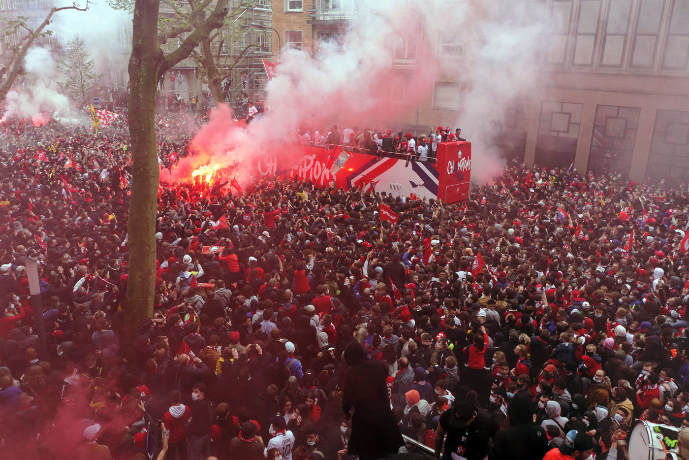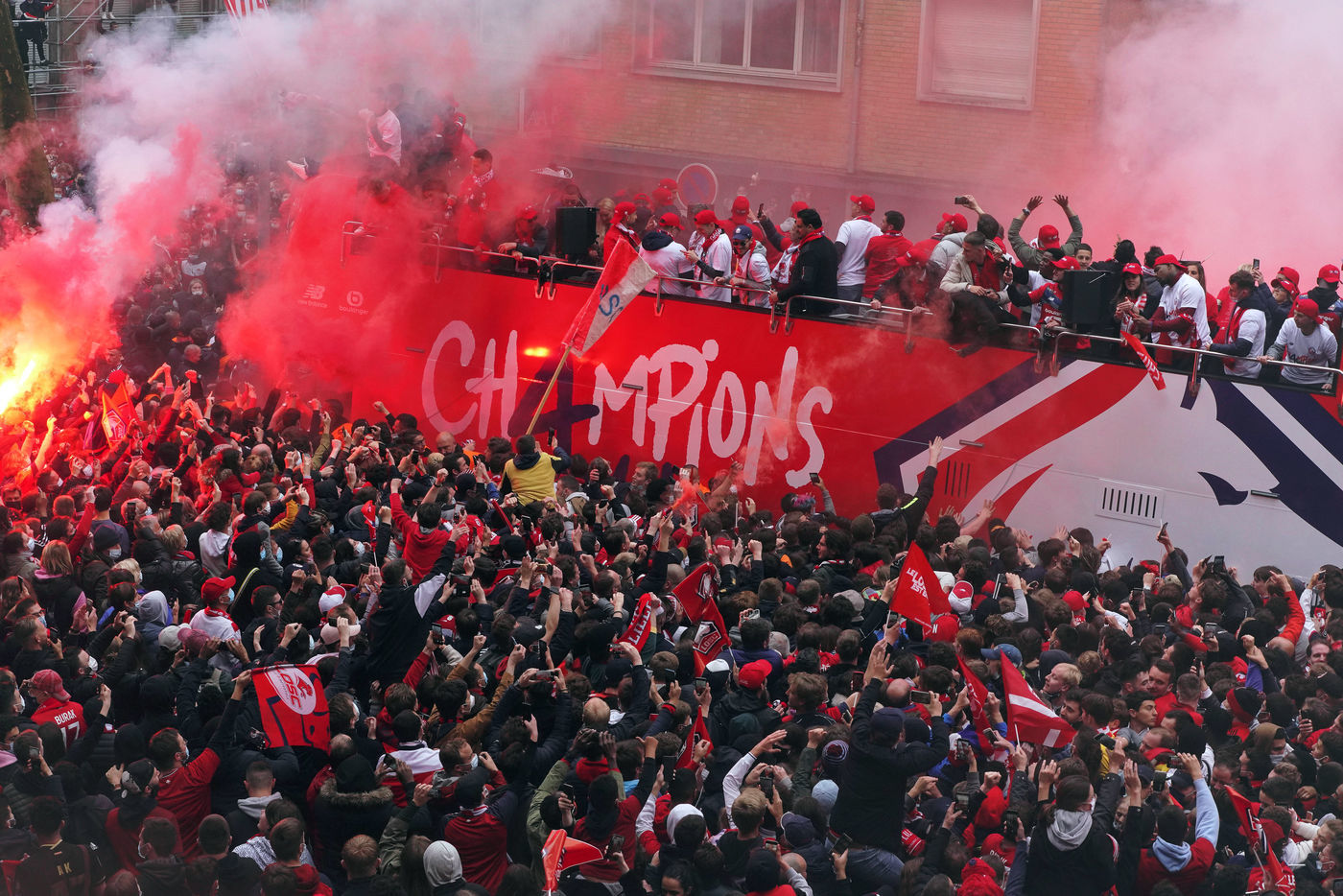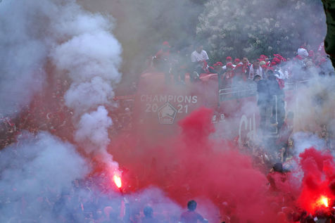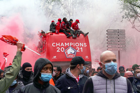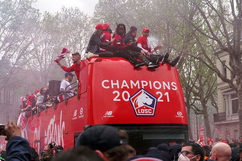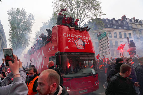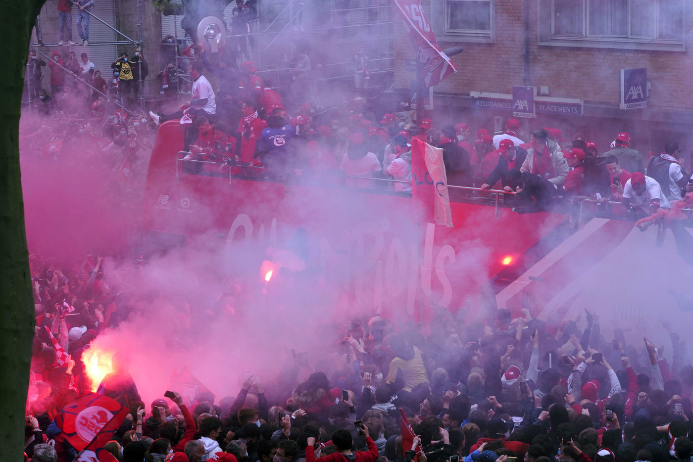 Ambiance in the streets of Lille as players of Lille OSC parade on a bus with the L1 championship trophy to celebrate winning League with fans on May 24, 2021 in Lille, France.