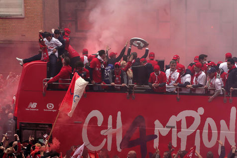 Les joueurs du Lille OSC (LOSC) paradent dans un bus avec le trophee de Ligue 1 pour feter leur 1ere place a l'issue du championnat avec leurs fans, Lille, le 24 Mai 2021