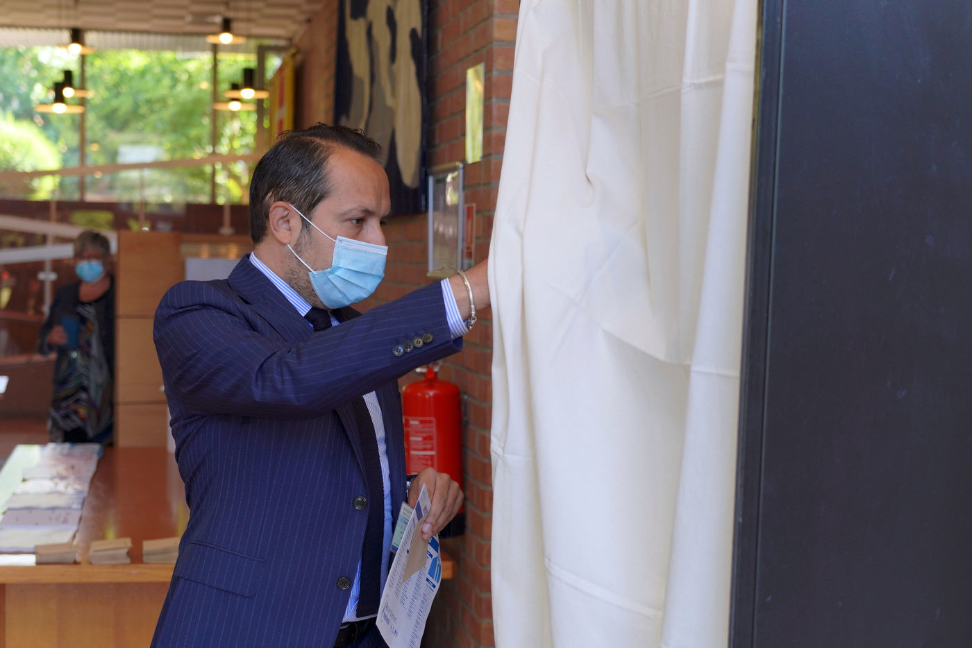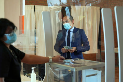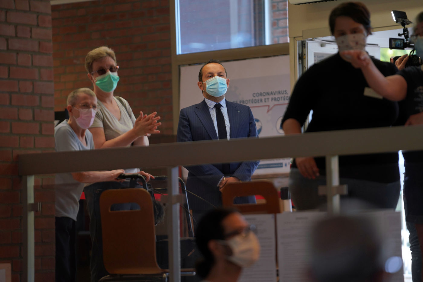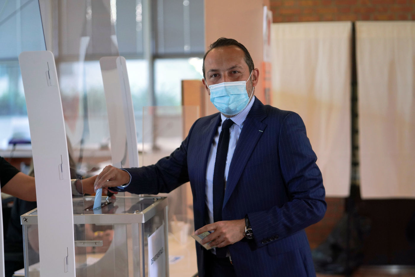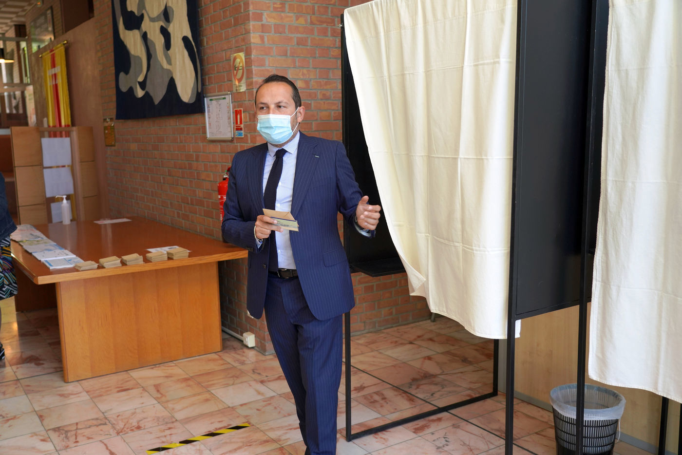 Sebastien Chenu, tete de liste pour les elections regionales dans les Hauts-de-France, vote pour le 1er tour des elections regionales et cantonales a Denain, Nord, le 20 Juin 20201