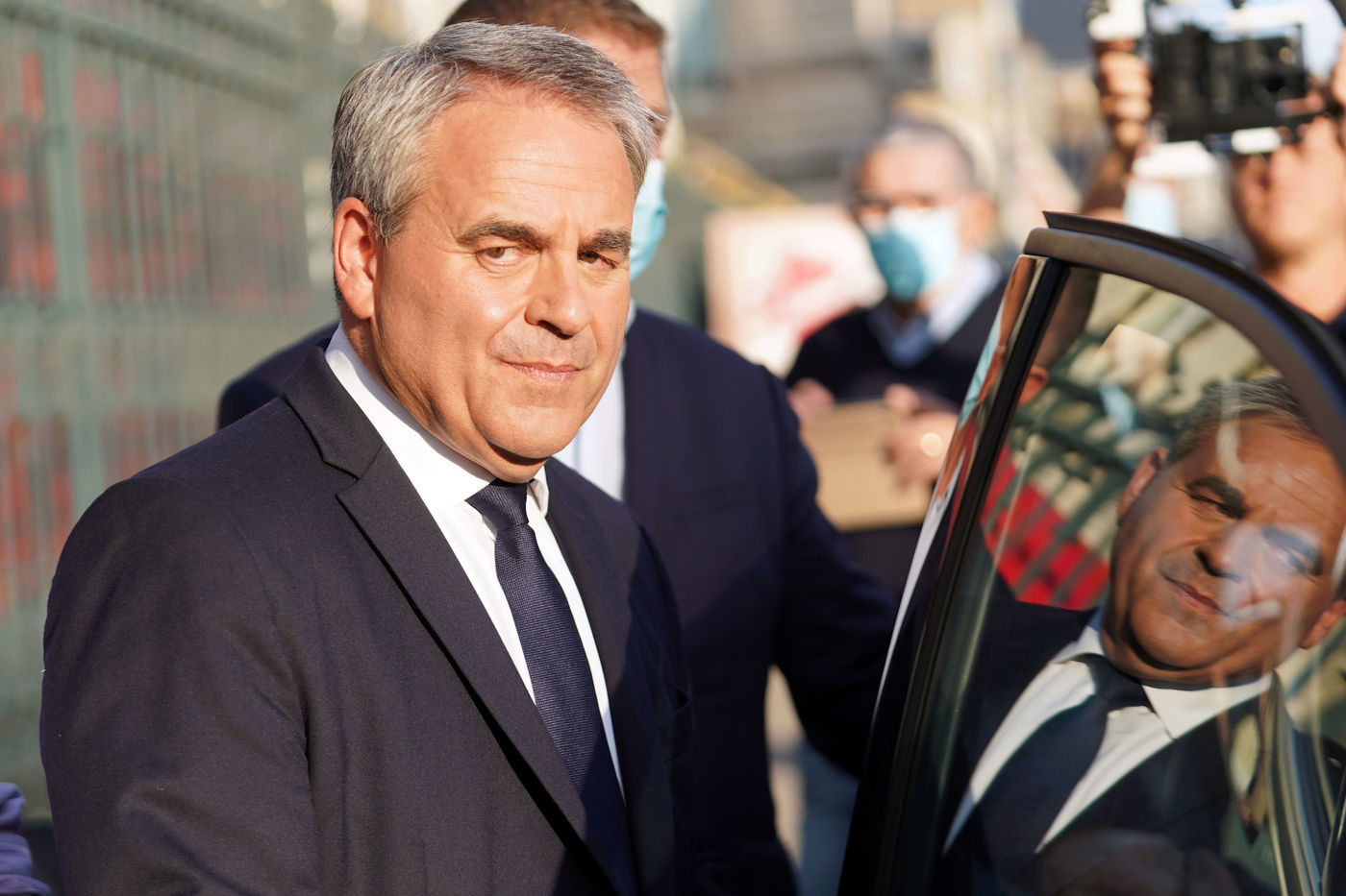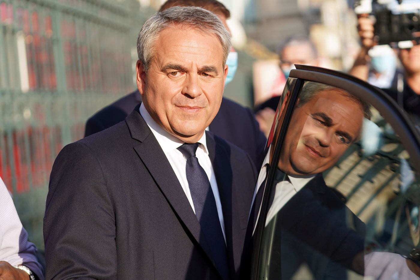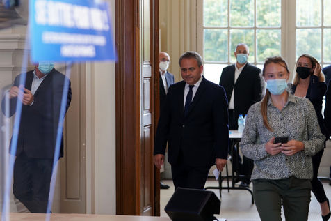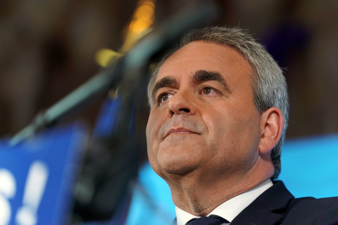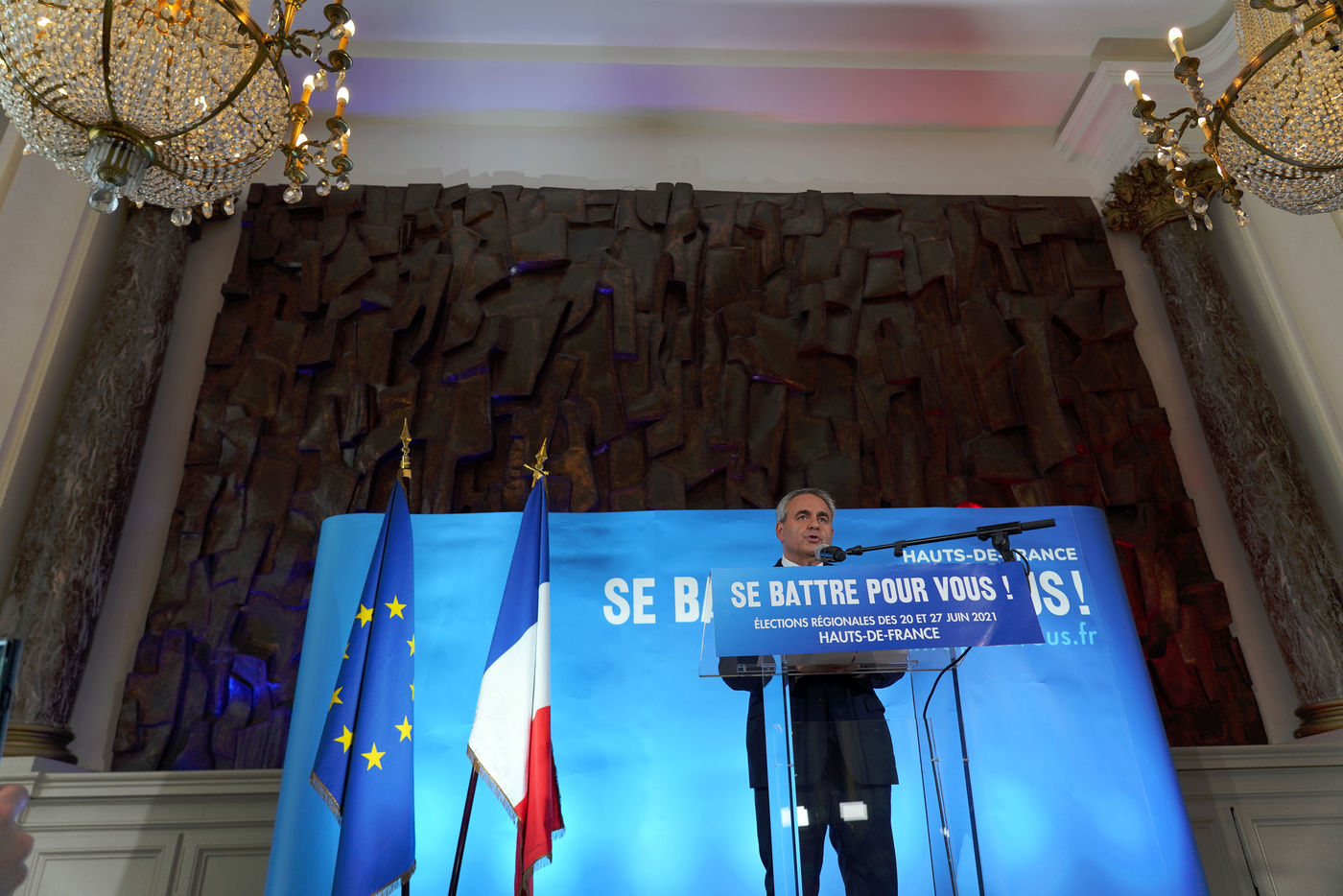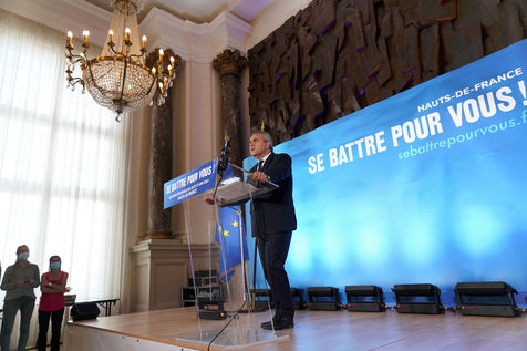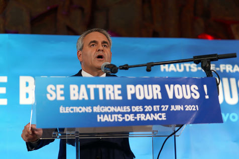 Xavier Bertrand, Les Republicains (LR) conservative party candidate who runs for his succession as Hauts-de-France region president, during electoral night of the second round of French regional and departmental elections, in Saint-Quentin, France, June 27. 2021.