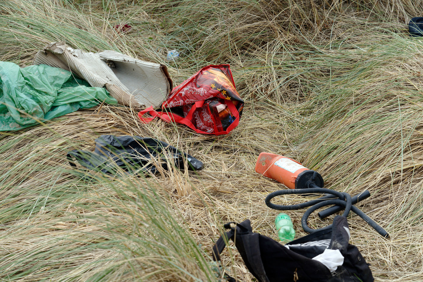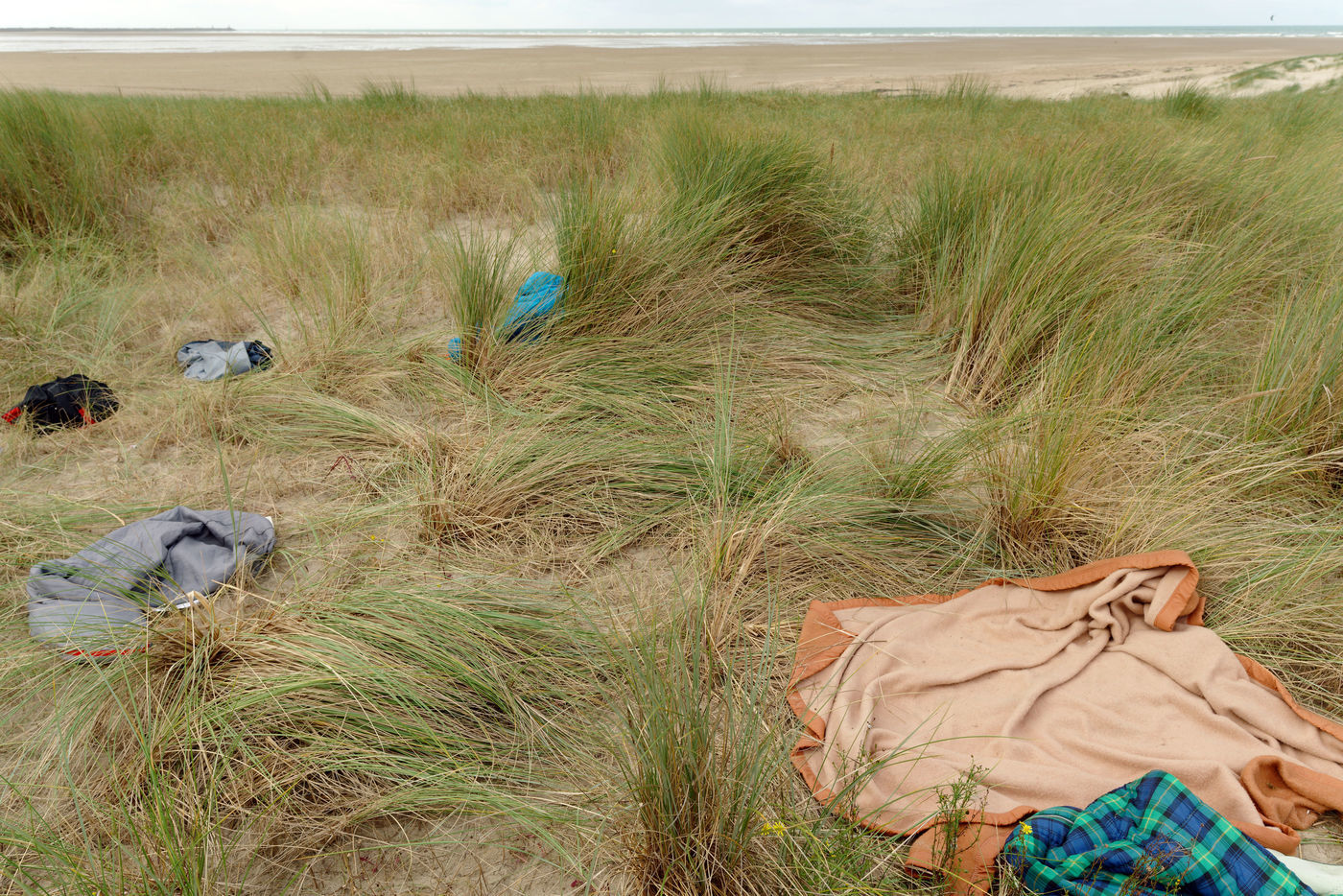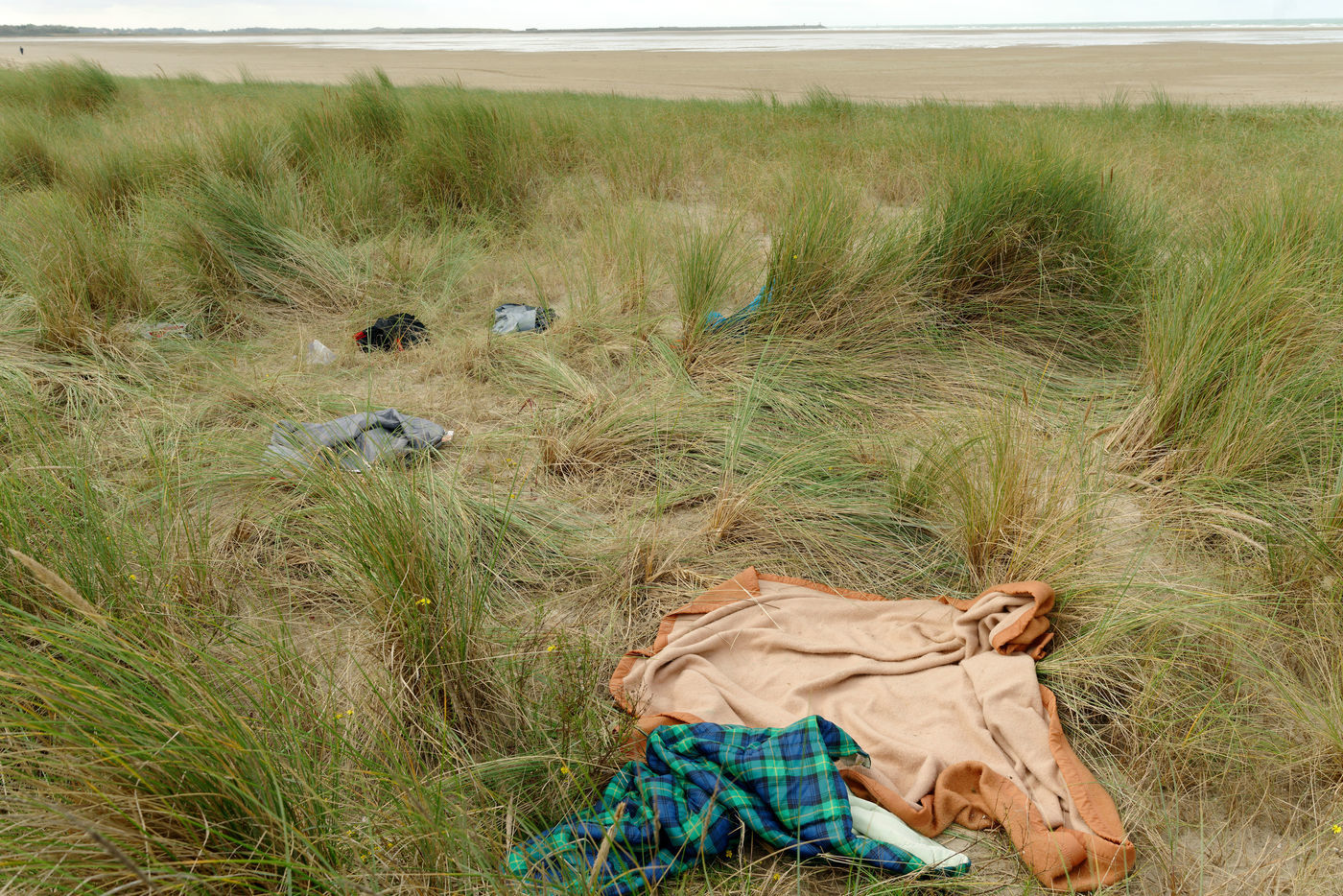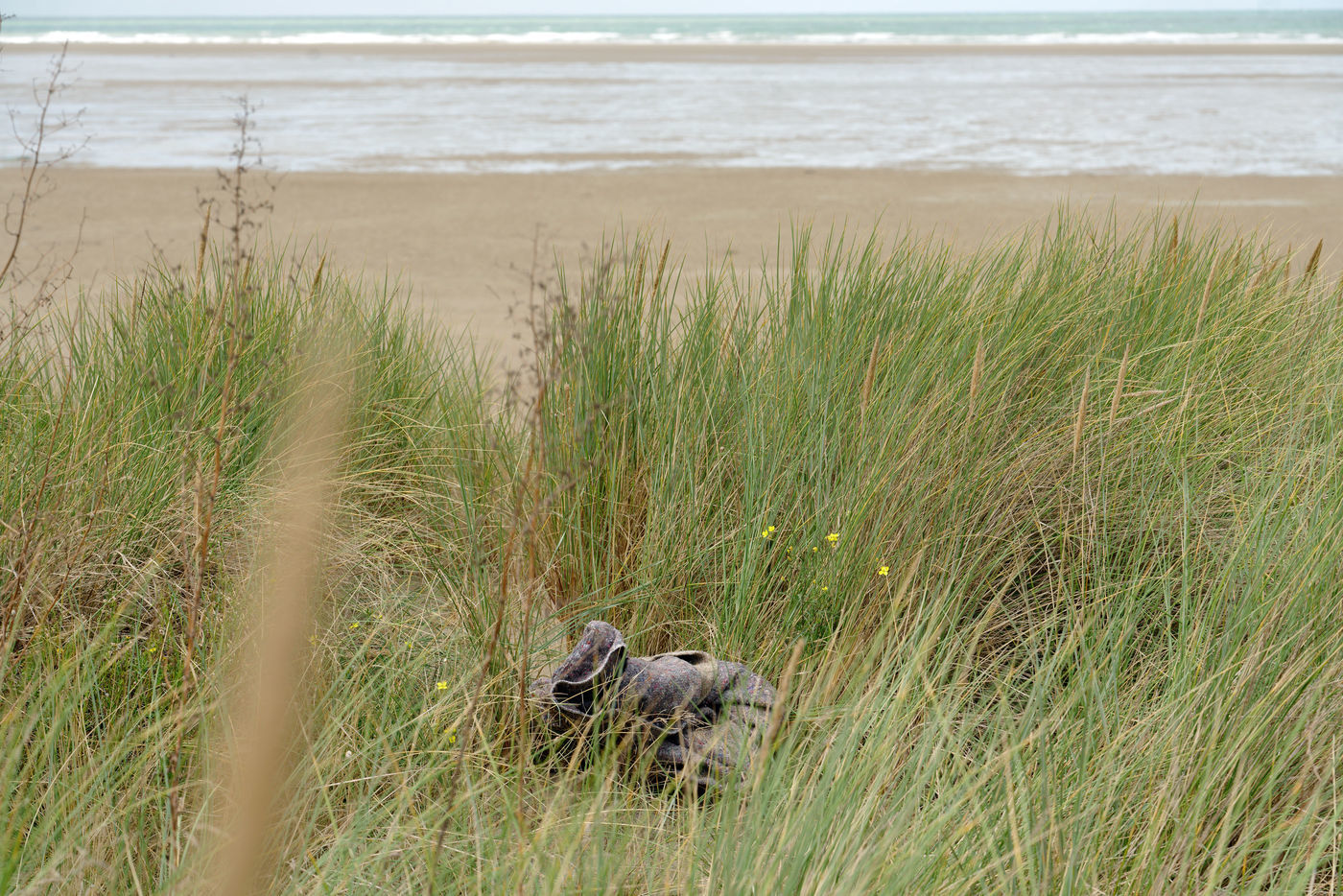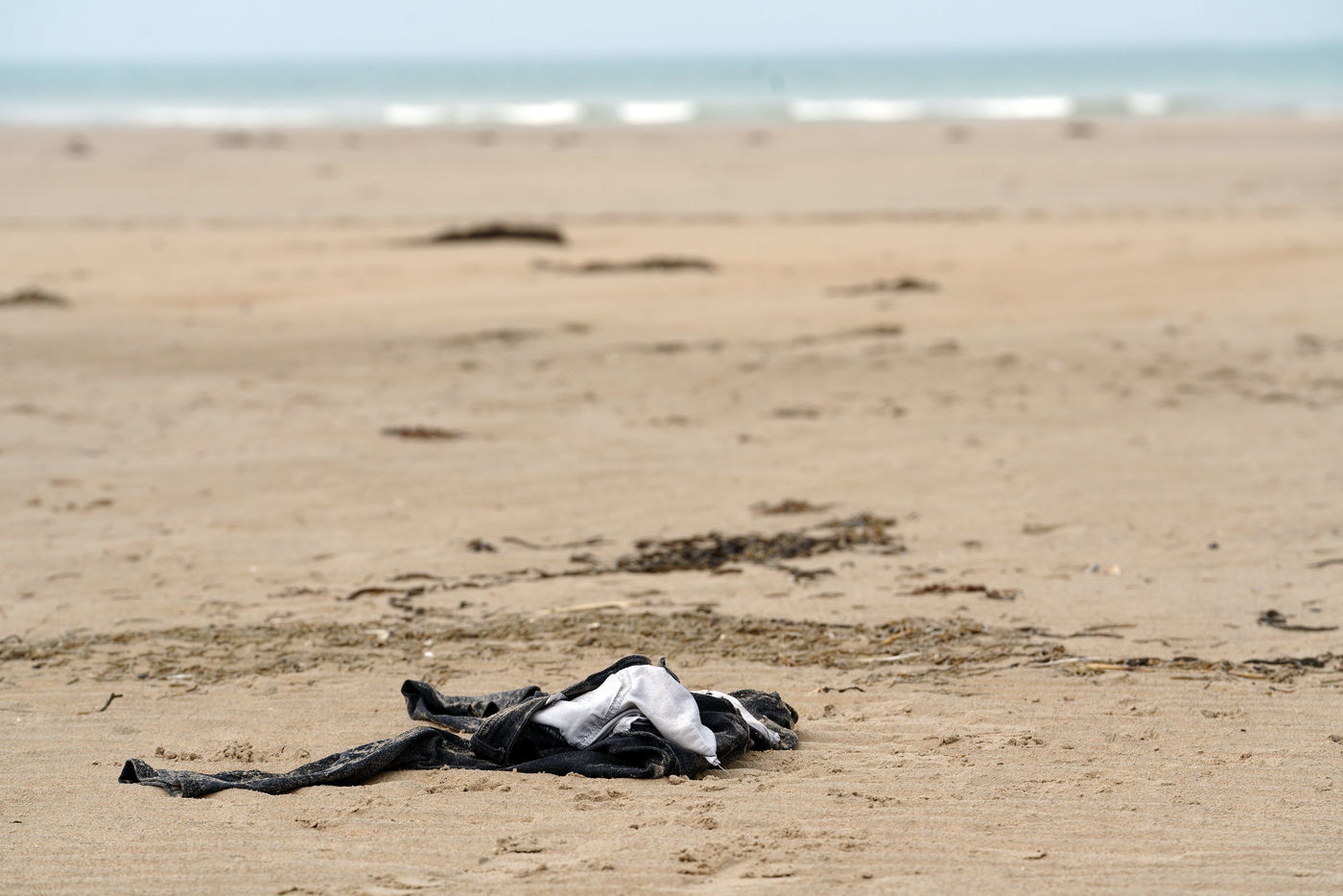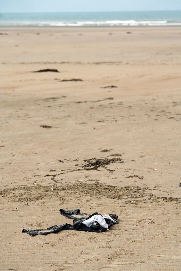 Des effets personnels de migrant gisent dans le sable de la plage de Gravelines. Ils ont été abandonnés lors d'une tentative de traversée de la Manche, a Gravelines, pres de Dunkerque, France, le 12 Octobre 2021.