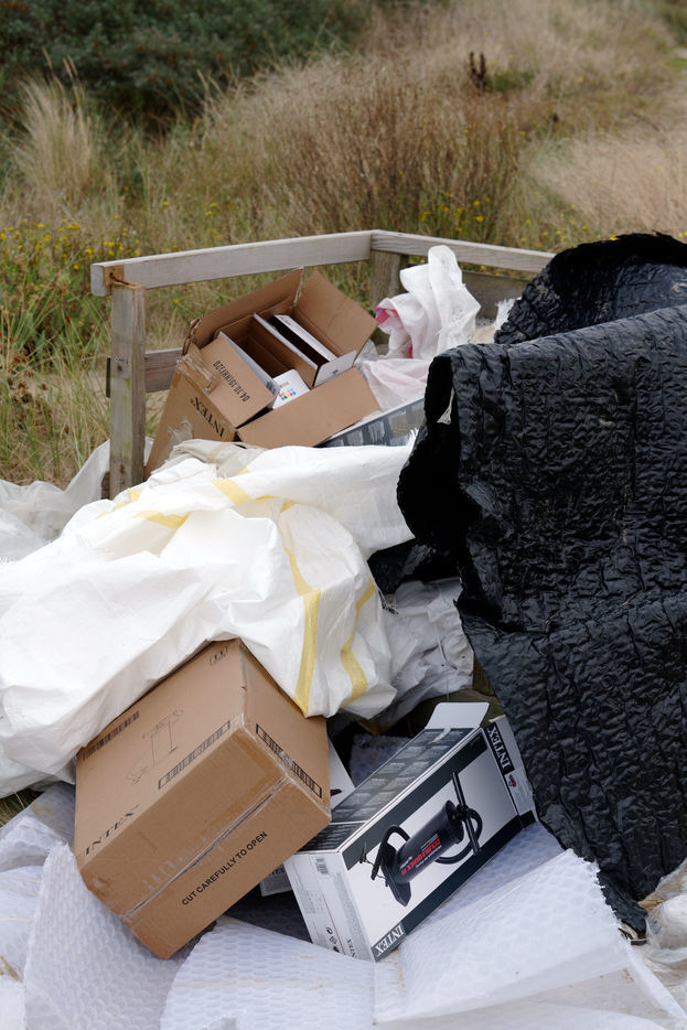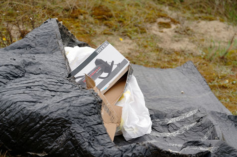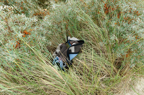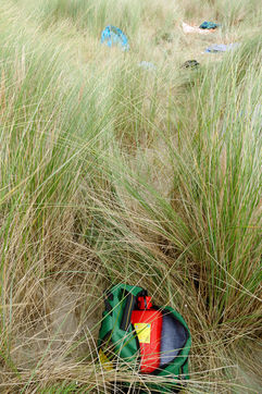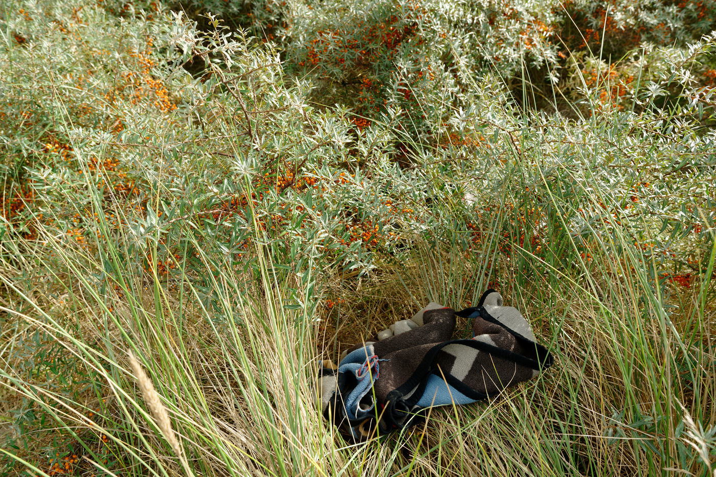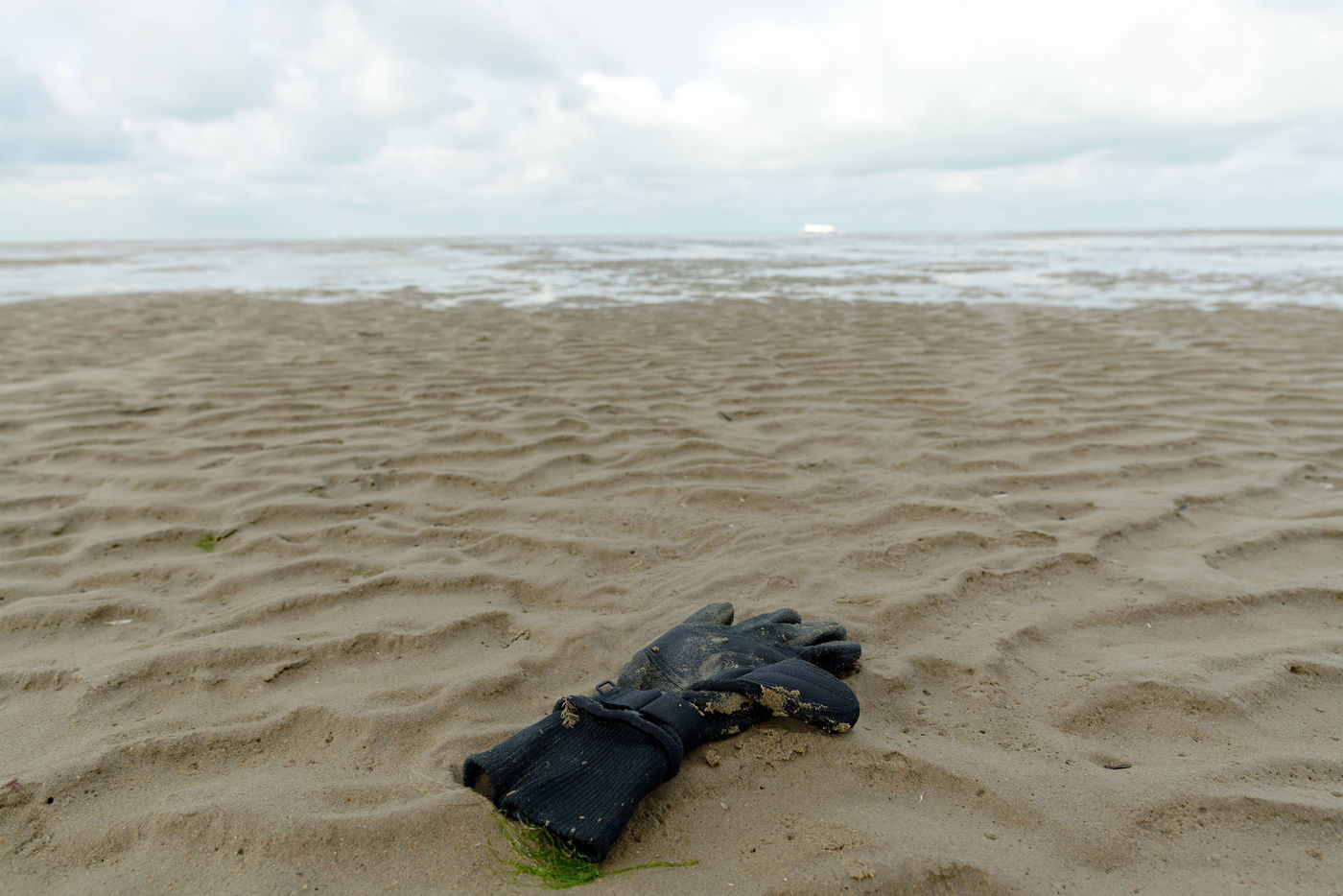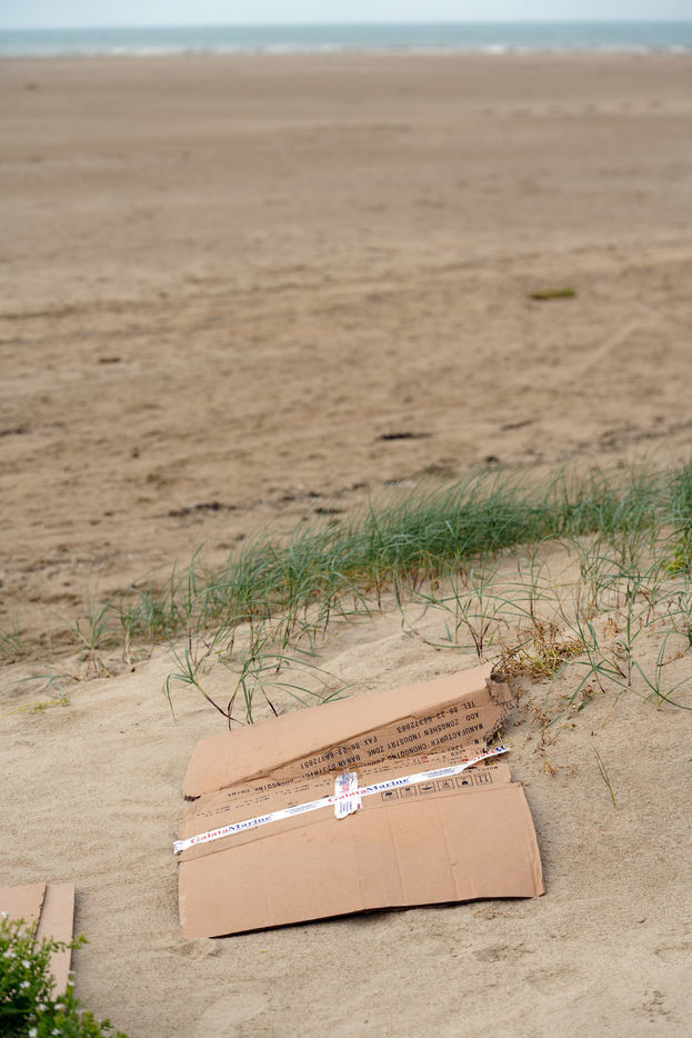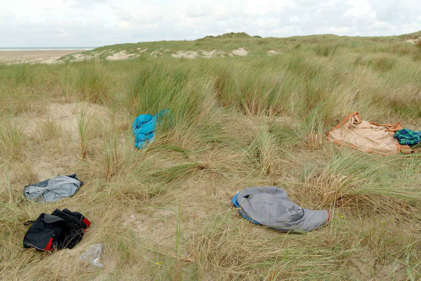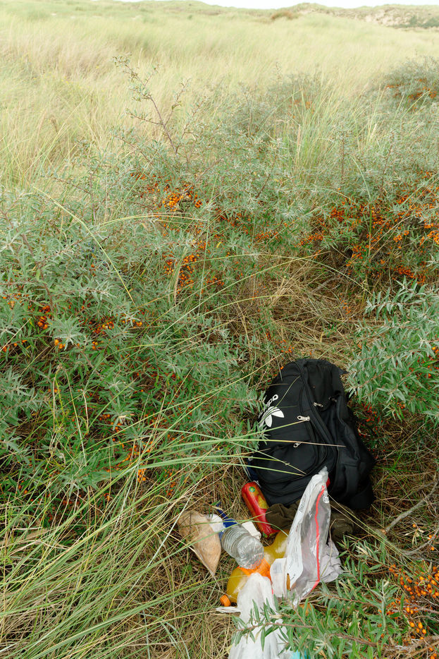 Des effets personnels de migrant gisent dans le sable de la plage de Gravelines. Ils ont été abandonnés lors d'une tentative de traversée de la Manche, a Gravelines, pres de Dunkerque, France, le 12 Octobre 2021.