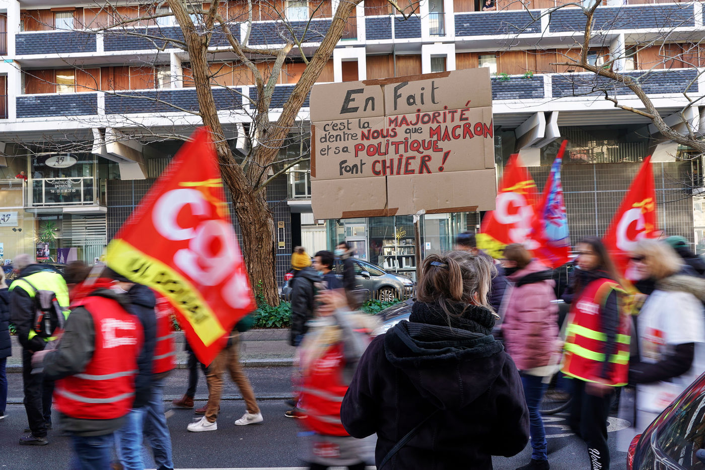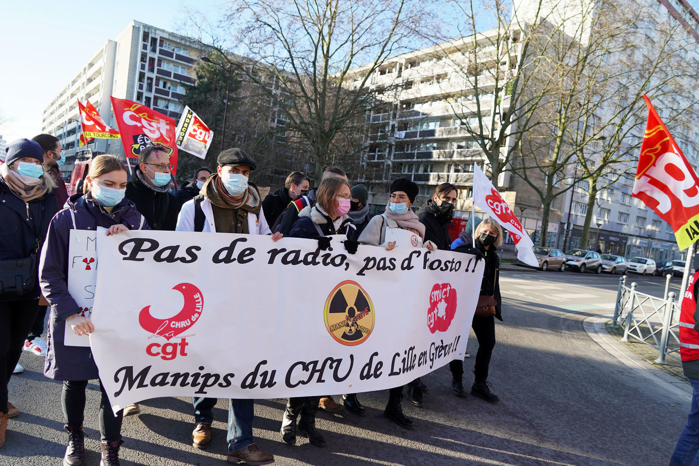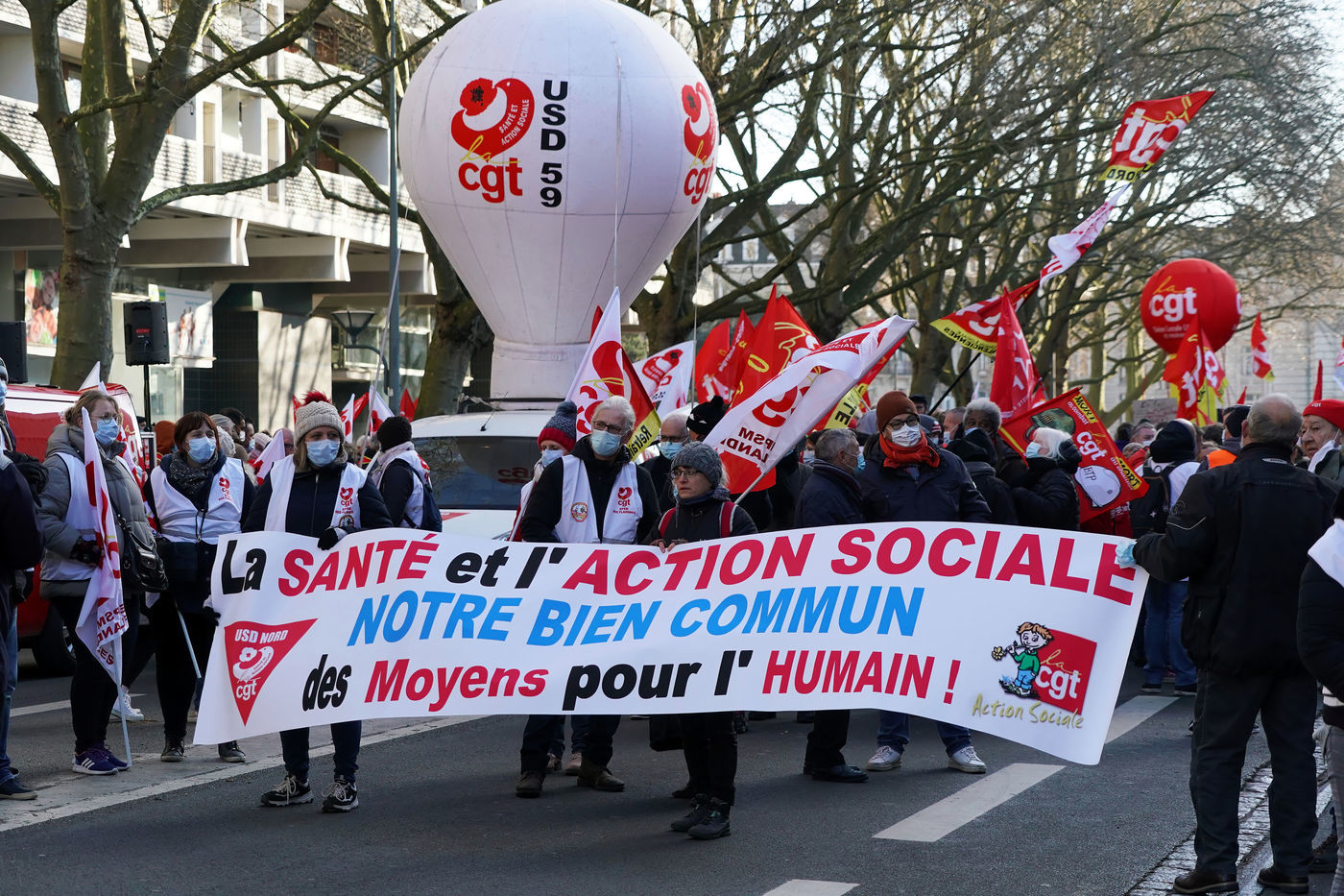 Des travailleurs de la santé manifestent à Lille, dans le nord de la France, le 11 janvier 2022, pour protester contre les conditions de travail et le niveau des moyens financiers des hôpitaux en France.