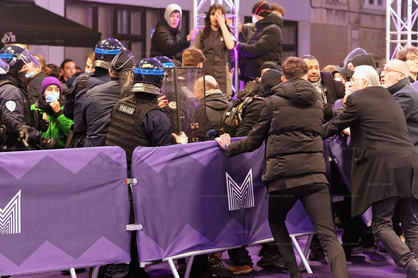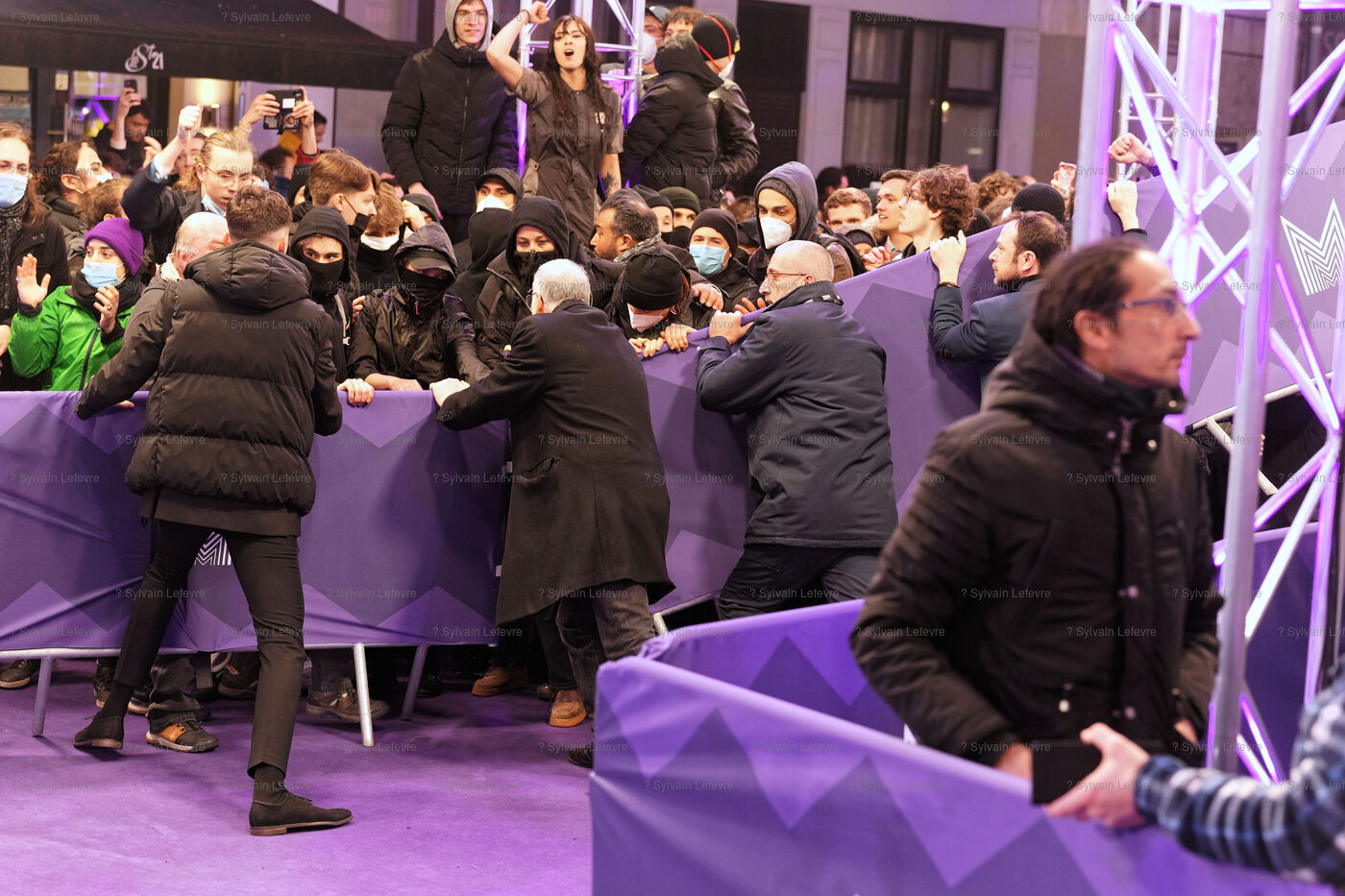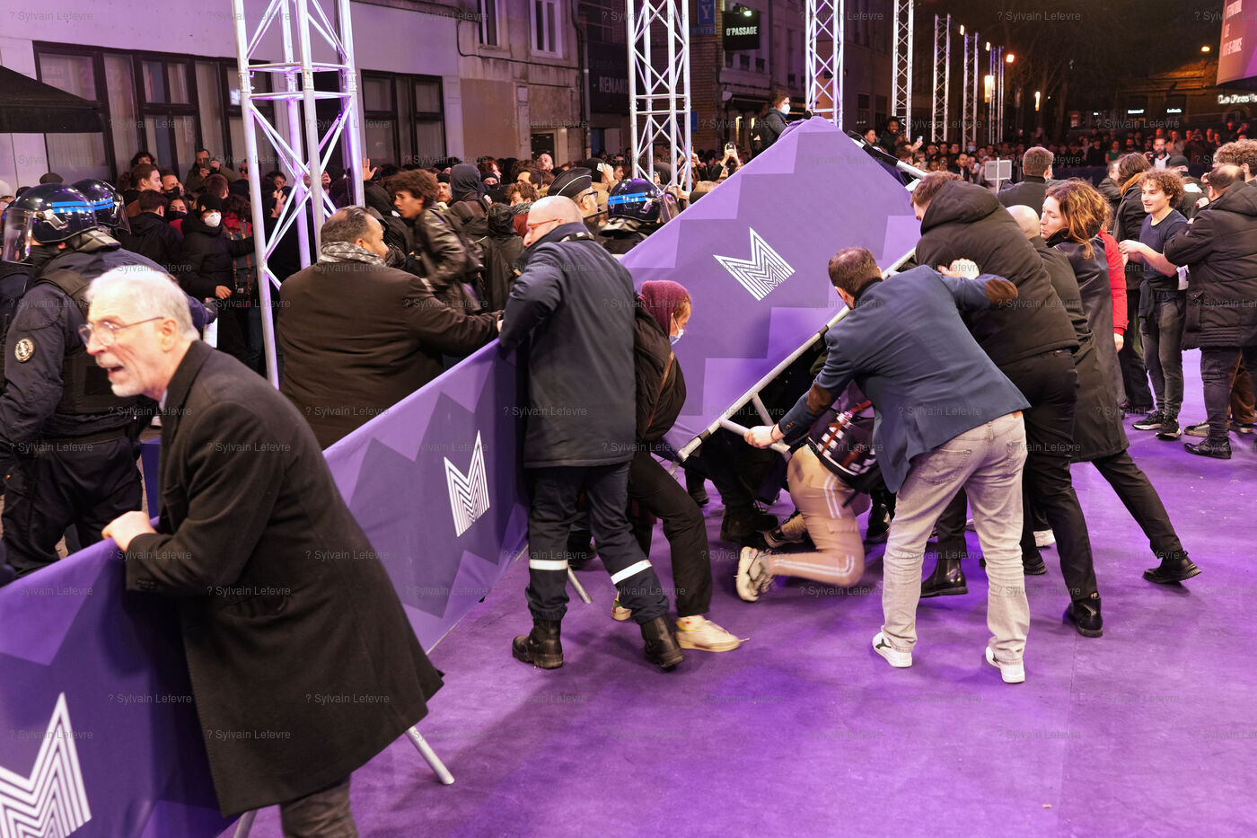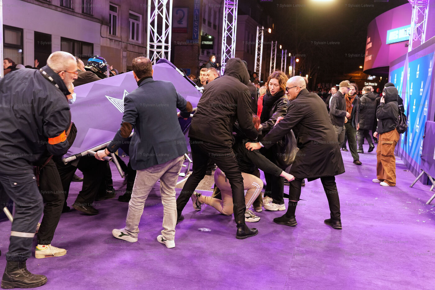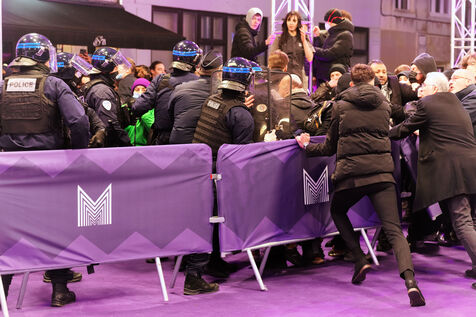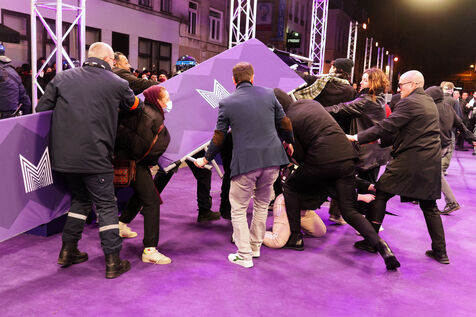 Protesters against the pension reform in France try to invade the violet carpet of the Series Mania festival, and are pushed back by security staff on March 21, 2023 in Lille, France.