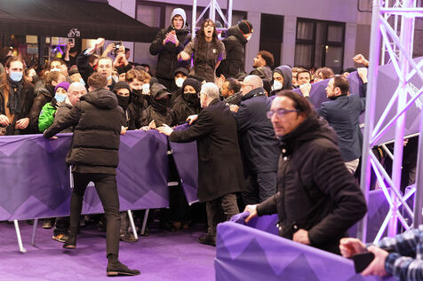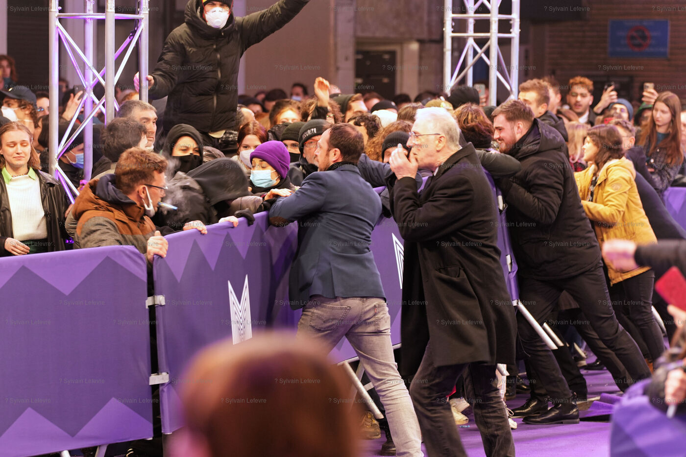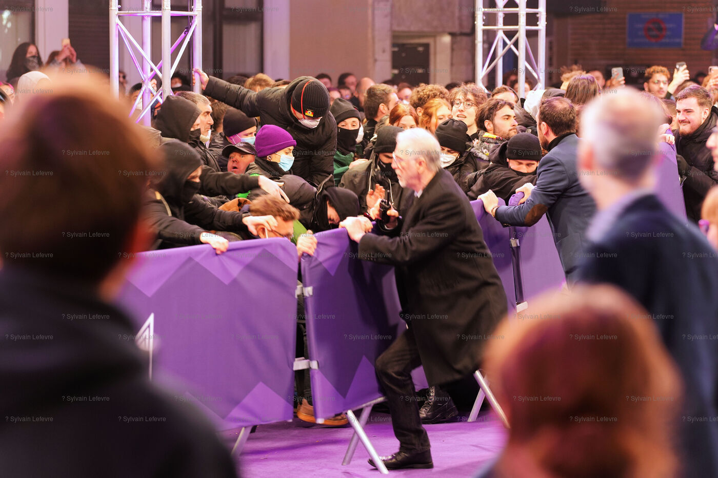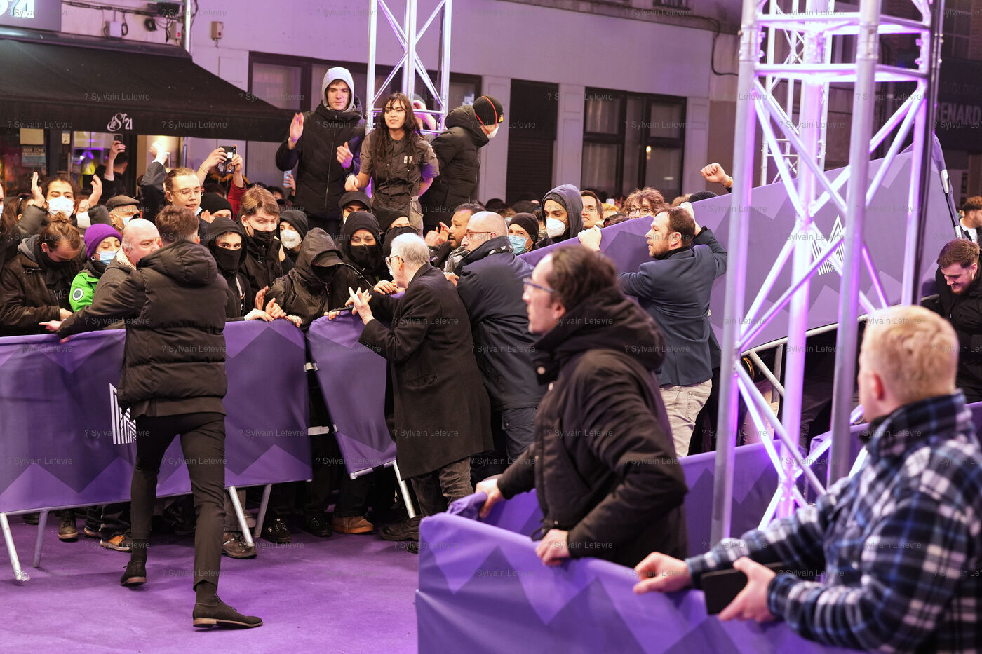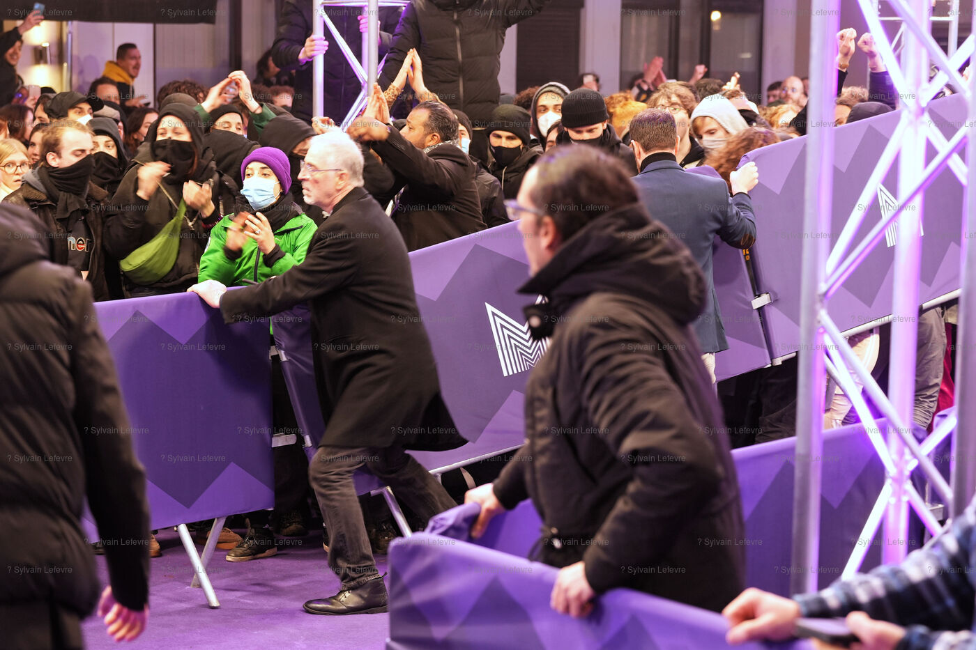 Protesters against the pension reform in France try to invade the violet carpet of the Series Mania festival, and are pushed back by security staff on March 21, 2023 in Lille, France.
