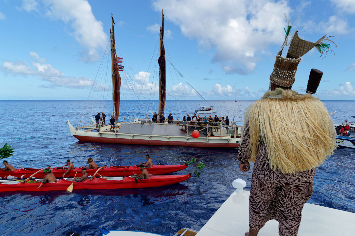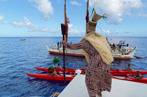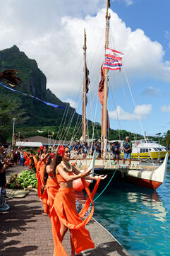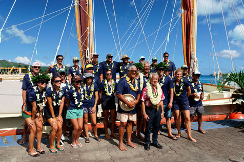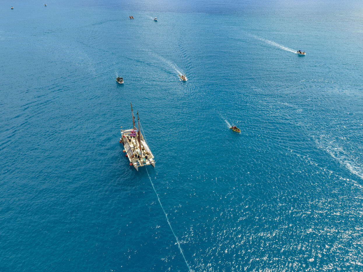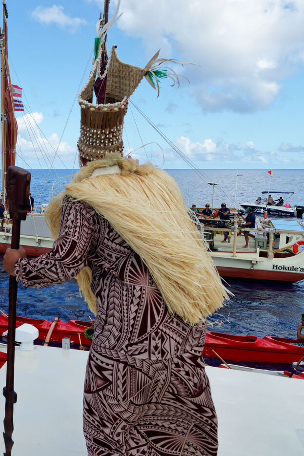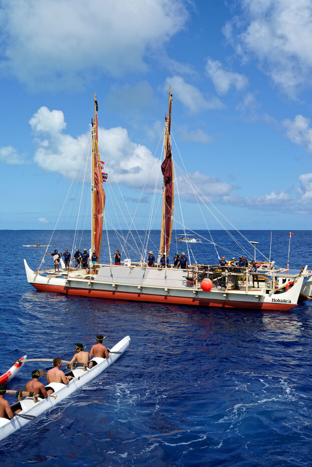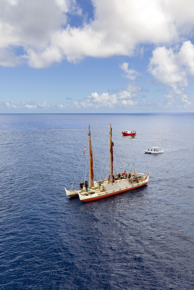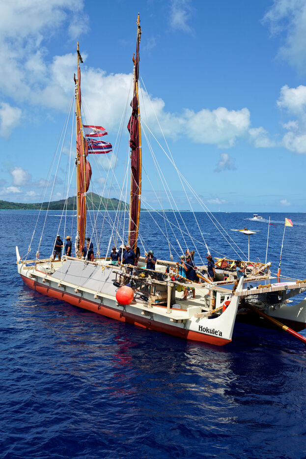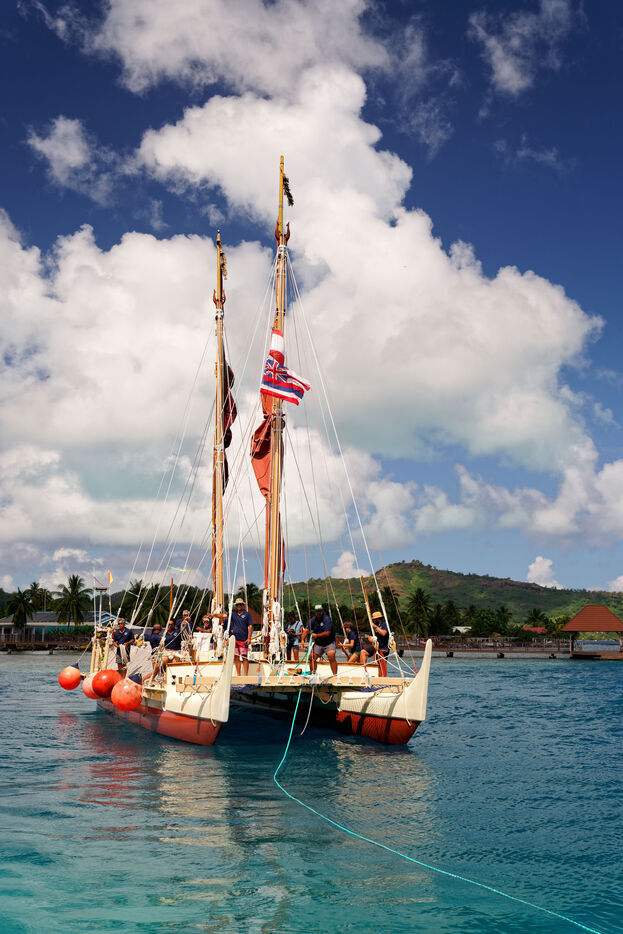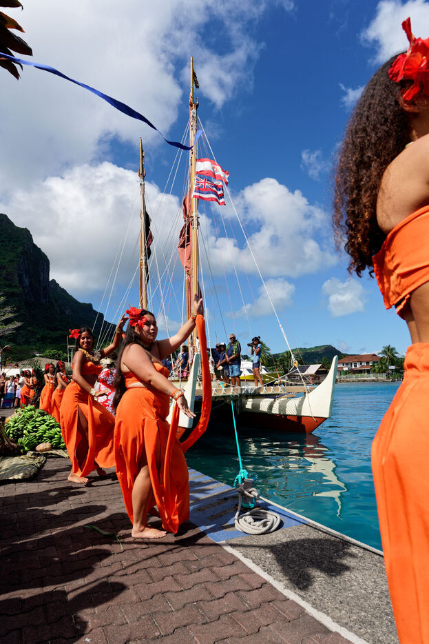 Cérémonie d'accueil des pirogues double traditionnelles polynésiennes Hokule'a - pirogue sans moteur - et Hikianalia - pirogue d'assistance - sur l'île de Bora Bora. Bora Bora est leur dernière étape en Polynésie Française dans le cadre du voyage Moananuiākea, 09 Aout 2025, Bora Bora, Polynésie Française