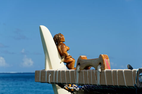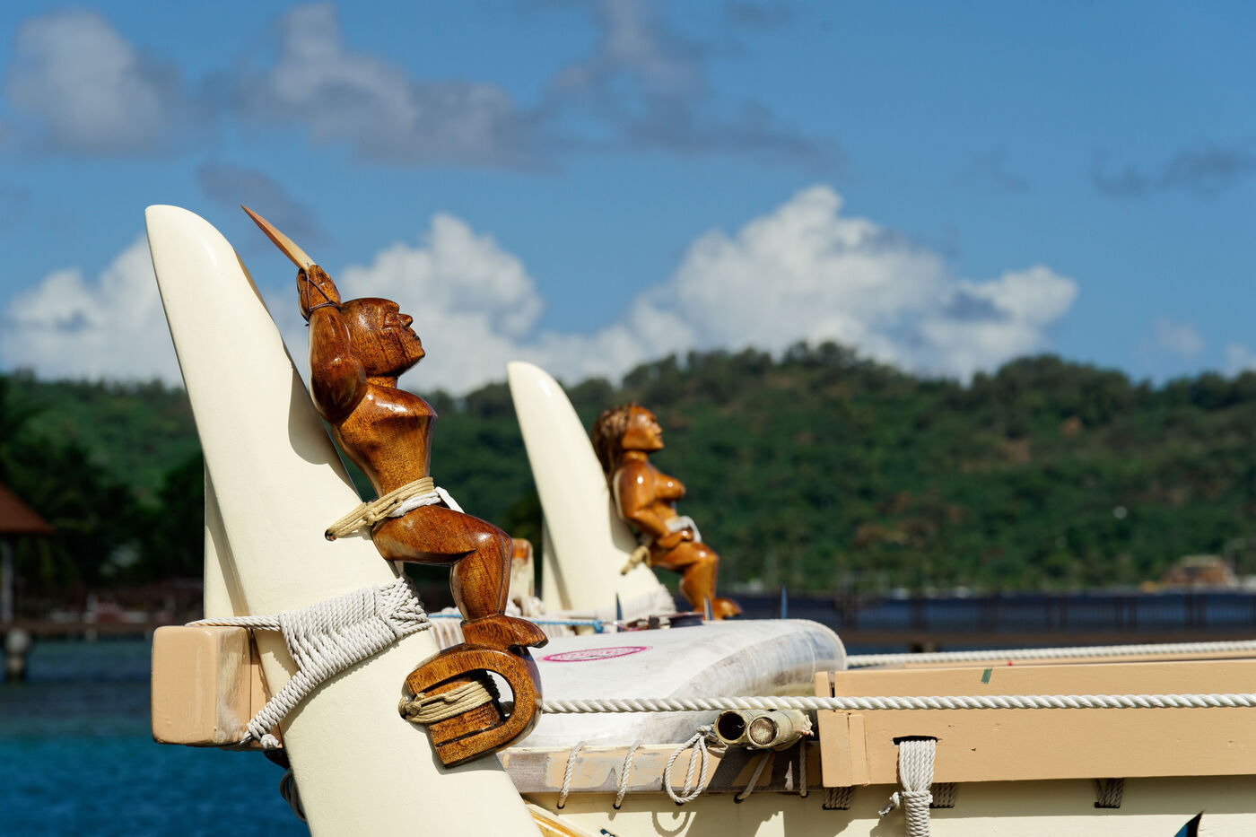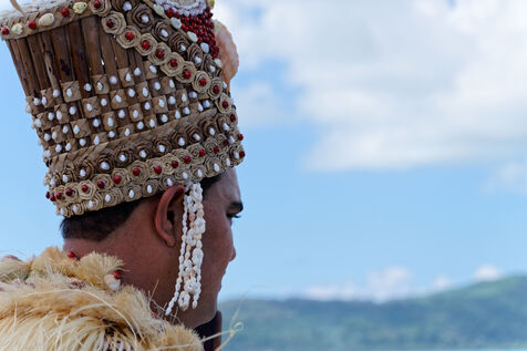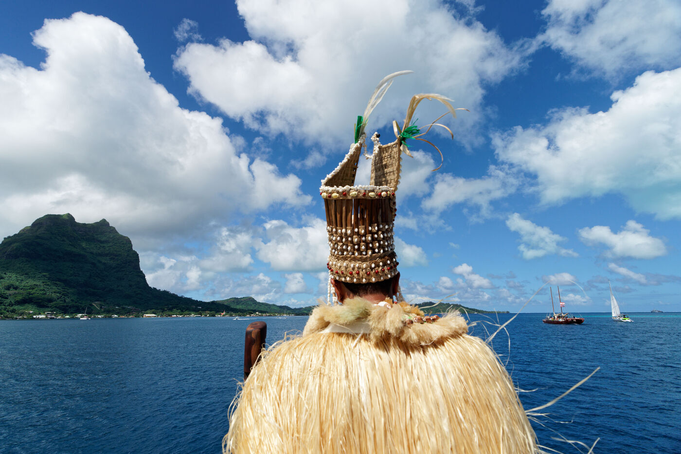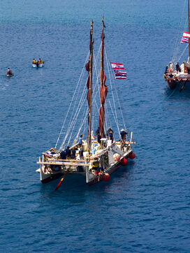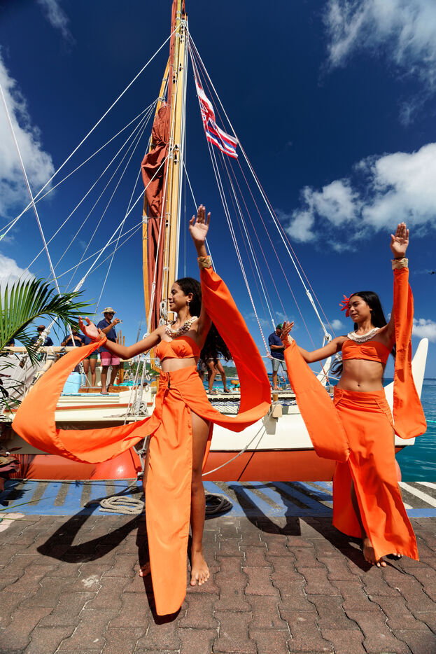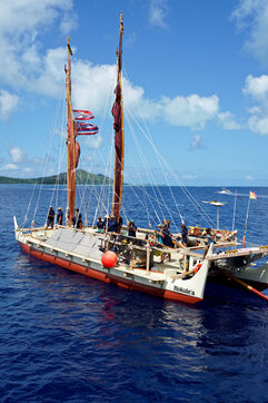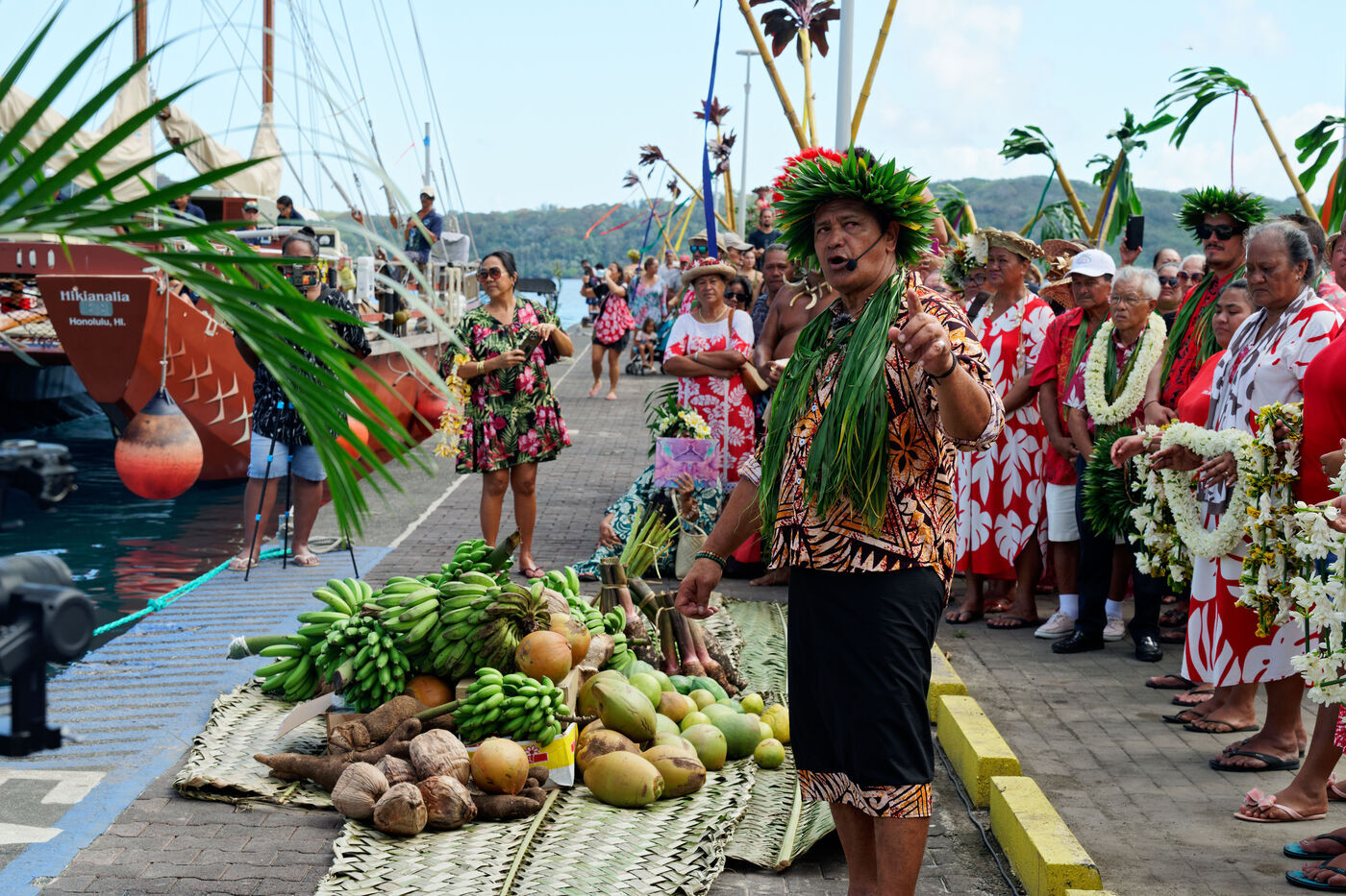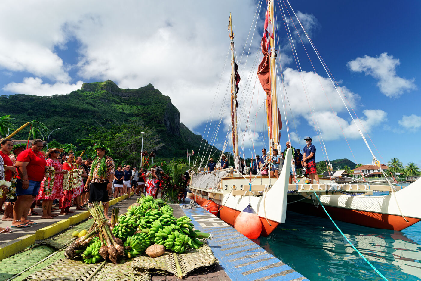 Cérémonie d'accueil des pirogues double traditionnelles polynésiennes Hokule'a - pirogue sans moteur - et Hikianalia - pirogue d'assistance - sur l'île de Bora Bora. Bora Bora est leur dernière étape en Polynésie Française dans le cadre du voyage Moananuiākea, 09 Aout 2025, Bora Bora, Polynésie Française