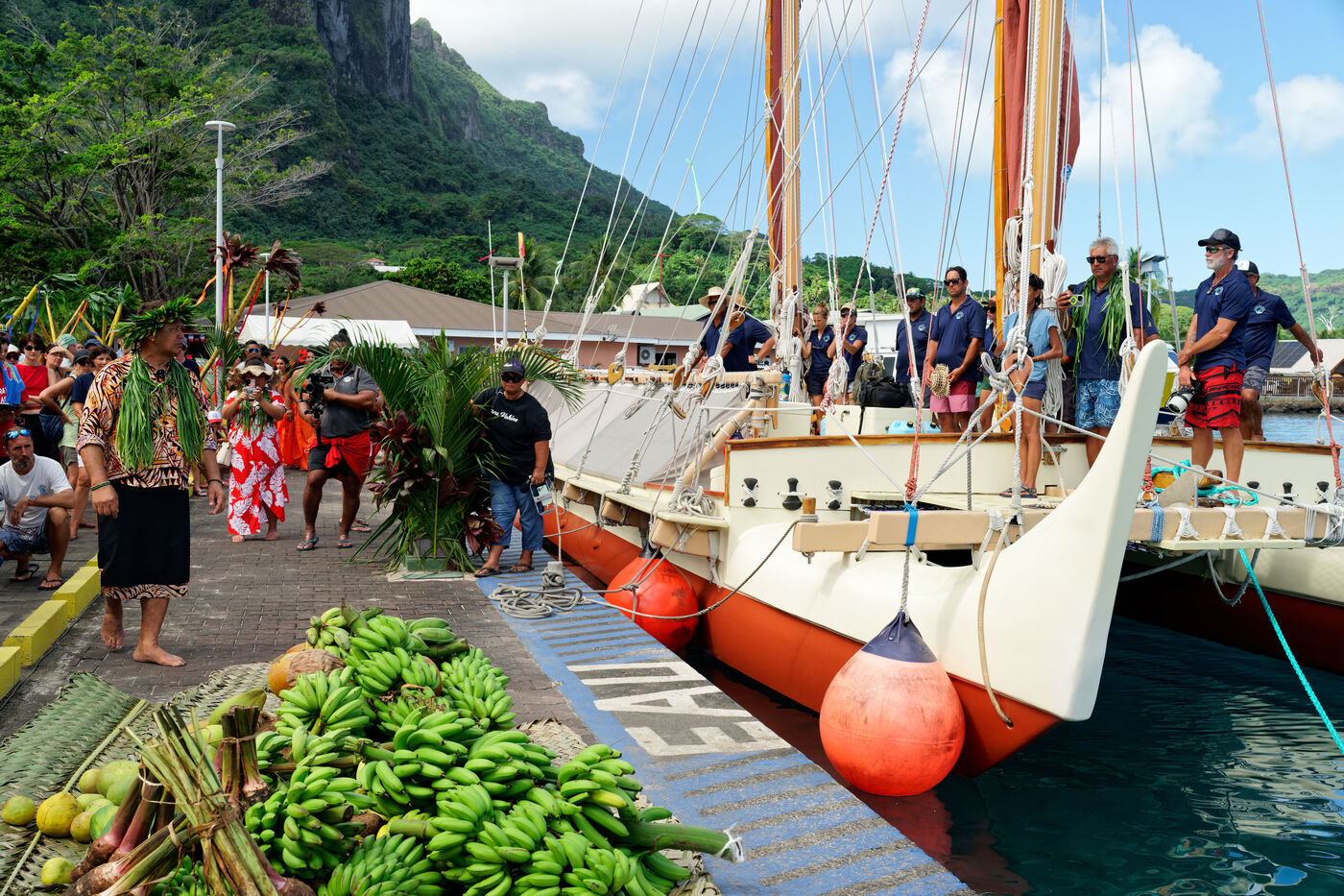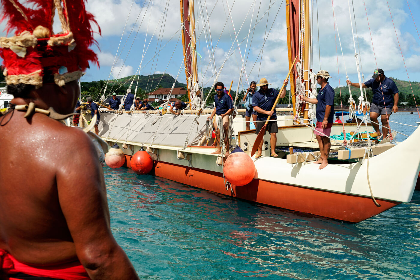 Welcome ceremony for the traditional Polynesian double-hulled canoes Hokule'a - a motorless canoe - and Hikianalia - a support canoe - on the island of Bora Bora. Bora Bora is their final stop in French Polynesia as part of the Moananuiākea voyage, on August 09, 2025 in BORA BORA, French Polynesia.