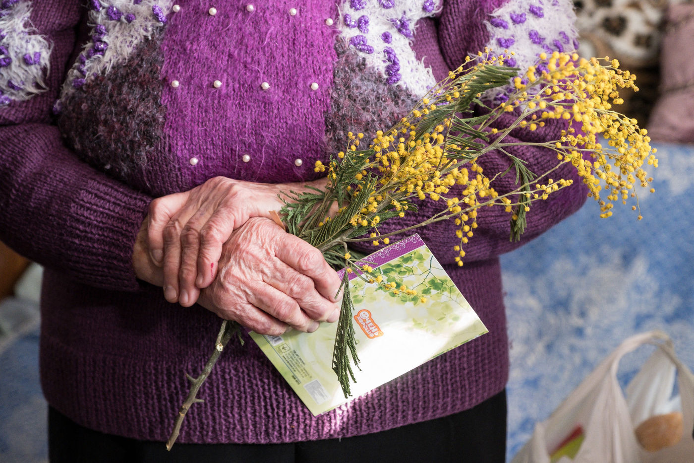 Pour la journée internationale de la femme, le 8 mars 2017, l'église orthodoxe et des associations ont décidé de distribuer ensemble de la nourriture et des bouquets de fleurs aux personnes agées en détresse autour d'Odessa, en Ukraine. Conséquences de la guerre et de la crise économique, de nombreuses personnes sont dans le besoin. La brusque chute du hryvnia en 2015 a diminué drastiquement les salaires et donc le pouvoir d'achat et le niveau des vie des ukrainiens. Cela impacte également les retraités, sujet de ce reportage.