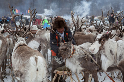 Les enfants russes gambadent en trimballant des ballons de baudruche en forme d'hélicoptère alors que les jeunes evenks fendent la foule, en tout sens, sur leurs rennes. Leurs petites bottes fourrées traditionnelles et leurs capuchons de fourrure tressautant au rythme de leur monture. Certains proposent même de faire un tour du campement contre quelques roubles.