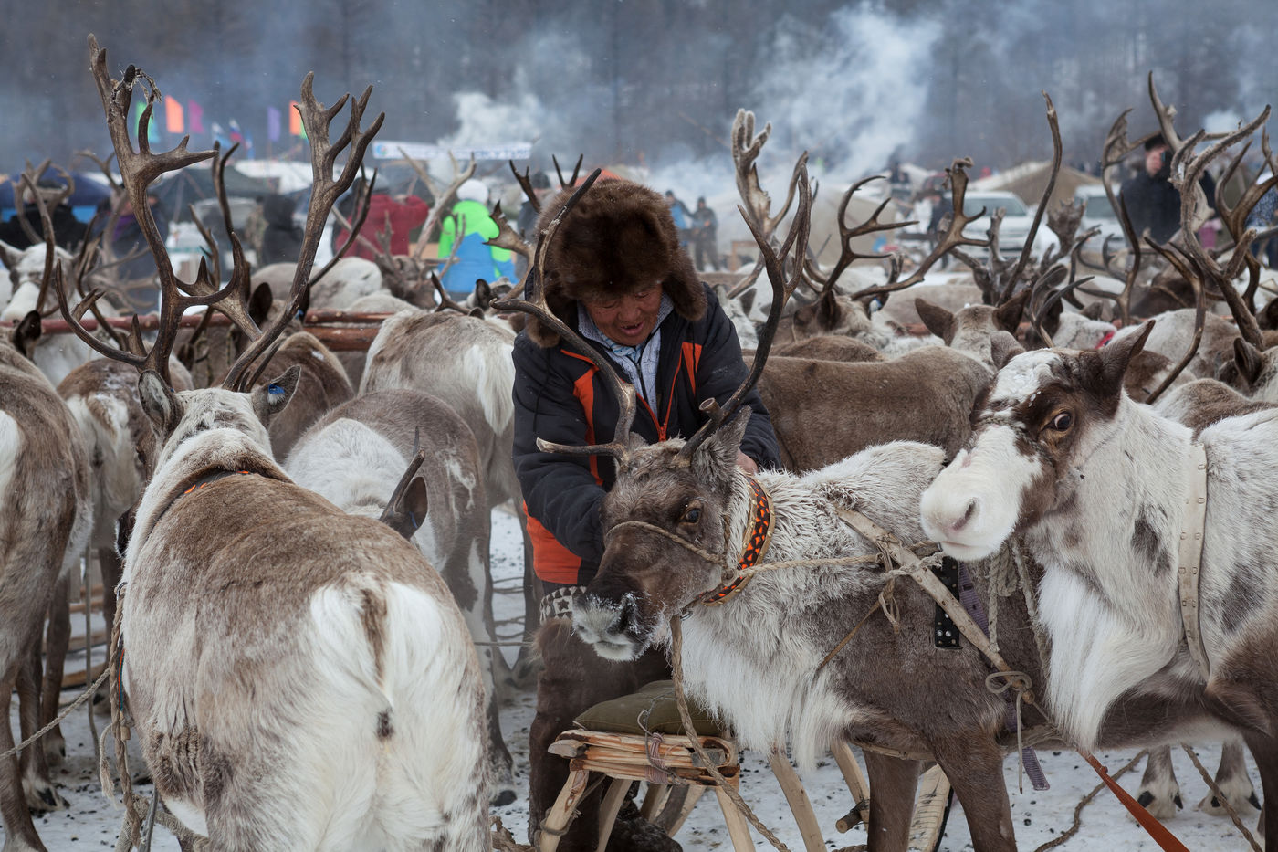 In March, on the frozen river from the village of Iengra, runs a unique event where barbecue, reindeer race and snowmobile ride bring together Russian and Evenk communities nearby. These peoples, with very different cultures, collide for a day and form a merry mix. The Evenk take care of their animals and prepare them for the competition, while the stands overloaded with meat and fish form gatherings where negotiations are swirling.