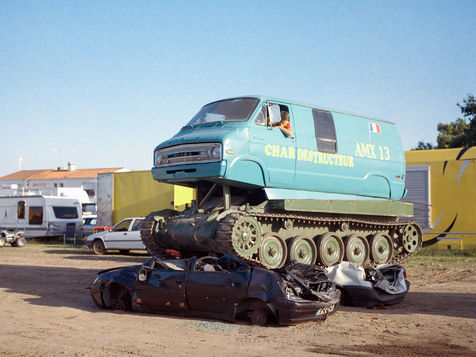 The Hell Drivers is a family affair. His wife, Carine, takes care of the refreshment bar. He and his cousin, Fredo, do the most technical stunts. Skidding, Truck Pulling, Two-Wheeler Balance... And, of course, the highlight of the show: Car wrecking. Their monster trucks even have little names, Big Foot and The American. Fredo's son, 16, learned to drive when he was a kid. Today, with a poker face, he rolls over on demand. He dashes down the ramp, gives a sharp turn and his car spins...one...two...three times before coming to a standstill. The assembly, which was holding its breath, can breathe again. As Helmout says: "It is by forging that one becomes a blacksmith".