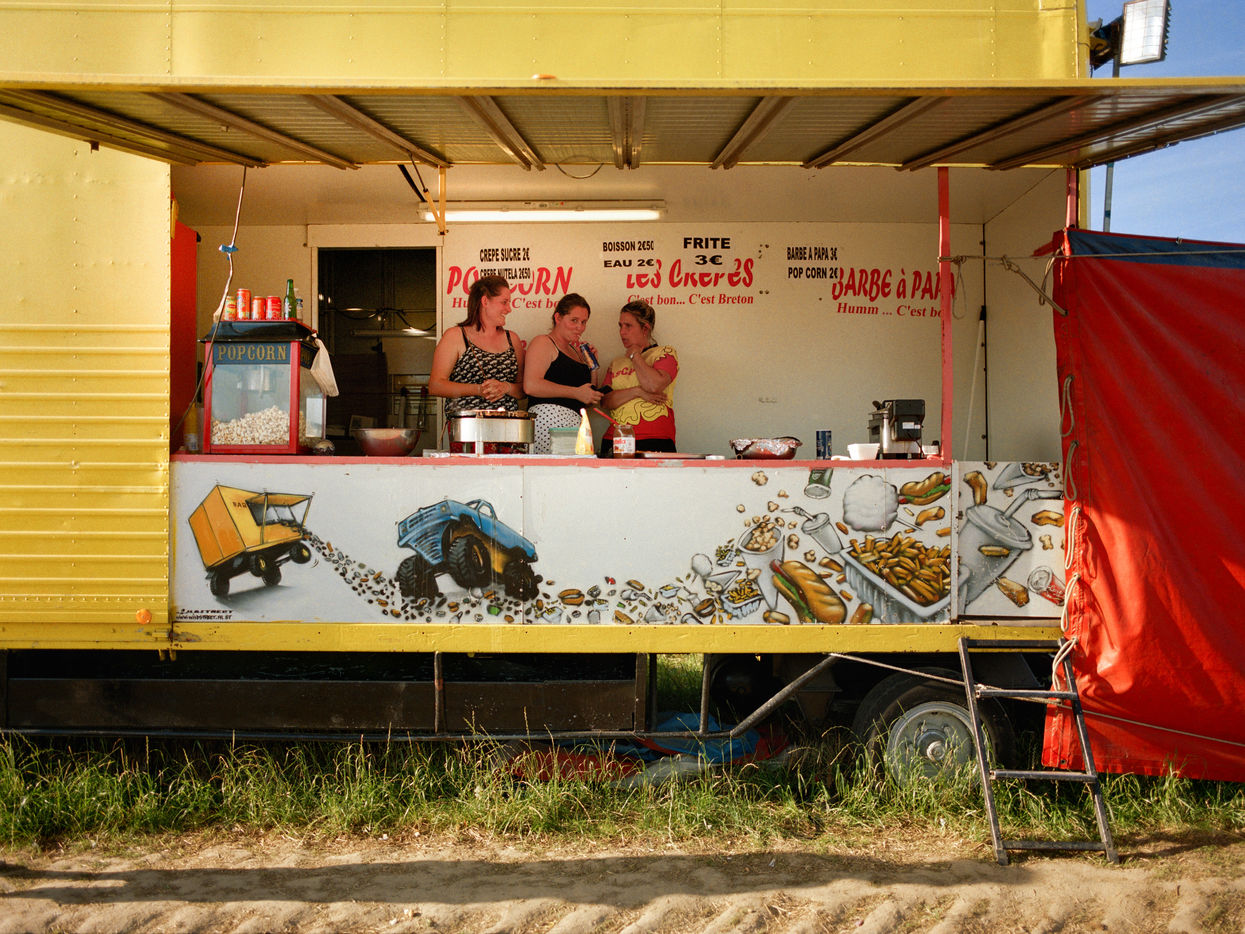 The brightly colored trailer has just opened its window. A flock of holidaymakers with young children with amazed eyes flock to get a ticket. Flattened car bodies litter the field around them.