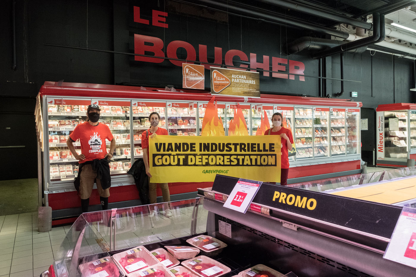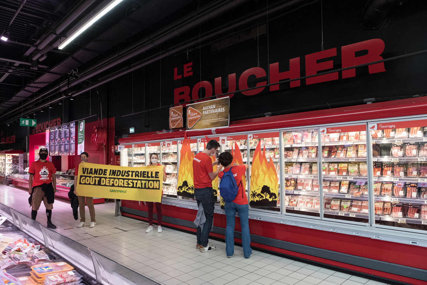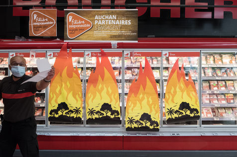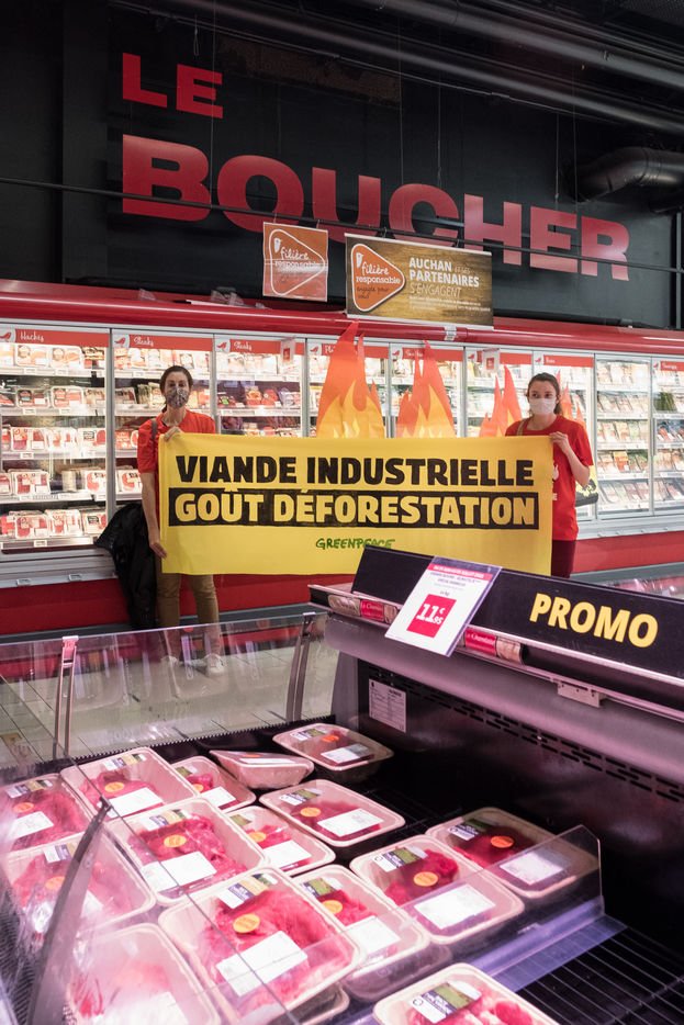Greenpeace action in an Auchan supermarket, July 3, 2021 in Saint-Herblain (44800), France. Six activists break into the supermarket to stick flame stickers on industrial meat showcases. Their goal: to denounce the massive importation of soybeans into France, responsible for deforestation in the Amazon, to feed industrial meat farms. Secondly, they inform and educate the public on a stand set up in the Chézine park. Passers-by are then invited to sign a petition. A barbecue held by two activists wearing masks of Emmanuel Macron and Jair Bolsonaro - President of Brazil - allows trees to be burnt.