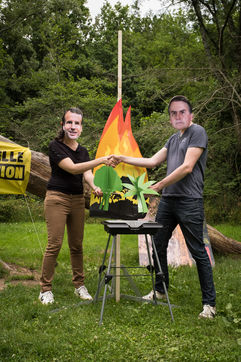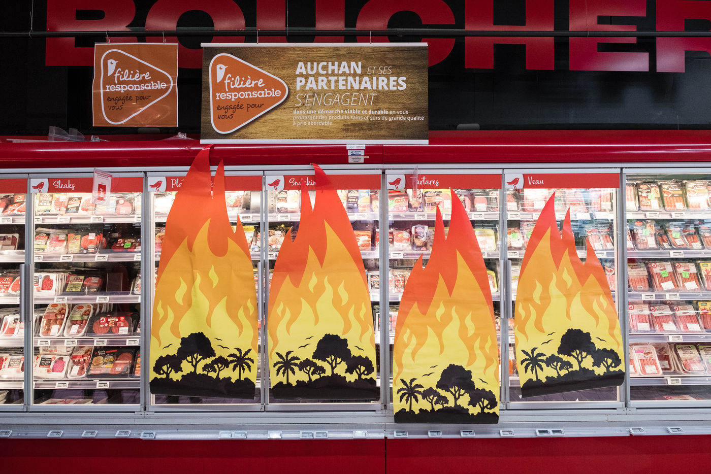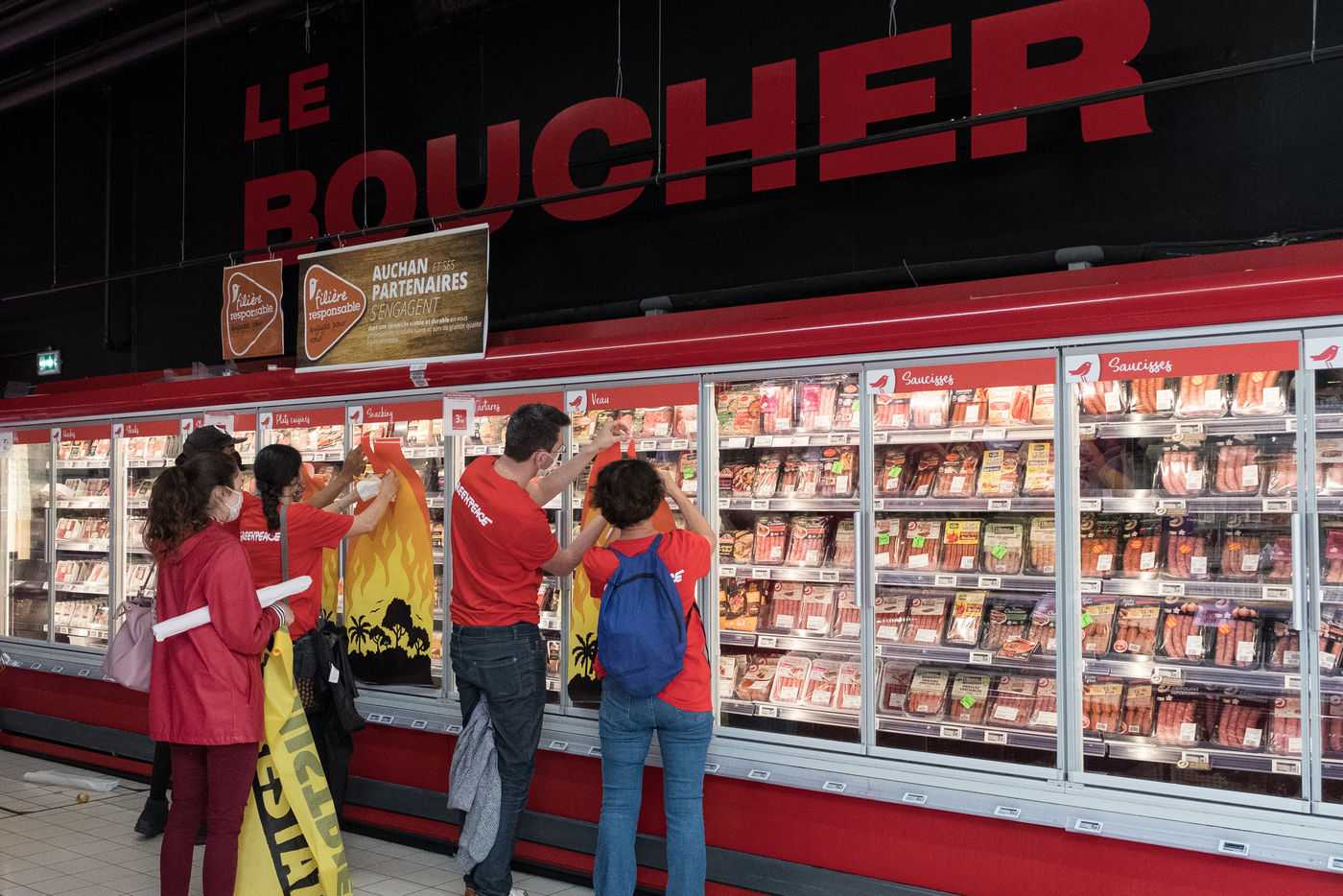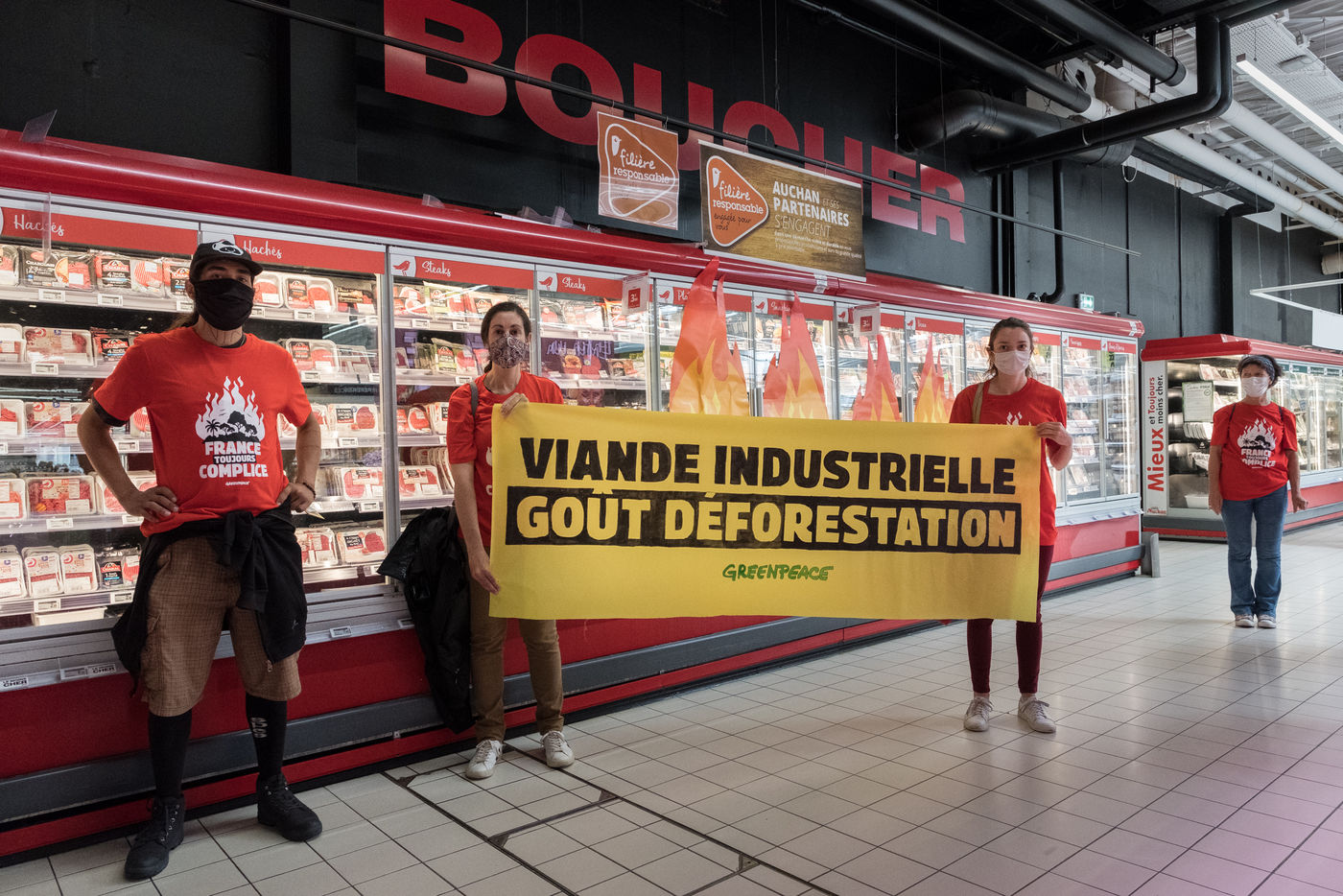 Greenpeace action in an Auchan supermarket, July 3, 2021 in Saint-Herblain (44800), France. Six activists break into the supermarket to stick flame stickers on industrial meat showcases. Their goal: to denounce the massive importation of soybeans into France, responsible for deforestation in the Amazon, to feed industrial meat farms. Secondly, they inform and educate the public on a stand set up in the Chézine park. Passers-by are then invited to sign a petition. A barbecue held by two activists wearing masks of Emmanuel Macron and Jair Bolsonaro - President of Brazil - allows trees to be burnt.