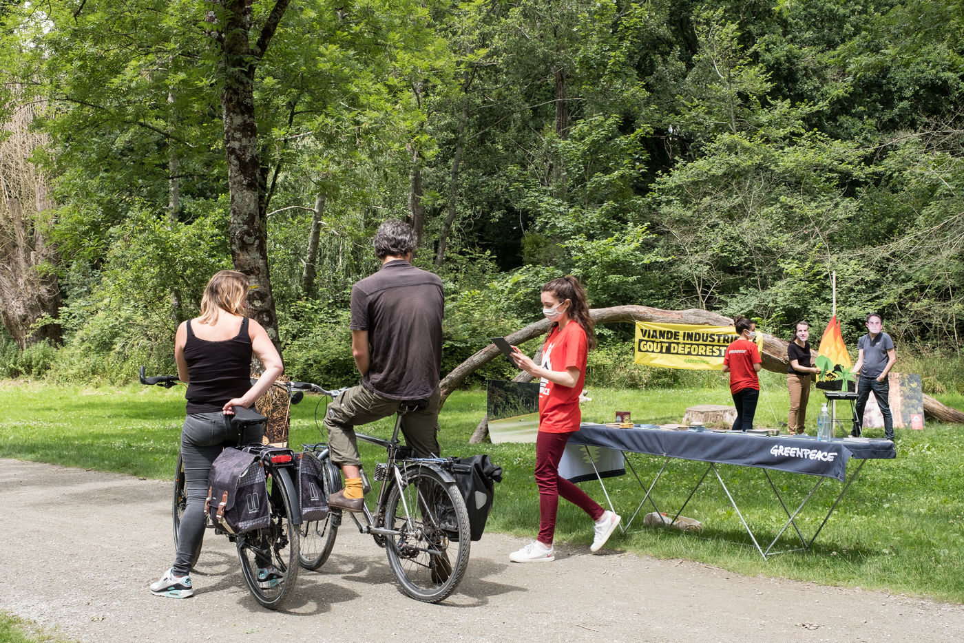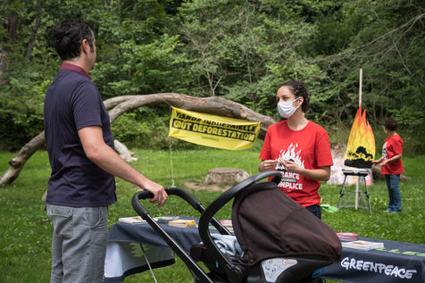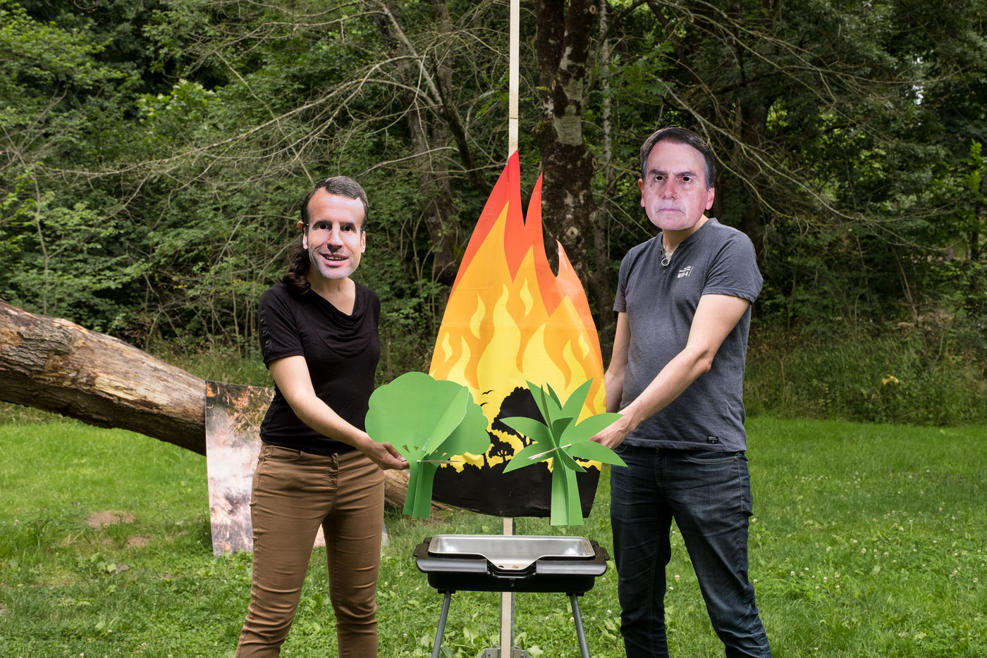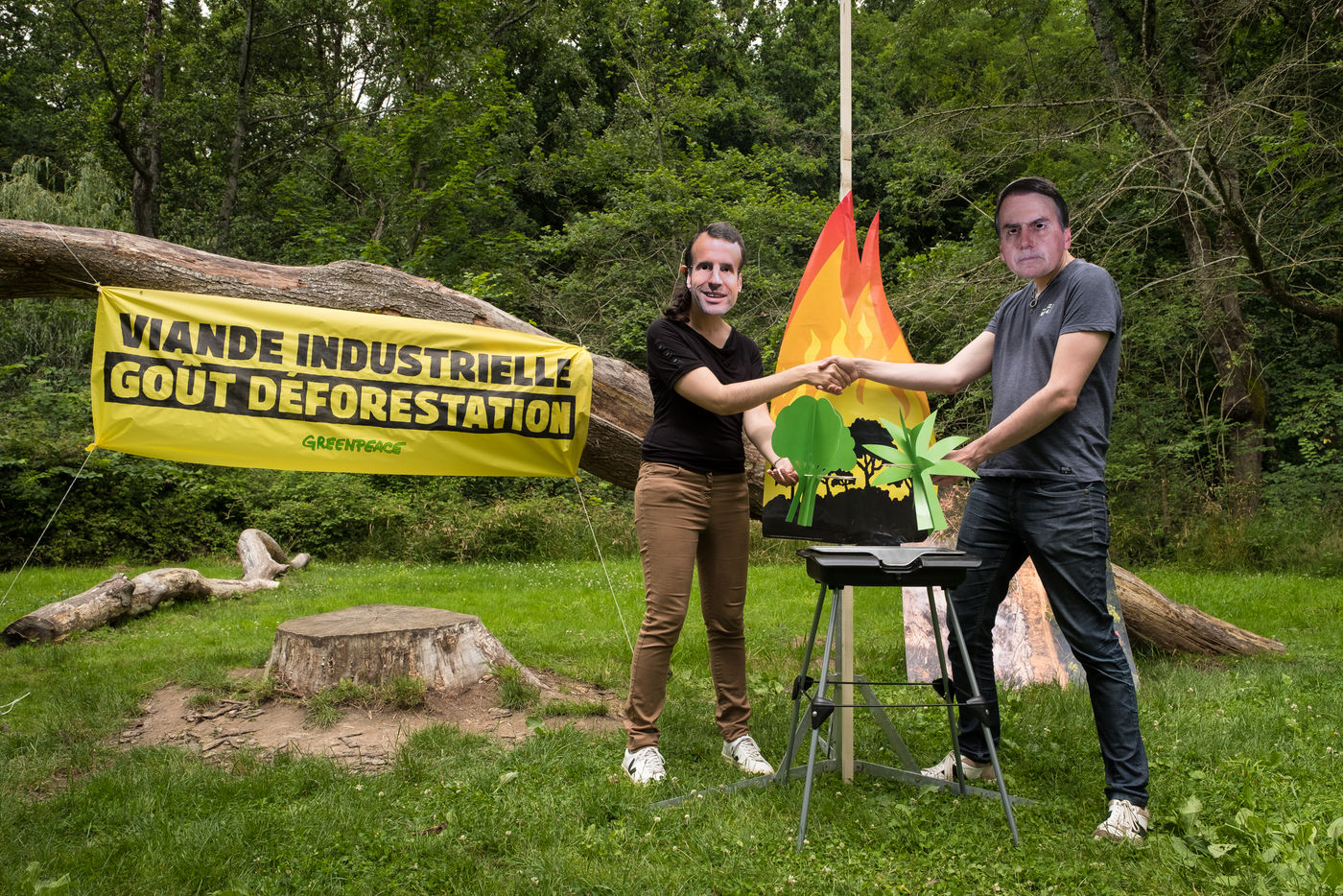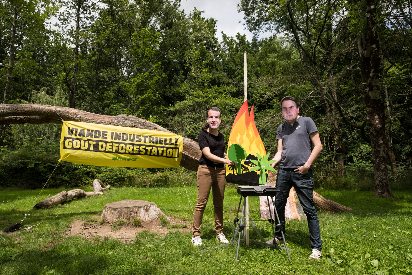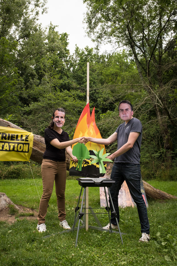 Action de Greenpeace dans un supermarché Auchan, le 3 juillet 2021 à Saint-Herblain (44800), en France . Six militants s'introduisent dans la grande surface pour coller des autocollants de flammes sur les vitrines de viande industrielle. Leur but: dénoncer l'importation massive de soja en France, responsable de la déforestation en Amazonie, pour nourrir les élevages de viande industrielle. Dans un second temps, ils informent et sensibilisent le public sur un stand installé dans le parc de la Chézine. Les passants sont ensuite invités à signer une pétition. Un barbecue tenu par deux militants portant des masques d'Emmanuel Macron et Jair Bolsonaro - président du Bresil - permet de faire brûler des arbres.