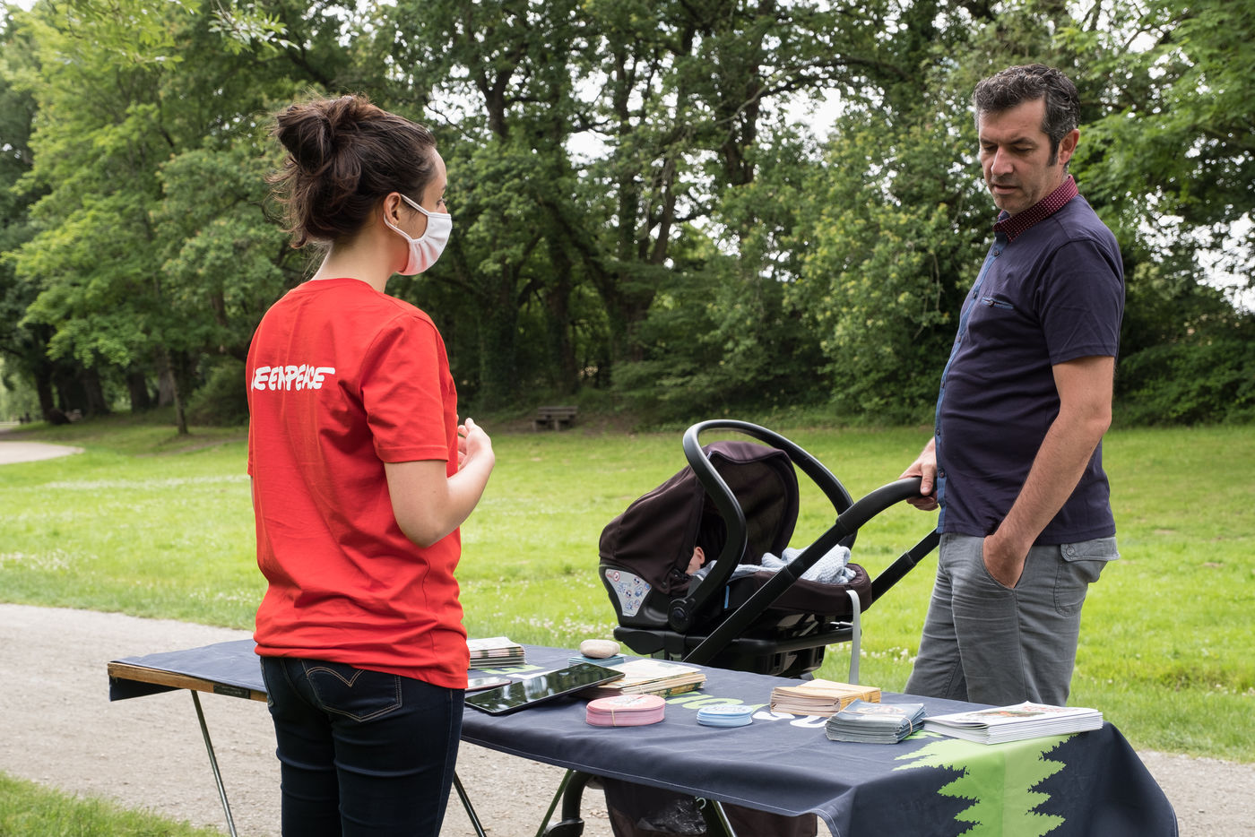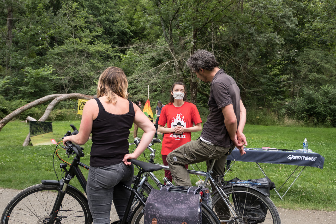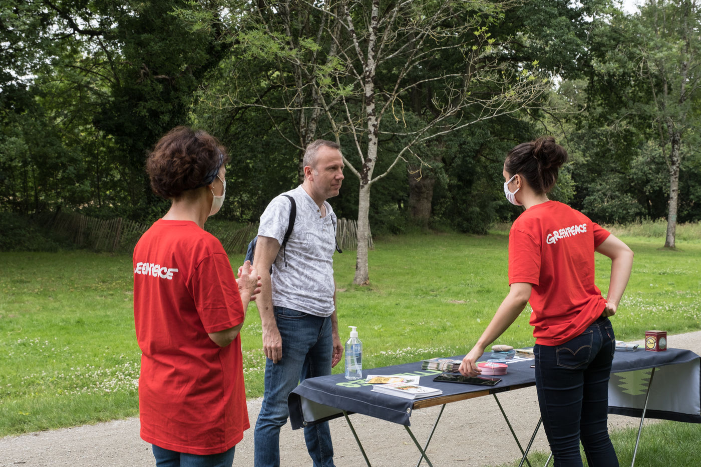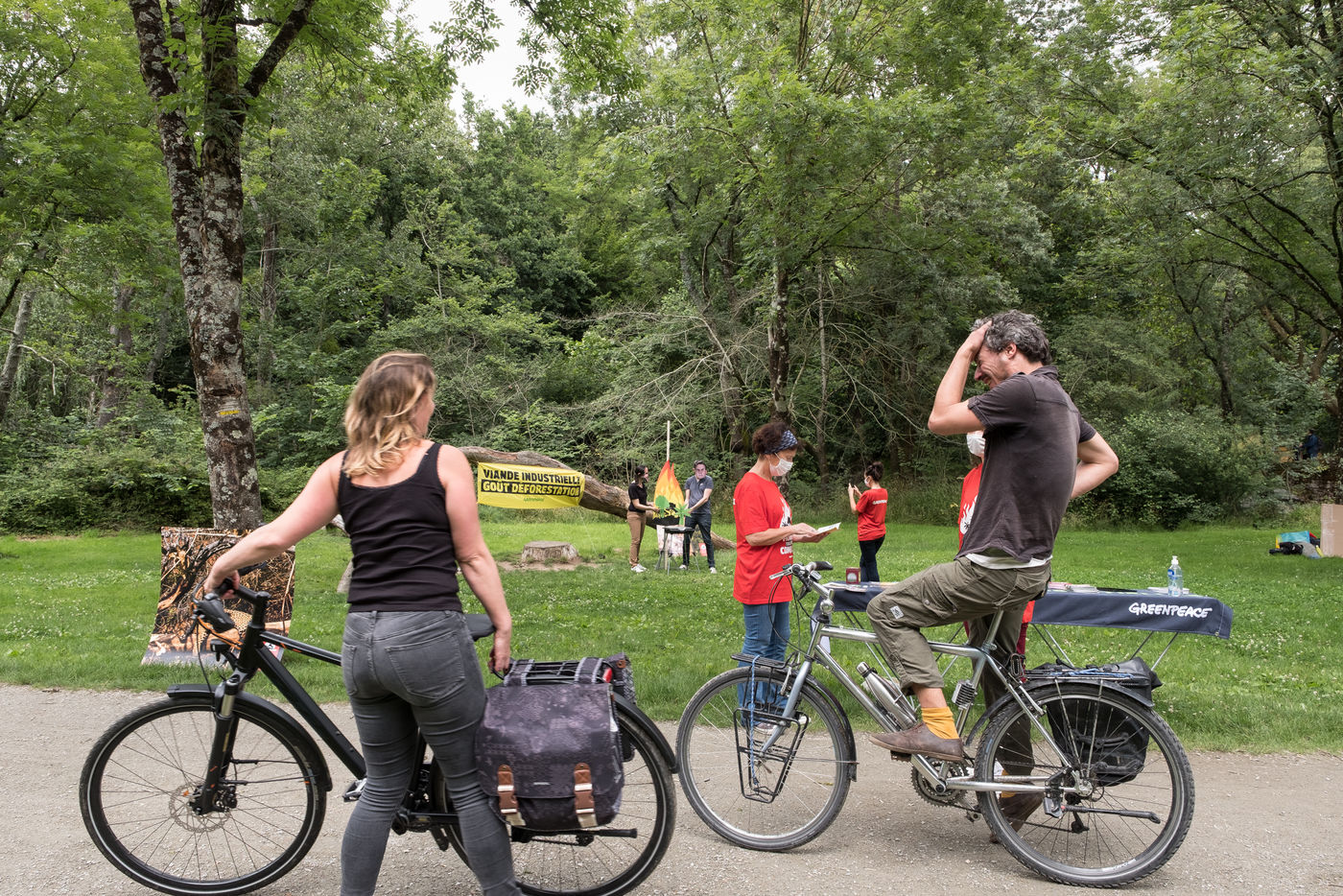 Action de Greenpeace dans un supermarché Auchan, le 3 juillet 2021 à Saint-Herblain (44800), en France . Six militants s'introduisent dans la grande surface pour coller des autocollants de flammes sur les vitrines de viande industrielle. Leur but: dénoncer l'importation massive de soja en France, responsable de la déforestation en Amazonie, pour nourrir les élevages de viande industrielle. Dans un second temps, ils informent et sensibilisent le public sur un stand installé dans le parc de la Chézine. Les passants sont ensuite invités à signer une pétition. Un barbecue tenu par deux militants portant des masques d'Emmanuel Macron et Jair Bolsonaro - président du Bresil - permet de faire brûler des arbres.