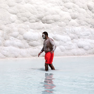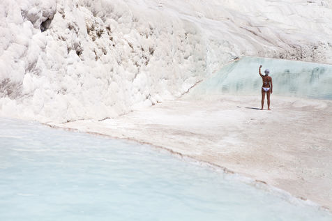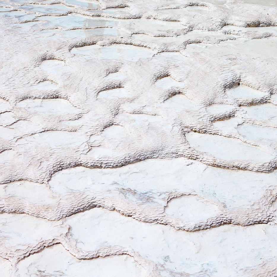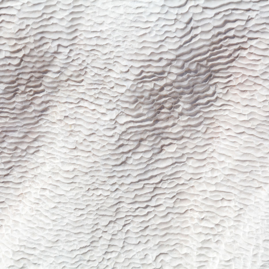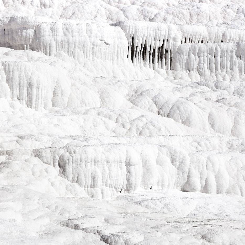 Méandres de calcaire, frissons opalins et dédales d'ivoire. Quelle virtuosité de la matière ! Chaque centimètre carré de cette avalanche de travertin est une ode à la texture. Et, comme des ovnis, des créatures bipèdes aux us et coutumes étranges se promènent sur ces formations de minerai.