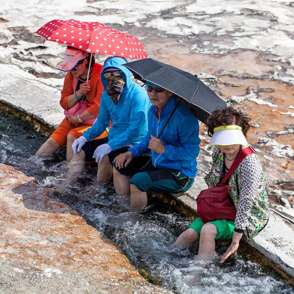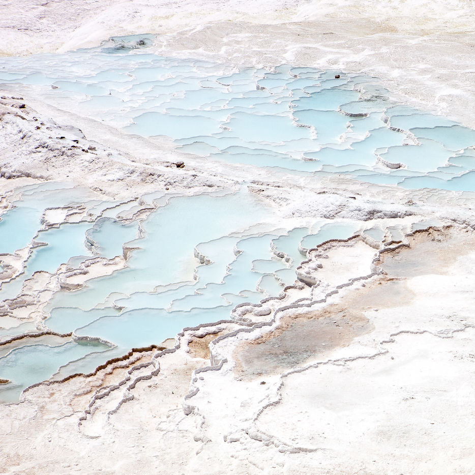 Meanders of limestone, opaline chills and mazes of ivory. What virtuosity of matter! Every square centimeter of this avalanche of travertine is an ode to the texture. And, like aliens, bipedal creatures with strange customs walks on these ore formations.