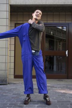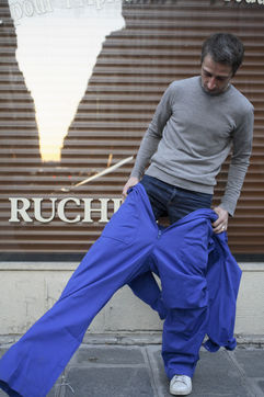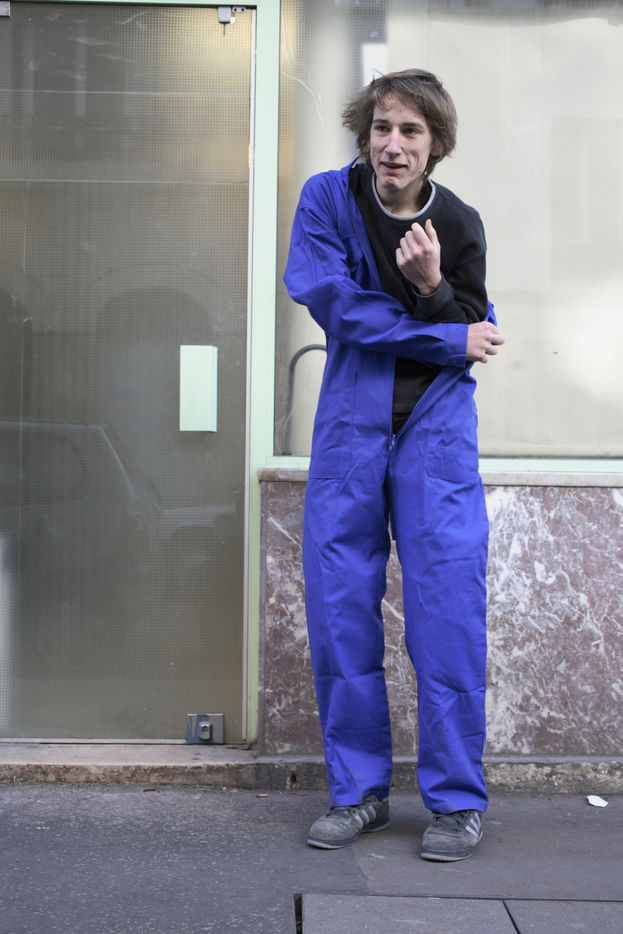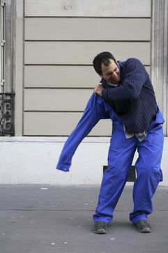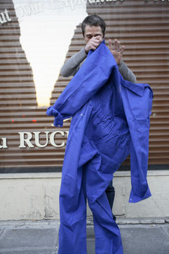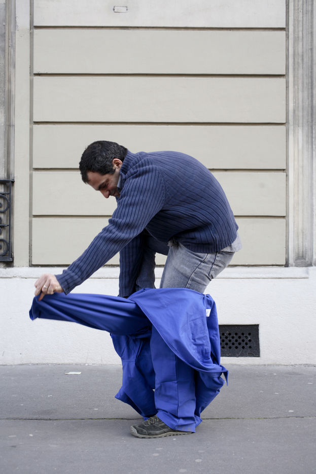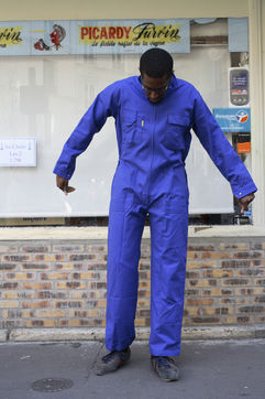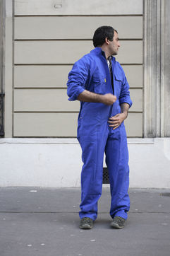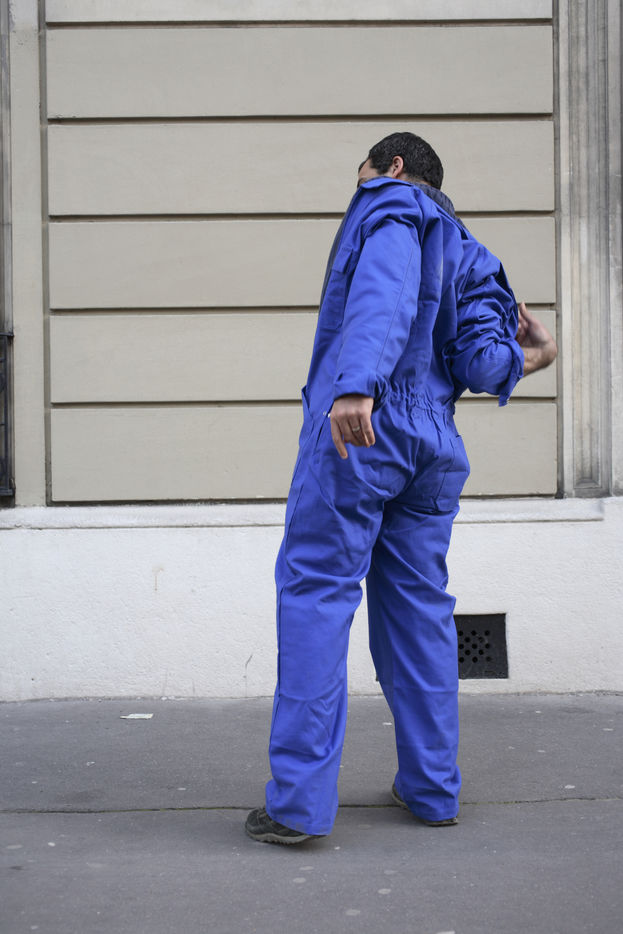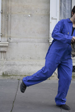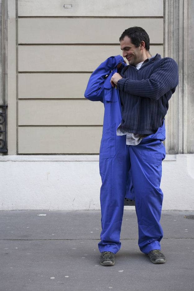 J'ai demandé à des inconnus dans la rue d'enfiler un BLEU DE TRAVAIL. La plupart n'en avait jamais porté. Si ce vêtement prend tout le corps, il ne s'agissait pas pour autant d'endosser la FONCTION et de jouer à l'ouvrier, mais plutôt de se prêter à un exercice CHORÉGRAPHIQUE. Ce travail réalisé pour l'illustration d'un article du journaliste Nicolas KSSIS pour le mensuel Regards, paru en avril 2007.