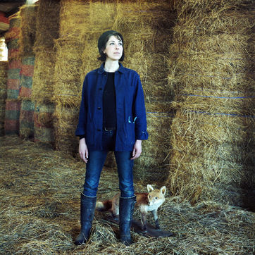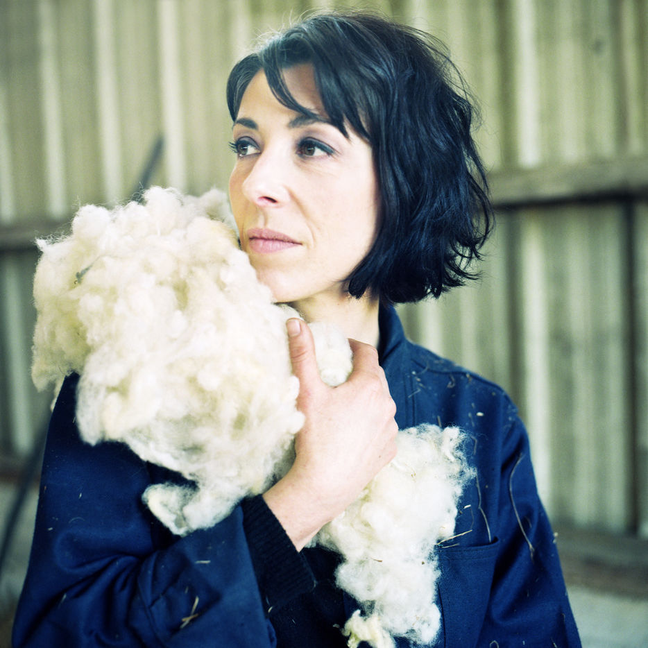 Stephanie Maube, ancienne graphiste a Levallois-Perret, Stéphanie est devenue eleveuse d'agneaux et de mouton. Ici elle pose avec sa laine de mouton sur l'epaule, dans sa bergerie a Saint-Germain-sur-Ay (Manche) en fevrier 2019.