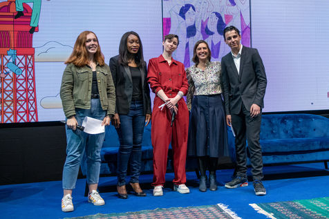 Une remise de prix en presence de Mathilde Serrell, Maitresse de ceremonie, un.e elu.e de la Région Ile-de-France et les 8 auteurs-laureats.