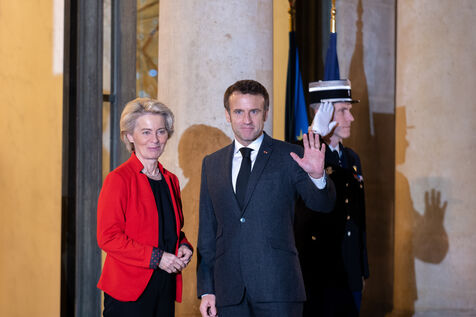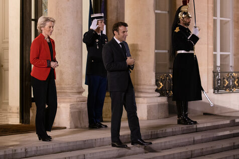 Reception par Emmanuel Macron d'Ursula Von der Leyen et de Jonas Gahr Store à l'Elysée pour un diner de travail précedant la conférence Solidaires du peuple ukrainien.