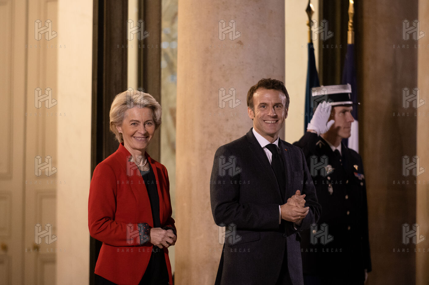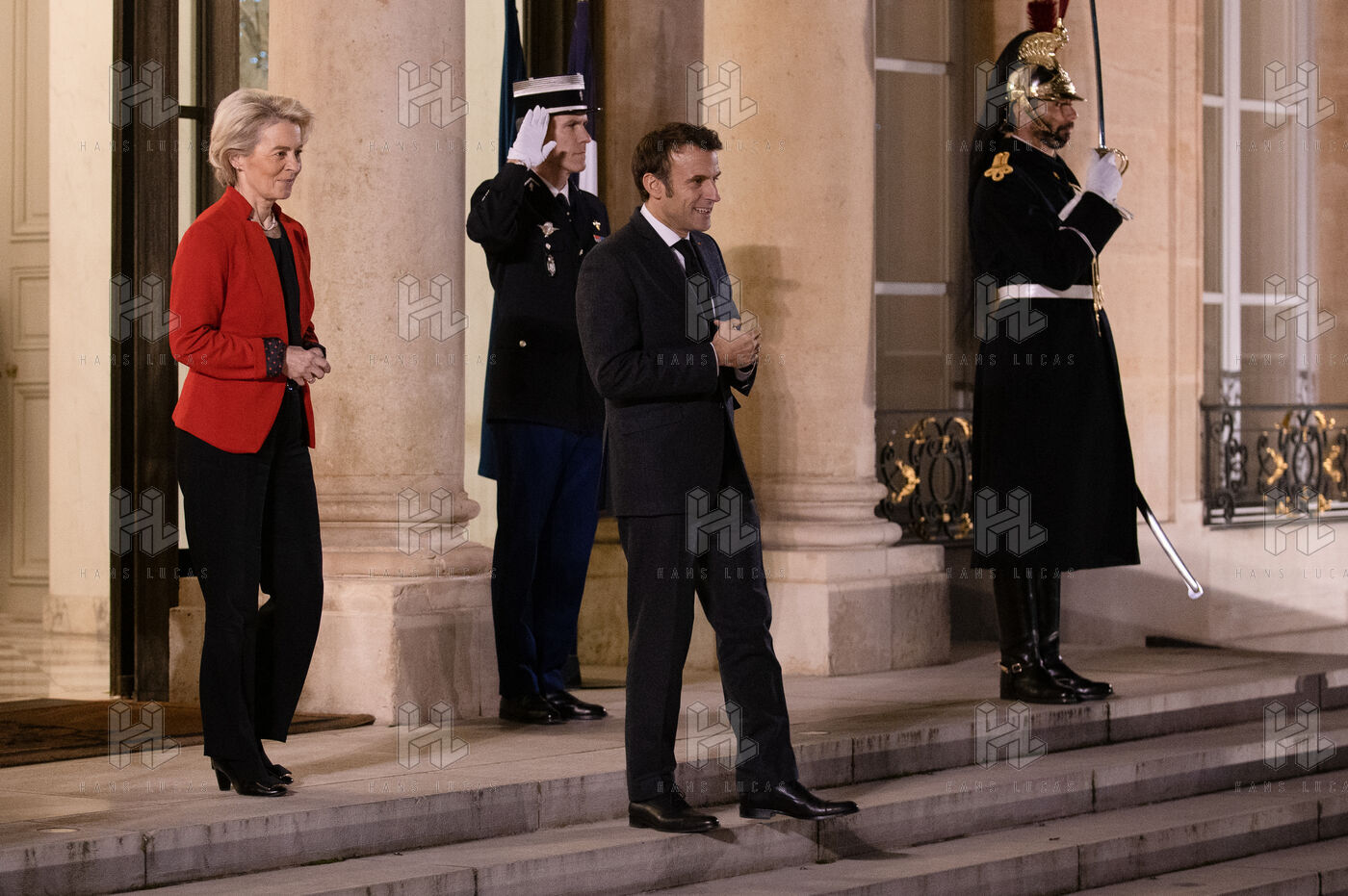 Reception by Emmanuel Macron of Ursula Von der Leyen and Jonas Gahr Store at the Elysée for a working dinner prior to the Ukrainian People's Solidarity Conference.
