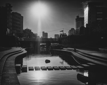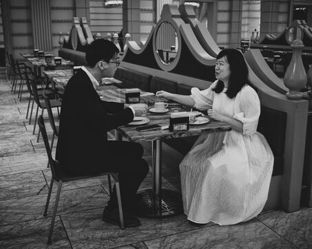 The morning light stretches over Taichung, gliding across facades, catching on the glass of buildings before dissolving into the cool air. At a café table, a couple in wedding attire savors breakfast, their movements measured, their silhouettes frozen in an almost unreal elegance. The whiteness of the dress contrasts with the table, with the still-sleeping city, with the long shadows slipping over the asphalt.
