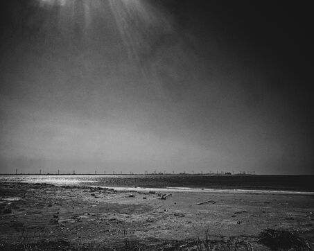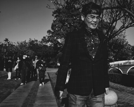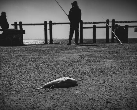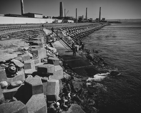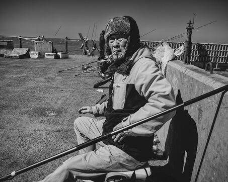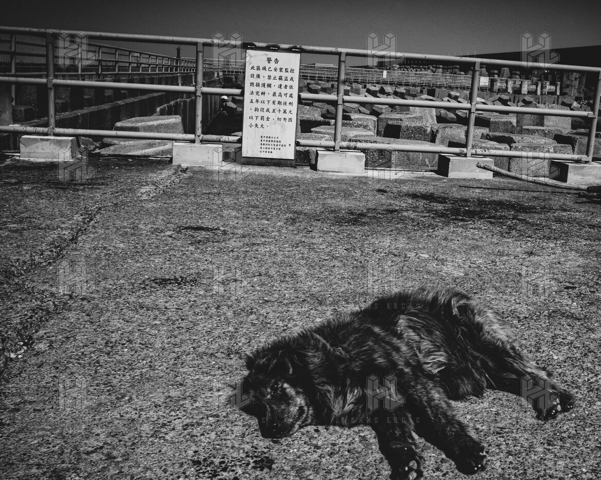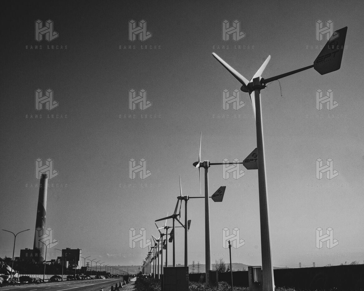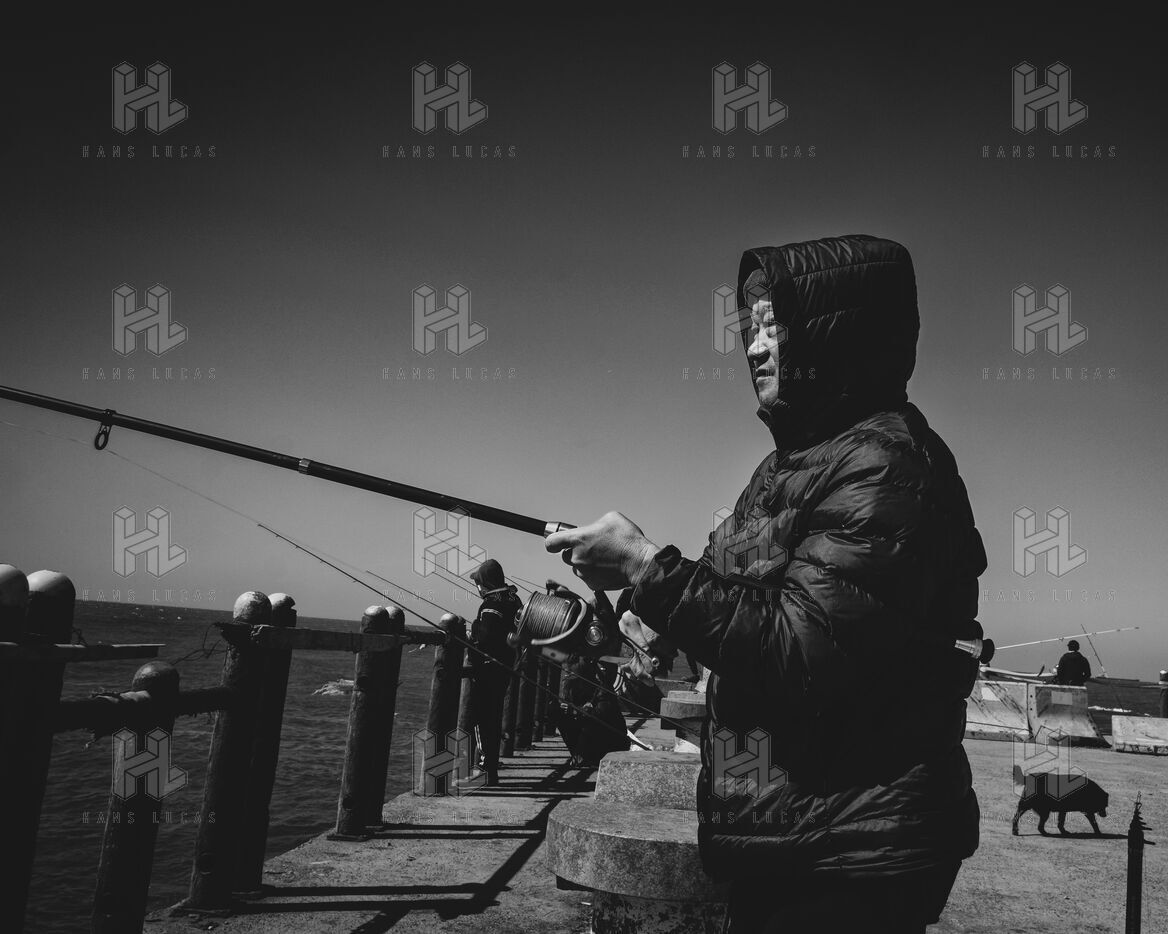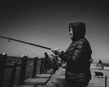 In Longjing, fishermen gather near the outflow of the thermal power plant. The wind lashes their faces, churning short, restless waves. Their fishing rods bend under the gusts, lines carving taut arcs in the air. Stray dogs sleep on the ground, indifferent to the commotion. Further away, wind turbines turn, massive and unshaken, their arms reaching into the vast grey sky.