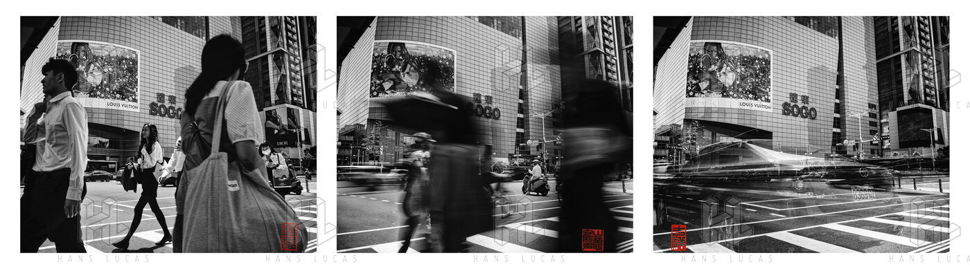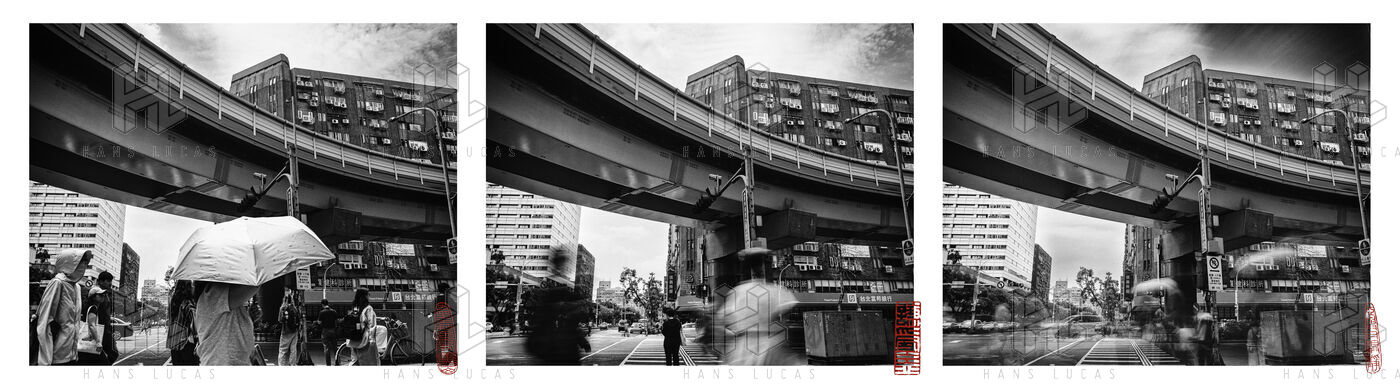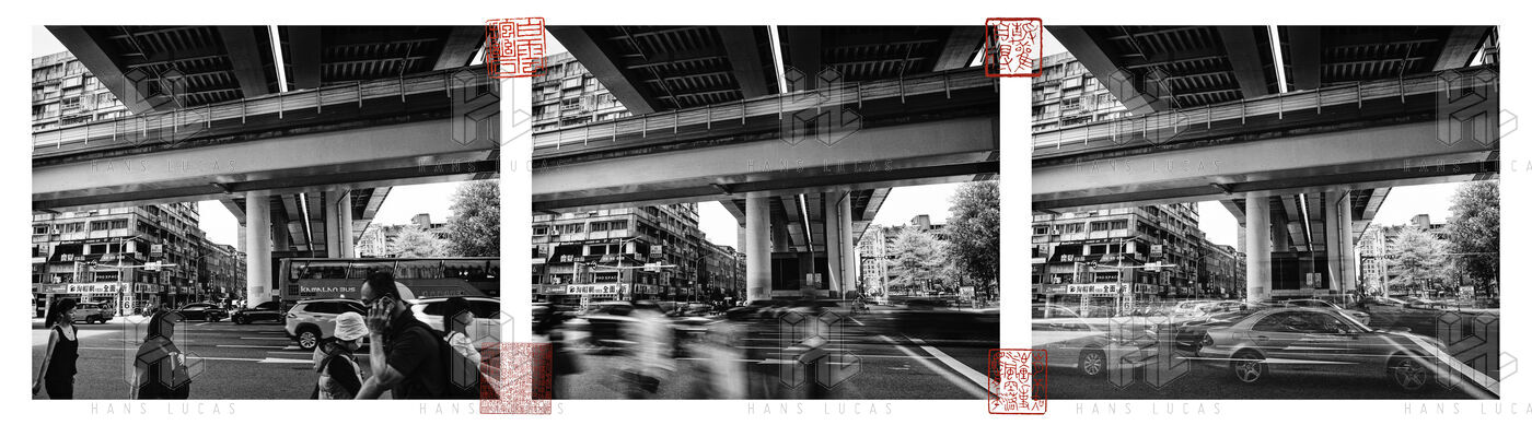 Triptych on Fuxing Boulevard. The hum of engines, the back-and-forth of pedestrians drawn to the shop windows, and above it all, gliding like a thought in transit, the Wenhu line slips past the Zhongxiao intersection, indifferent to the chaos below.
